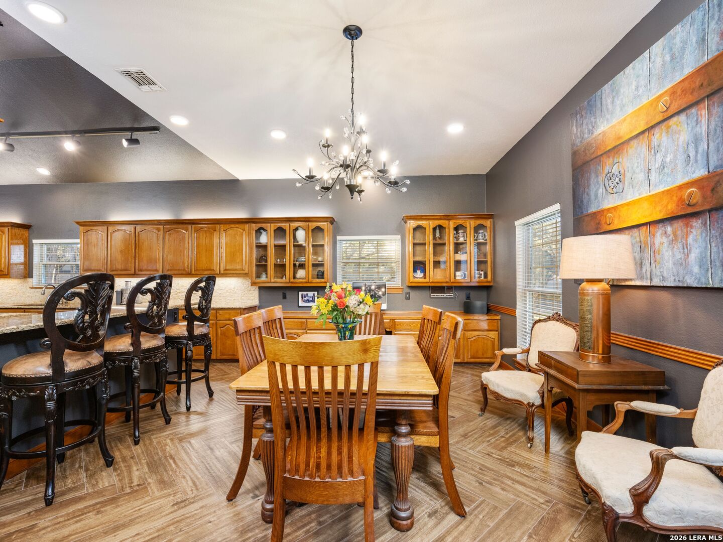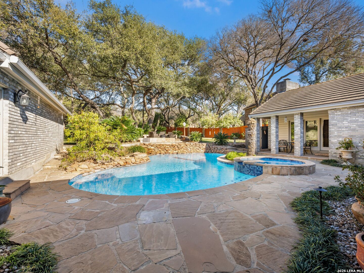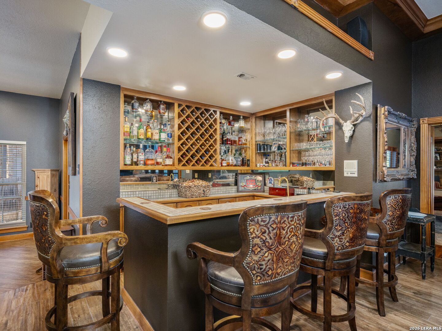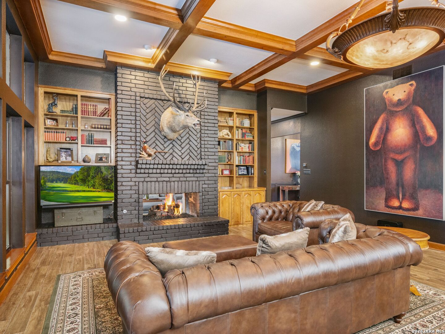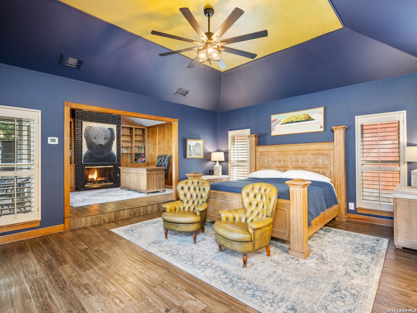 A rare find in coveted Bluffview Estates, this single-story residence delivers the space, layout, and amenities buyers search for-wrapped in a prime, treelined location. Thoughtfully updated and impeccably styled, the 4 bedroom, 4.5 bath home blends comfort with refined character. Inside, the design leans into a warm, moody dark academia aesthetic inspired by classic Ralph Lauren interiors. Metal infused paints in rich iron and copper tones create depth and sophistication, while abundant skylights and soaring ceilings flood the home with natural light. Multiple living and dining areas offer exceptional flexibility for everyday living and effortless entertaining.The family room features a full wet bar and a striking two-sided fireplace that anchors the main gathering spaces. The kitchen includes stainless steel appliances, generous counter space, ample storage, and options for both casual and formal dining. The spacious primary suite serves as a private retreat, complete with dual closets and an adjoining office featuring a brick fireplace and direct access to the backyard-ideal for working from home or unwinding in peace. All bathrooms, including the primary and secondary suites, have been tastefully updated with high quality tile selections and distinctive metallic mirrored stone accents. A large billiards room connects seamlessly to the family room and outdoor living area, creating an ideal setting for movie nights, hobbies, or play. Step outside to a true backyard oasis: mature trees, outdoor speakers, a wide covered patio, and a beautiful pool and spa designed for year round enjoyment. A Mosquito Nix system ensures comfort during summer gatherings or quiet evenings outdoors. The oversized three car garage with epoxy flooring and a circular drive provides abundant parking and storage. Recent improvements include new KitchenAid appliances in the kitchen, a refreshed roof with replaced tiles, new skylights, updated attic vents, and fully resealed flashing. The home features all tile flooring after removing carpet, along with gel stained wood trim and doors for a clean, updated look. Lighting has been modernized with LED upgrades, dimmer switches, and new wall plate covers, complemented by upgraded ceiling fans. The garage now showcases a carbon epoxy floor and a black finished ceiling. Outdoors, the property benefits from a new high efficiency sprinkler system, new sod in both front and back yards, updated landscaping, and added dramatic landscape lighting. Major system upgrades include a new Lennox main HVAC unit. Interior spaces have been refreshed with designer paint, and the billiards, hall, and bedroom bathrooms have all been updated. The improvements are rounded out with a newly replaced cedar fence. This is an exceptional home that must be experienced in person to fully appreciate-an opportunity that rarely comes available in Bluffview Estates!