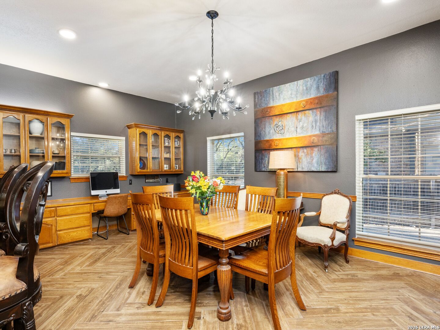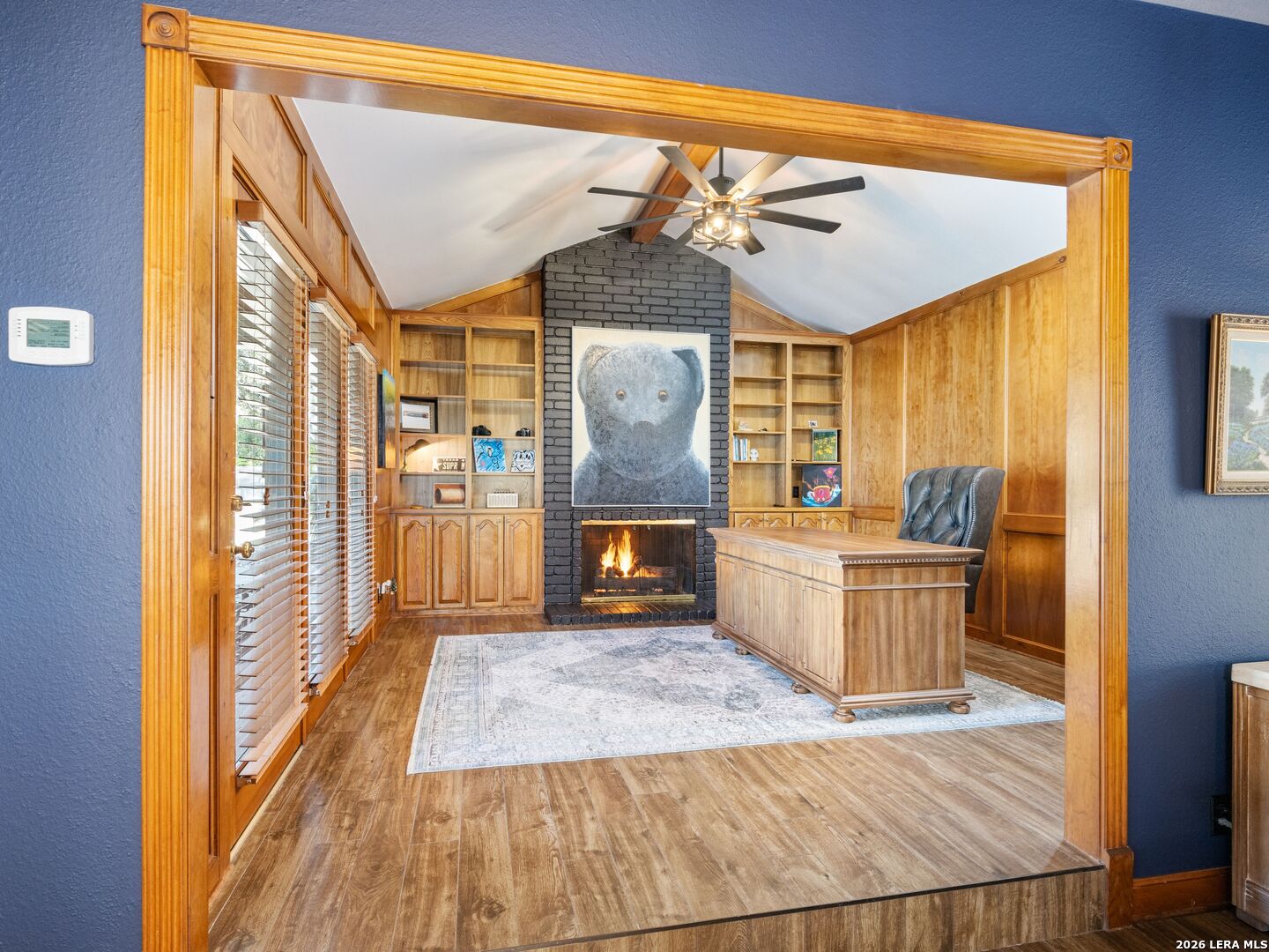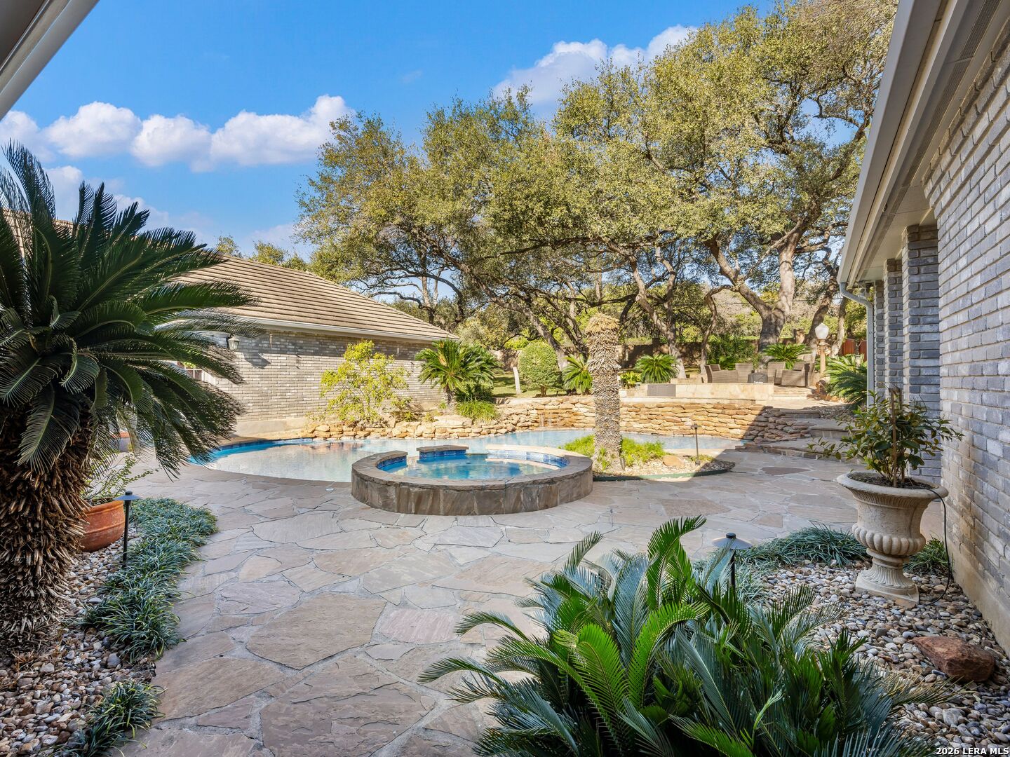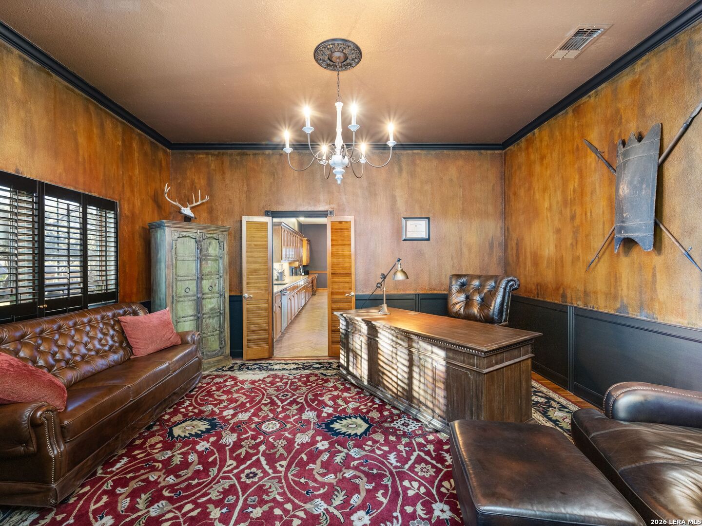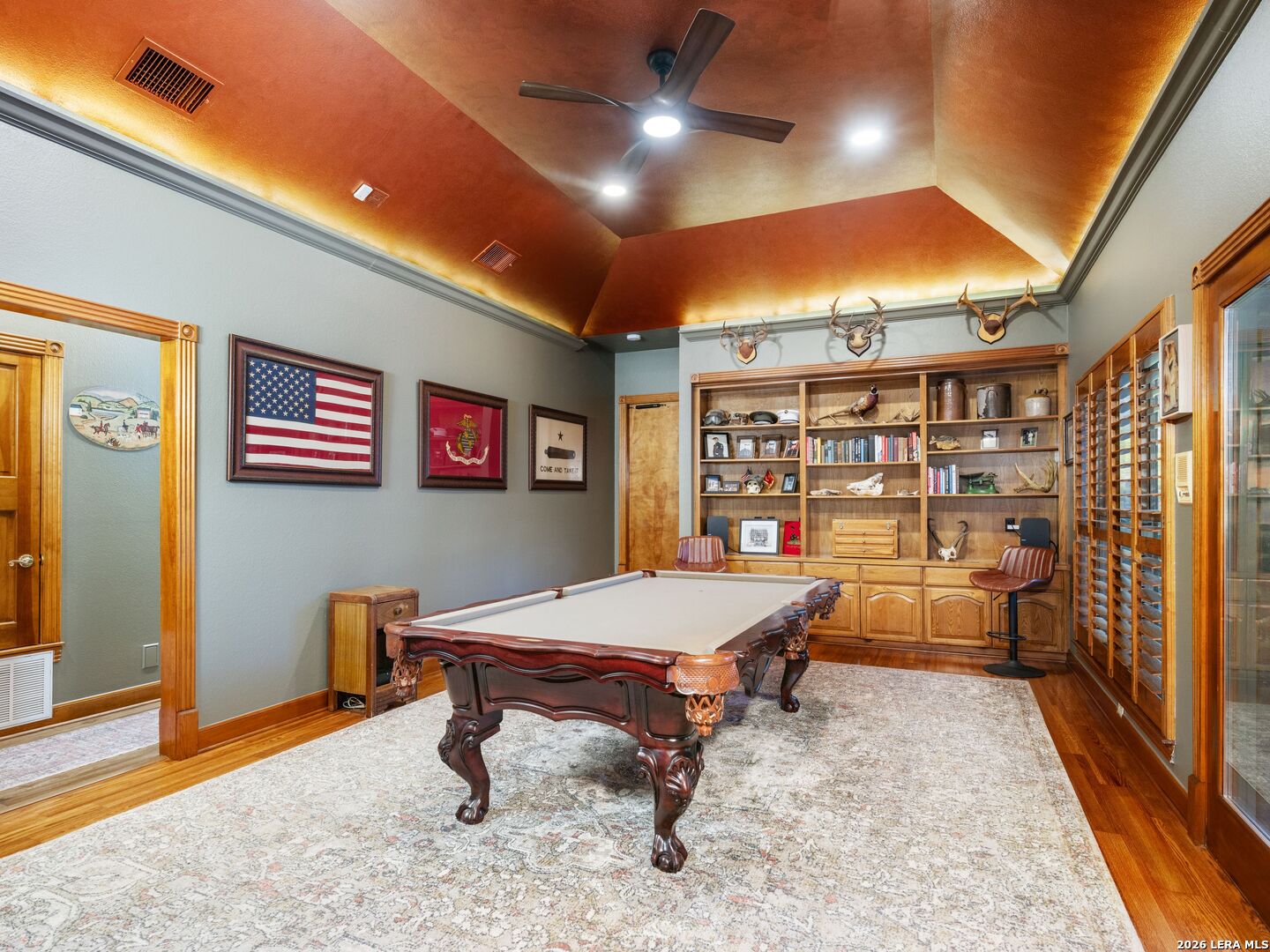 A rare find in coveted Bluffview Estates, this single-story residence delivers the space, layout, and amenities buyers search for-wrapped in a prime, treelined location. Thoughtfully updated and impeccably styled, the 4 bedroom, 4.5 bath home blends comfort with refined character. Inside, the design leans into a warm, moody dark academia aesthetic inspired by classic Ralph Lauren interiors. Metal infused paints in rich iron and copper tones create depth and sophistication, while abundant skylights and soaring ceilings flood the home with natural light. Multiple living and dining areas offer exceptional flexibility for everyday living and effortless entertaining.The family room features a full wet bar and a striking two-sided fireplace that anchors the main gathering spaces. The kitchen includes stainless steel appliances, generous counter space, ample storage, and options for both casual and formal dining. The spacious primary suite serves as a private retreat, complete with dual closets and an adjoining office featuring a brick fireplace and direct access to the backyard-ideal for working from home or unwinding in peace. All bathrooms, including the primary and secondary suites, have been tastefully updated with high quality tile selections and distinctive metallic mirrored stone accents. A large billiards room connects seamlessly to the family room and outdoor living area, creating an ideal setting for movie nights, hobbies, or play. Step outside to a true backyard oasis: mature trees, outdoor speakers, a wide covered patio, and a beautiful pool and spa designed for year round enjoyment. A Mosquito Nix system ensures comfort during summer gatherings or quiet evenings outdoors. The oversized three car garage with epoxy flooring and a circular drive provides abundant parking and storage. Recent improvements include new KitchenAid appliances in the kitchen, a refreshed roof with replaced tiles, new skylights, updated attic vents, and fully resealed flashing. The home features all tile flooring after removing carpet, along with gel stained wood trim and doors for a clean, updated look. Lighting has been modernized with LED upgrades, dimmer switches, and new wall plate covers, complemented by upgraded ceiling fans. The garage now showcases a carbon epoxy floor and a black finished ceiling. Outdoors, the property benefits from a new high efficiency sprinkler system, new sod in both front and back yards, updated landscaping, and added dramatic landscape lighting. Major system upgrades include a new Lennox main HVAC unit. Interior spaces have been refreshed with designer paint, and the billiards, hall, and bedroom bathrooms have all been updated. The improvements are rounded out with a newly replaced cedar fence. This is an exceptional home that must be experienced in person to fully appreciate-an opportunity that rarely comes available in Bluffview Estates!