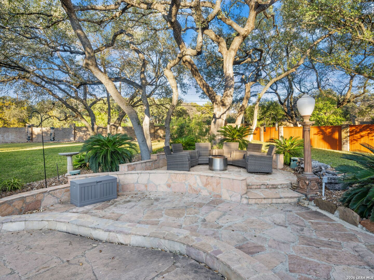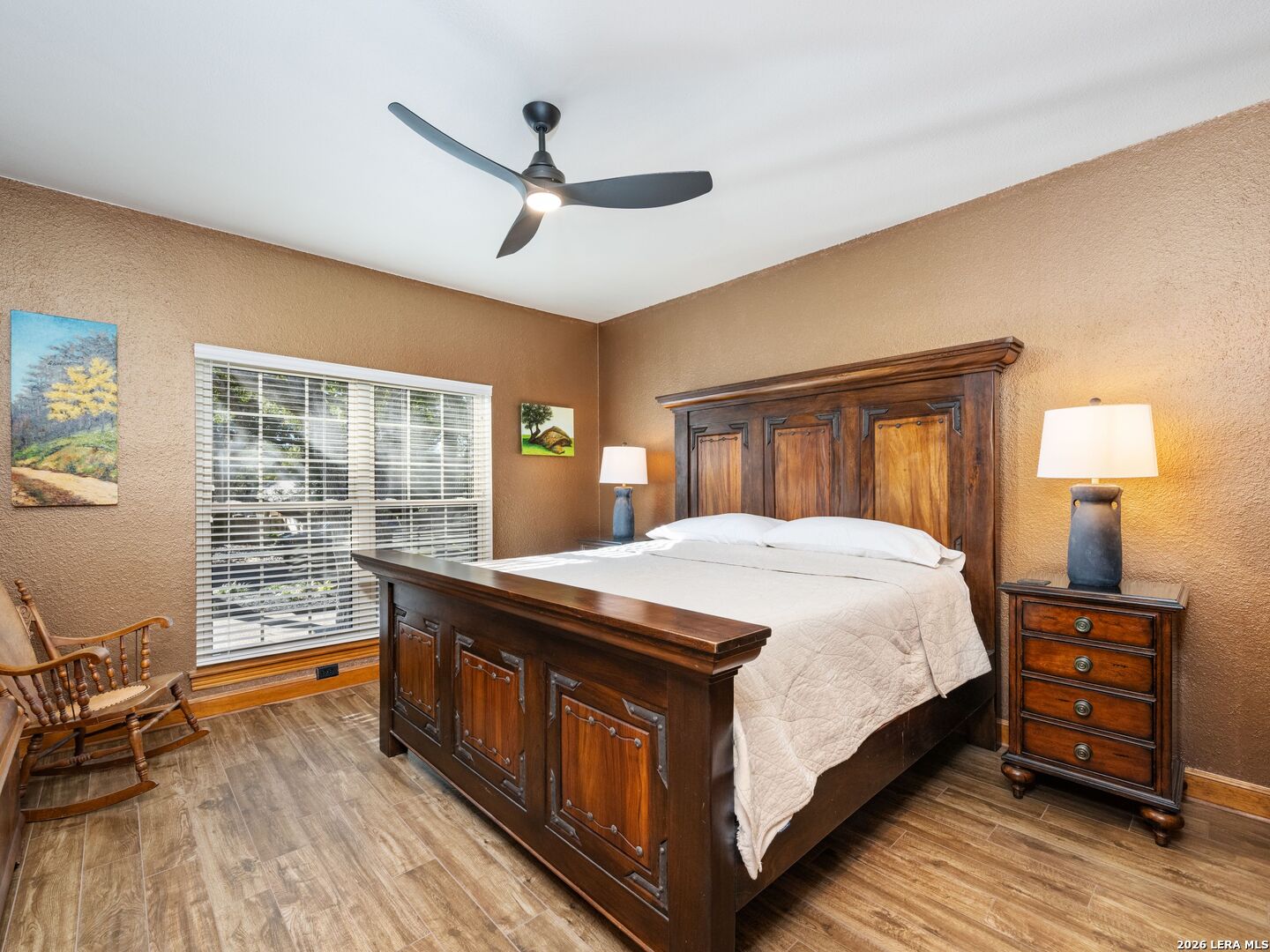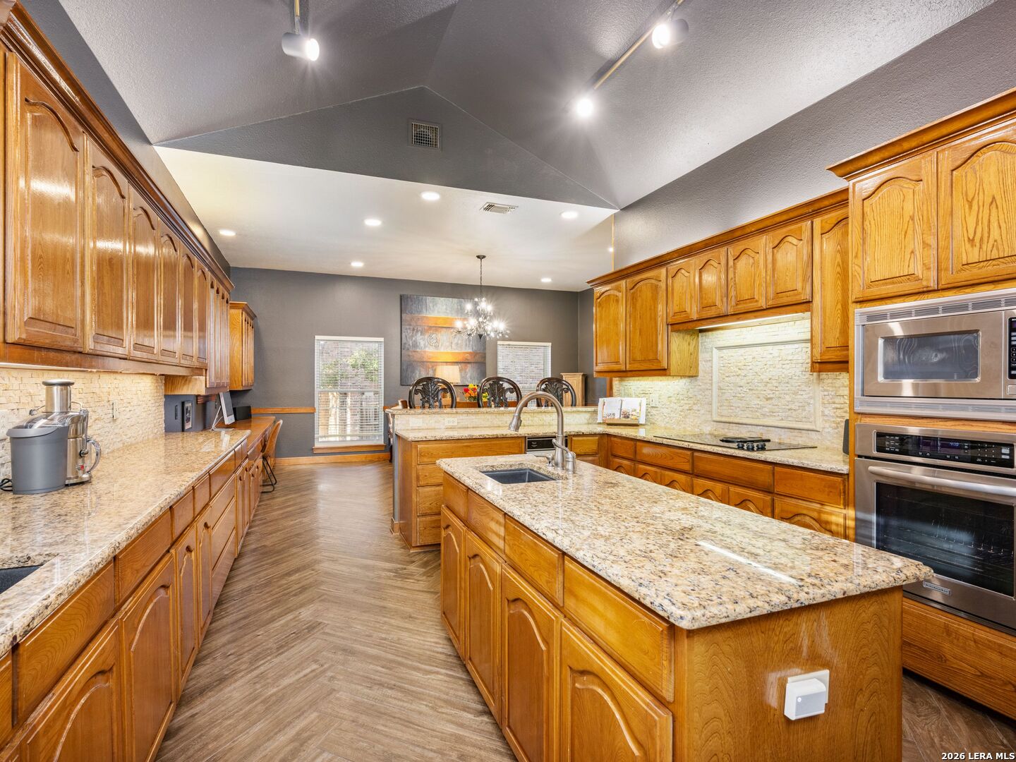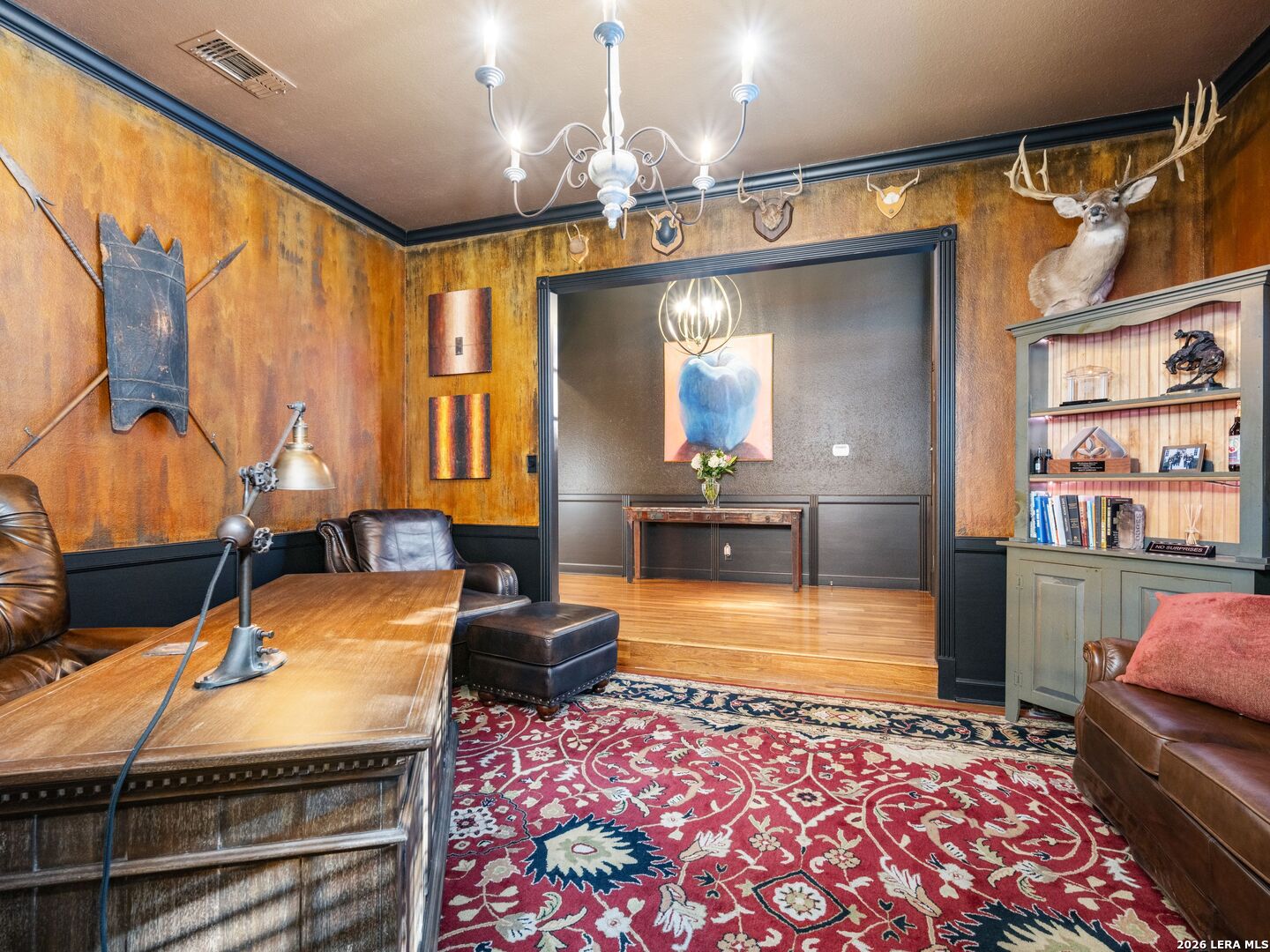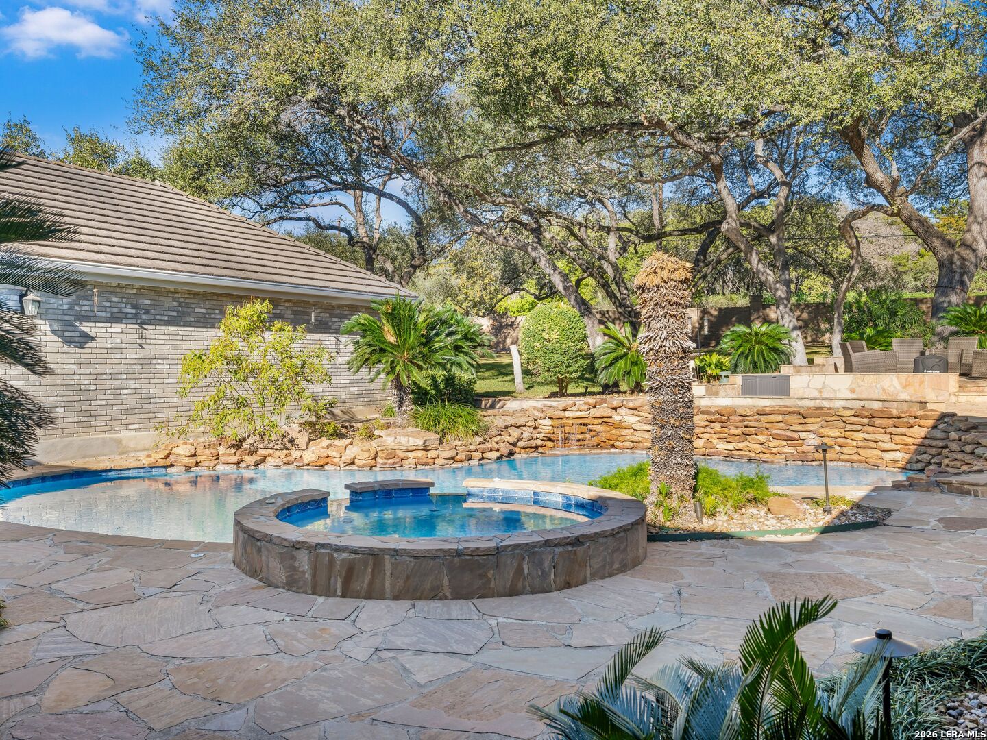 A rare find in coveted Bluffview Estates, this single-story residence delivers the space, layout, and amenities buyers search for-wrapped in a prime, treelined location. Thoughtfully updated and impeccably styled, the 4 bedroom, 4.5 bath home blends comfort with refined character. Inside, the design leans into a warm, moody dark academia aesthetic inspired by classic Ralph Lauren interiors. Metal infused paints in rich iron and copper tones create depth and sophistication, while abundant skylights and soaring ceilings flood the home with natural light. Multiple living and dining areas offer exceptional flexibility for everyday living and effortless entertaining.The family room features a full wet bar and a striking two-sided fireplace that anchors the main gathering spaces. The kitchen includes stainless steel appliances, generous counter space, ample storage, and options for both casual and formal dining. The spacious primary suite serves as a private retreat, complete with dual closets and an adjoining office featuring a brick fireplace and direct access to the backyard-ideal for working from home or unwinding in peace. All bathrooms, including the primary and secondary suites, have been tastefully updated with high quality tile selections and distinctive metallic mirrored stone accents. A large billiards room connects seamlessly to the family room and outdoor living area, creating an ideal setting for movie nights, hobbies, or play. Step outside to a true backyard oasis: mature trees, outdoor speakers, a wide covered patio, and a beautiful pool and spa designed for year round enjoyment. A Mosquito Nix system ensures comfort during summer gatherings or quiet evenings outdoors. The oversized three car garage with epoxy flooring and a circular drive provides abundant parking and storage. Recent improvements include new KitchenAid appliances in the kitchen, a refreshed roof with replaced tiles, new skylights, updated attic vents, and fully resealed flashing. The home features all tile flooring after removing carpet, along with gel stained wood trim and doors for a clean, updated look. Lighting has been modernized with LED upgrades, dimmer switches, and new wall plate covers, complemented by upgraded ceiling fans. The garage now showcases a carbon epoxy floor and a black finished ceiling. Outdoors, the property benefits from a new high efficiency sprinkler system, new sod in both front and back yards, updated landscaping, and added dramatic landscape lighting. Major system upgrades include a new Lennox main HVAC unit. Interior spaces have been refreshed with designer paint, and the billiards, hall, and bedroom bathrooms have all been updated. The improvements are rounded out with a newly replaced cedar fence. This is an exceptional home that must be experienced in person to fully appreciate-an opportunity that rarely comes available in Bluffview Estates!