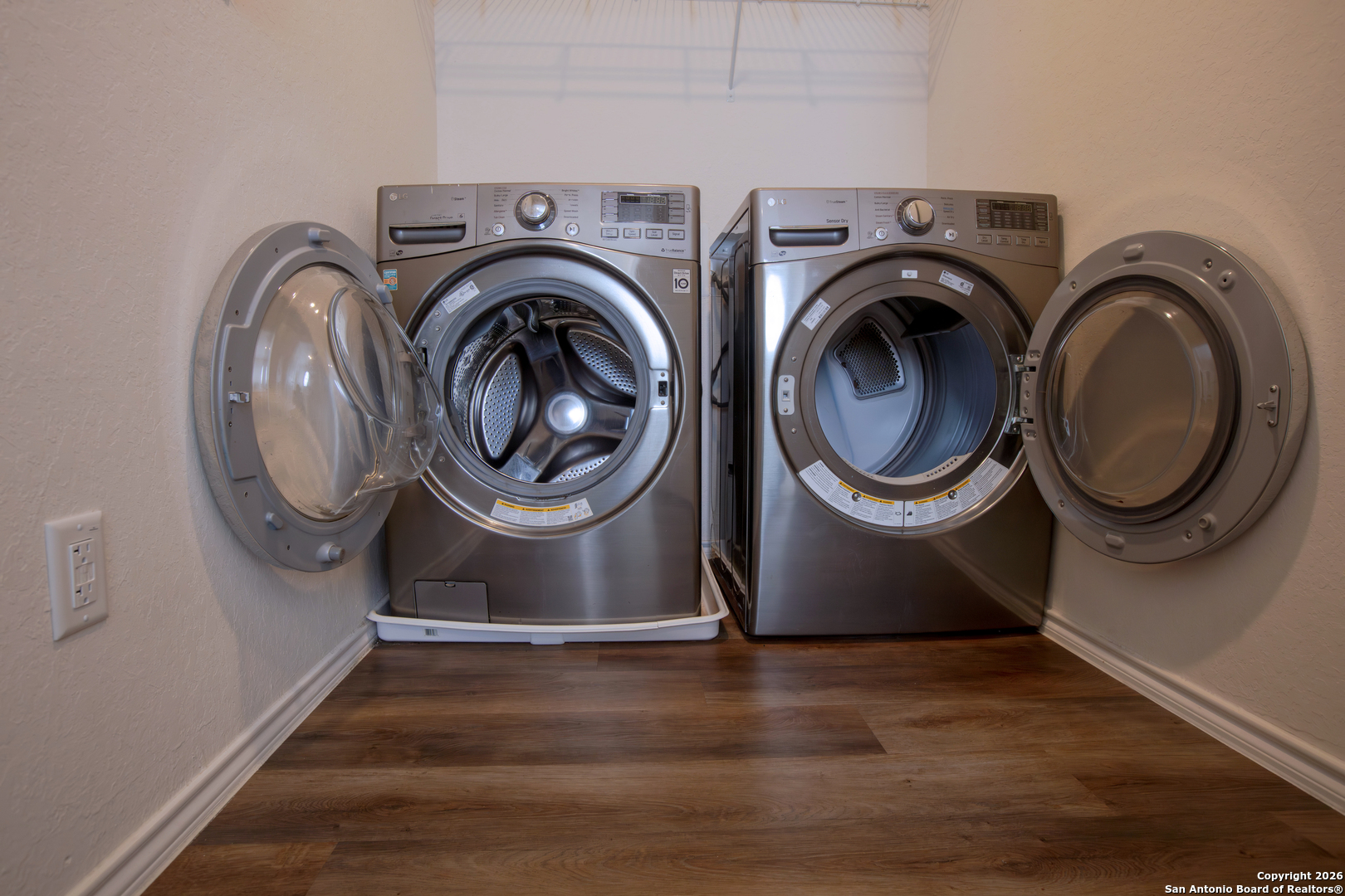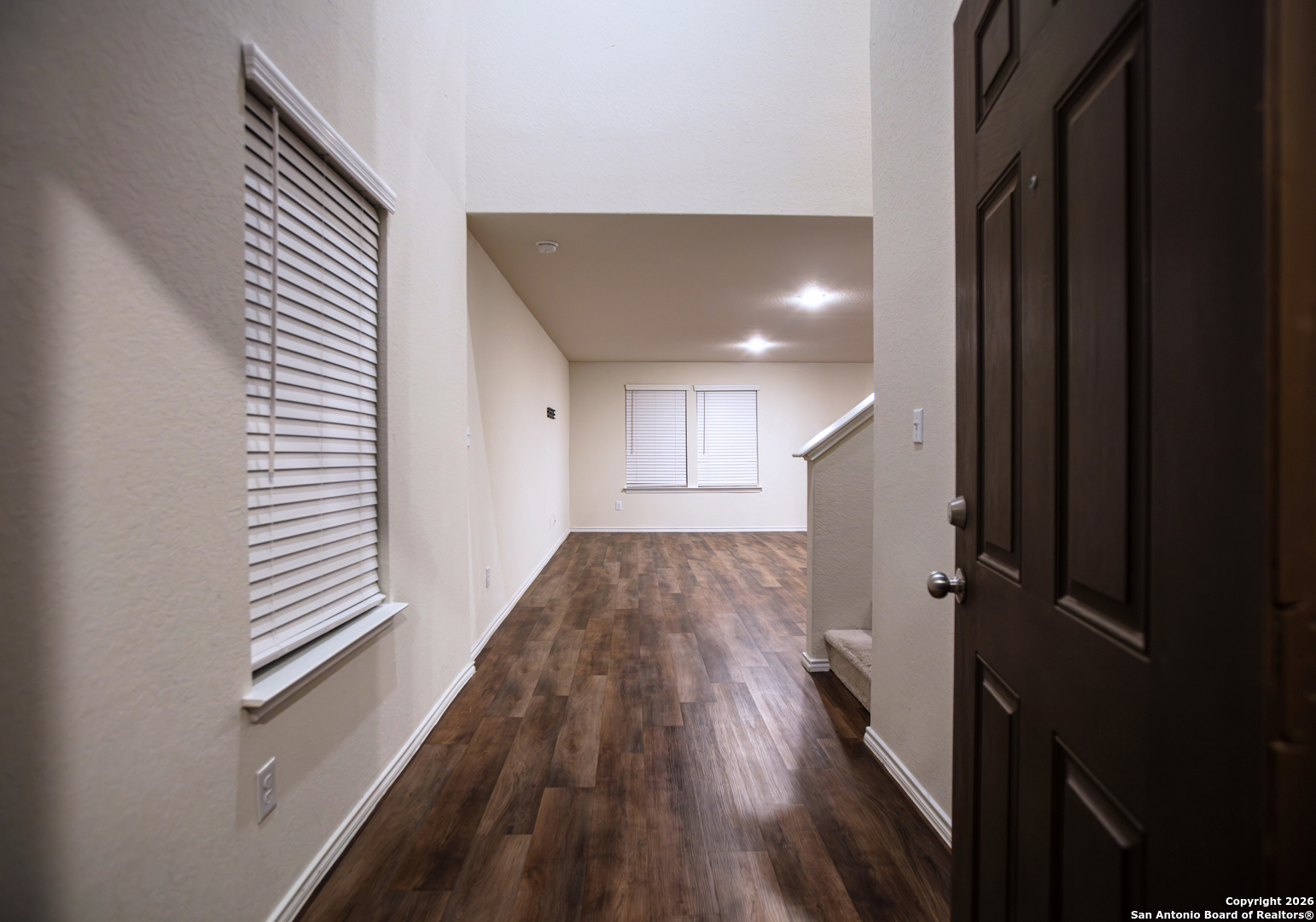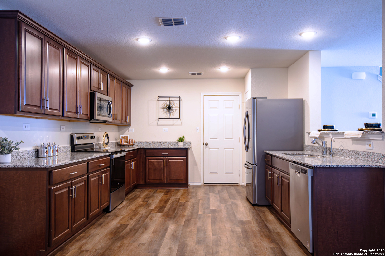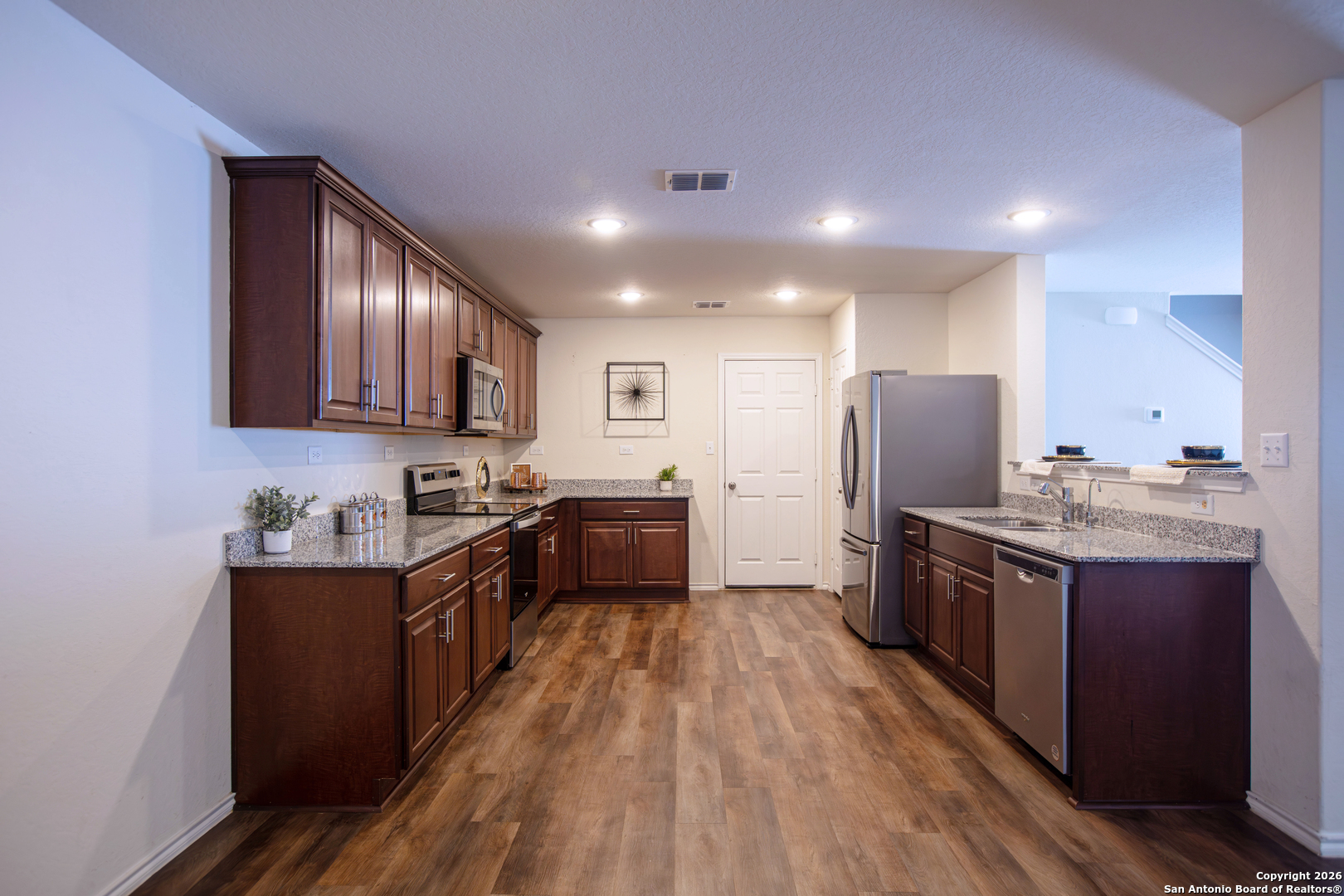 Don't miss this gorgeous, well-kept 3-bedroom, 2.5-bath, featuring an open concept floor plan, spacious kitchen with abundant cabinet space, beautiful granite countertops and blinds throughout. This home comes complete with stainless-steel appliances, including a refrigerator, washer/dryer, self-cleaning oven, and dishwasher. All bedrooms offer generous closet space. Enjoy the large backyard from the covered patio. Perfect for entertaining, privacy fence and no rear neighbors. The two-car garage includes a remote-controlled opener. Conveniently located with quick access to Fort Sam Houston, Randolph AFB, I-10, I-35, & Loop 1604. This move-in-ready home is thoughtfully designed & ready for you to make it your home.