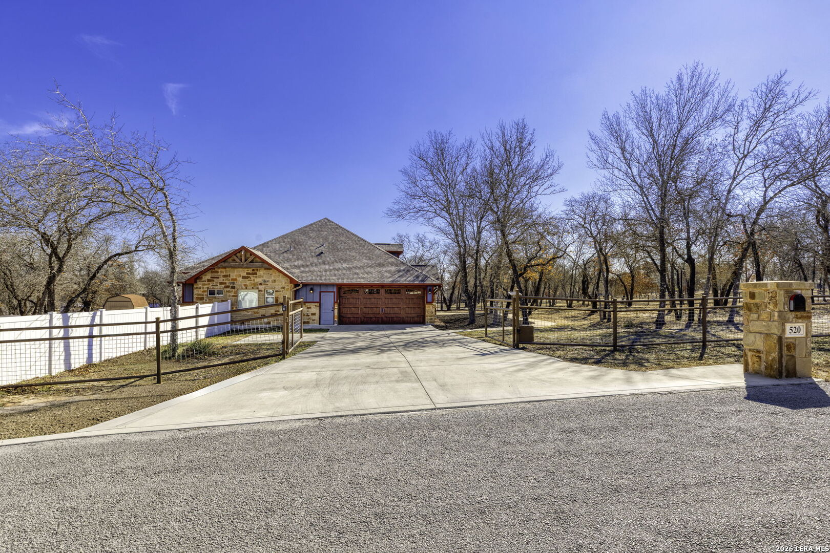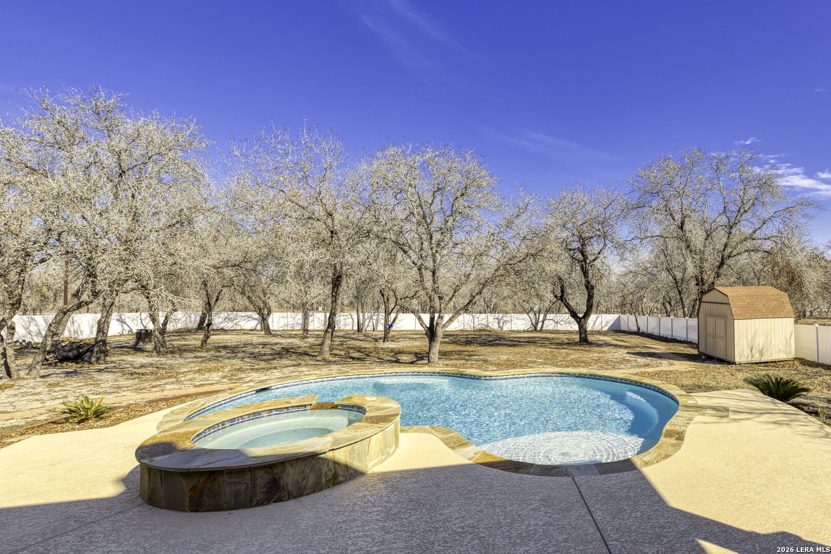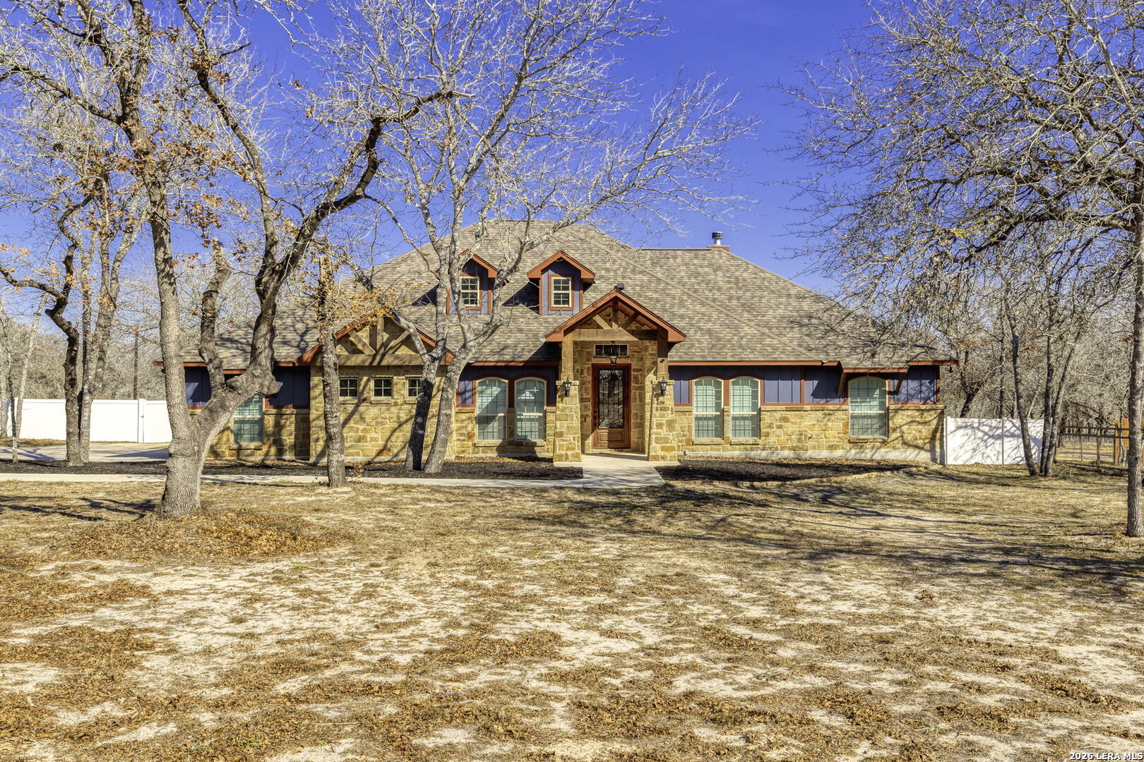 Stunning Home + Sparkling Pool & Hot Tub + 2 Acres of Wooded Countryside! Crafted in 2019 by esteemed local builder MG Legacy Custom Homes, this 1-owner home features Rustic Elegance with a touch of Mountain Lodge flair. Open floor plan with high-end finish out; Retreat to your grand living room w/rock fireplace, locally hewn mesquite mantel, overlooking gorgeous treed backyard oasis, with generous patio, gleaming pool & hot tub! Double doors open to the Dedicated Study, with beautiful wood-tile flooring in both the study & Formal Dining. Rich natural Alder cabinetry & high-level granite! Throughout the home, you'll appreciate solid wood Knotty Alder interior doors. All ceramic tile floors (no Carpet)! Lovely plantation shutters grace many windows. Fully fenced front yard with pipe fencing, including electric gate at driveway, and a large portion of the back yard is fenced with durable vinyl privacy fencing. Convenient backyard storage shed, water softener, and gutters around the home! Country Living, minutes to city conveniences. Community park!