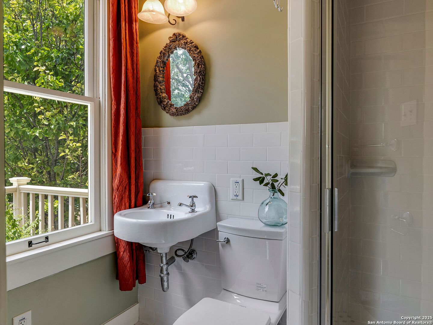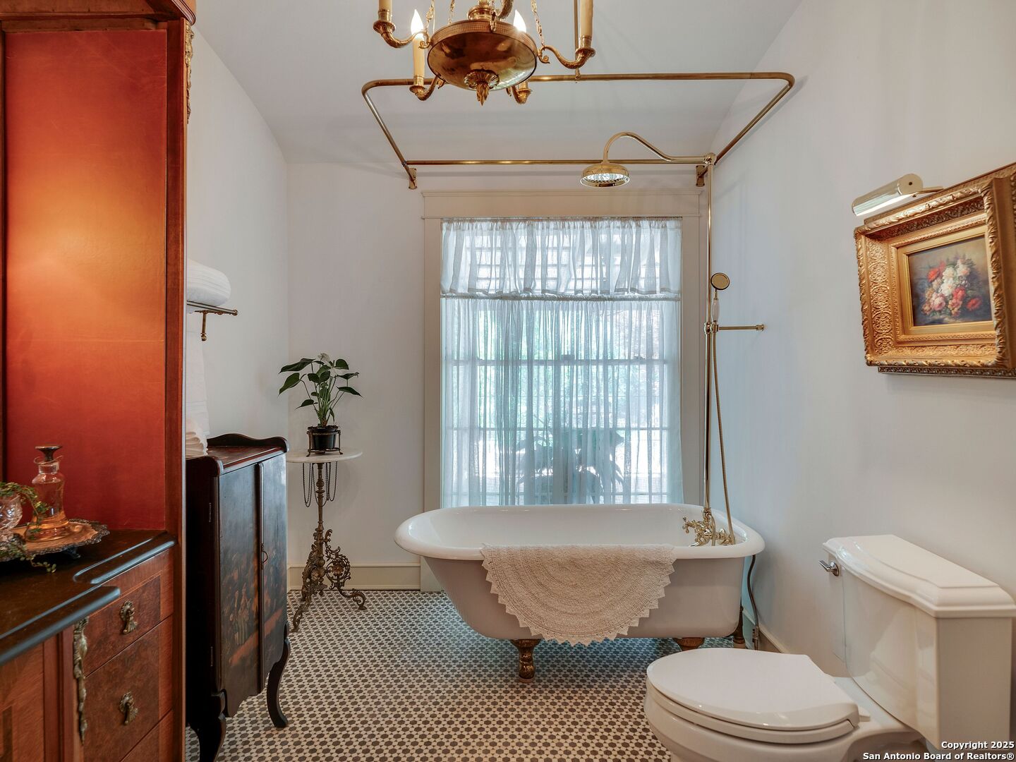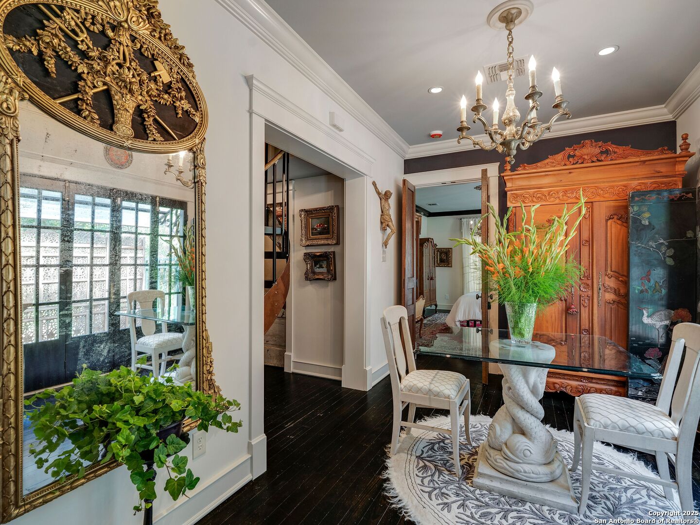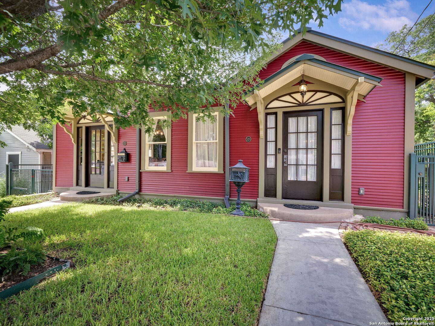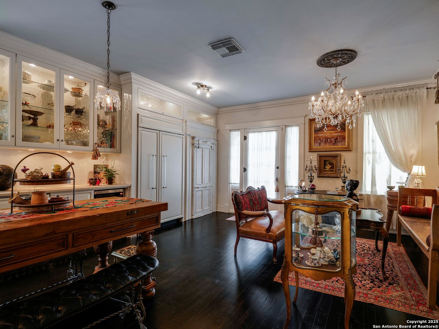 UrbanLiving Inside 410 - Old World Charm Meets Curated Elegance in Monte Vista. Welcome to this historic Monte Vista home, which blends classic curb appeal with richly layered interiors - crystal chandeliers, antique columns, dramatic dark wood flooring, and a chef's worthy kitchen wrapped in period detail. The main residence features a one-bedroom, one-and-a-half-bath layout on the main floor, complemented by a loft-style second bedroom with its own full bath upstairs, ideal for guests, a home office, or creative space. The chef-inspired kitchen honors the home's character, showcasing limestone countertops, custom cabinetry with glass-front doors, a built-in refrigerator, and gas cooking all wrapped in period detail. A spacious and romantic primary bedroom exudes elegance and tranquility. Soft linen window coverings gently filter natural light, creating a serene and airy atmosphere. The room offers generous space for lounging or reading, making it a true sanctuary within the home. The adjoining bath is an exquisite space featuring intricate, artisan-tiled floors and a freestanding claw-foot tub adorned with gleaming brass hardware. An incredible armoire-style vanity adds charm and character, blending vintage sophistication with modern functionality. A walk-in closet completes the suite, offering both style and storage in equal measure. Adding even more versatility, a spacious attached guest house offers two bedrooms and two full baths, making it perfect for extended family, guests, or rental income potential. This property also features convenient alley access and an electric gate for added privacy and ease of entry, perfectly suited for urban living in one of San Antonio's most historic and charming neighborhoods. Come see this one-of-a-kind home and make it yours.