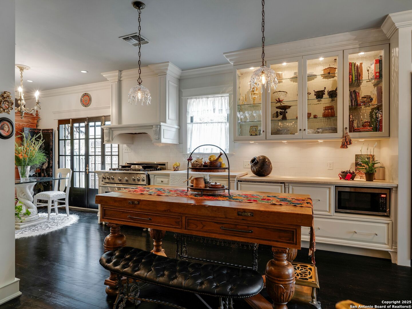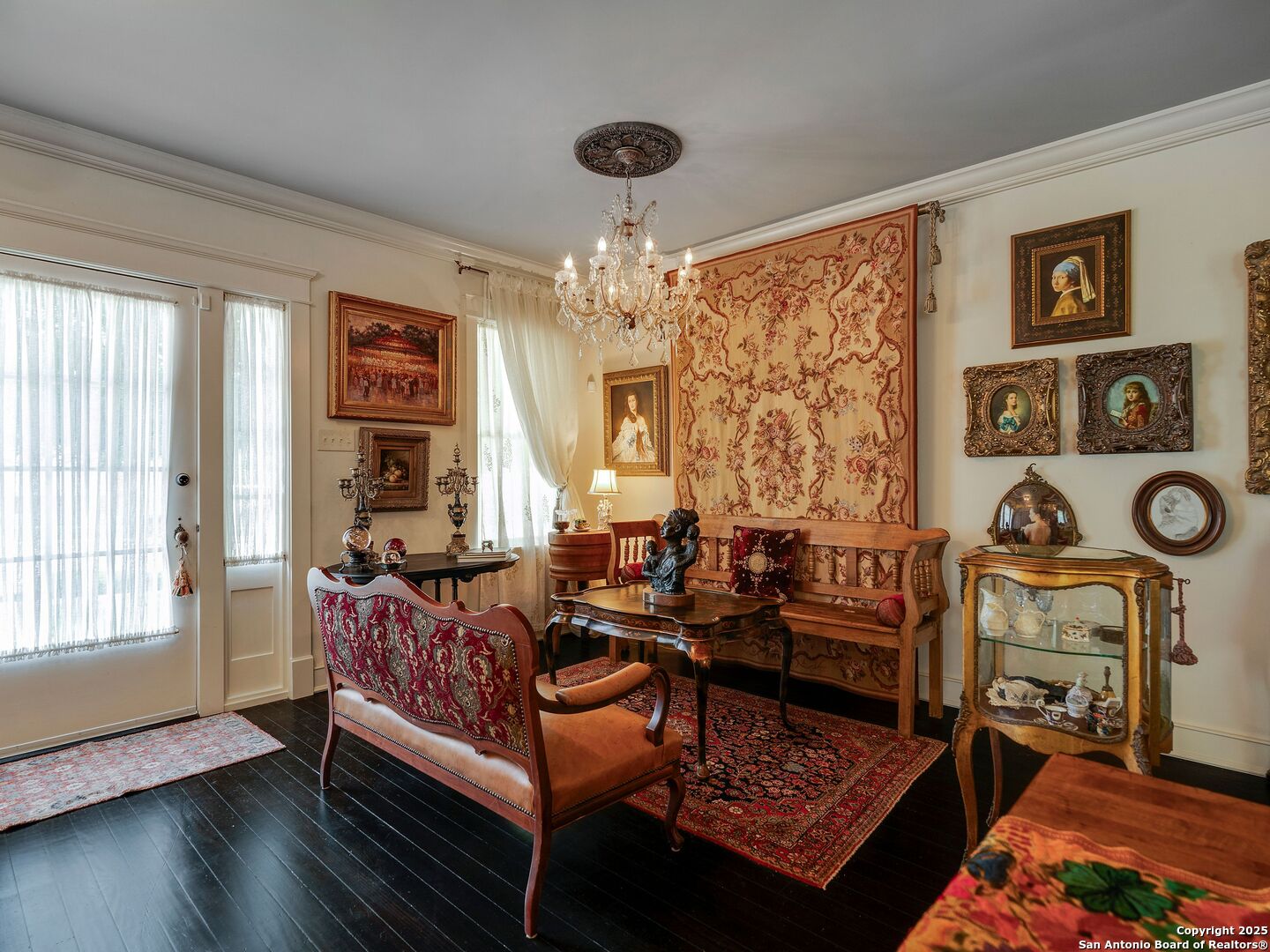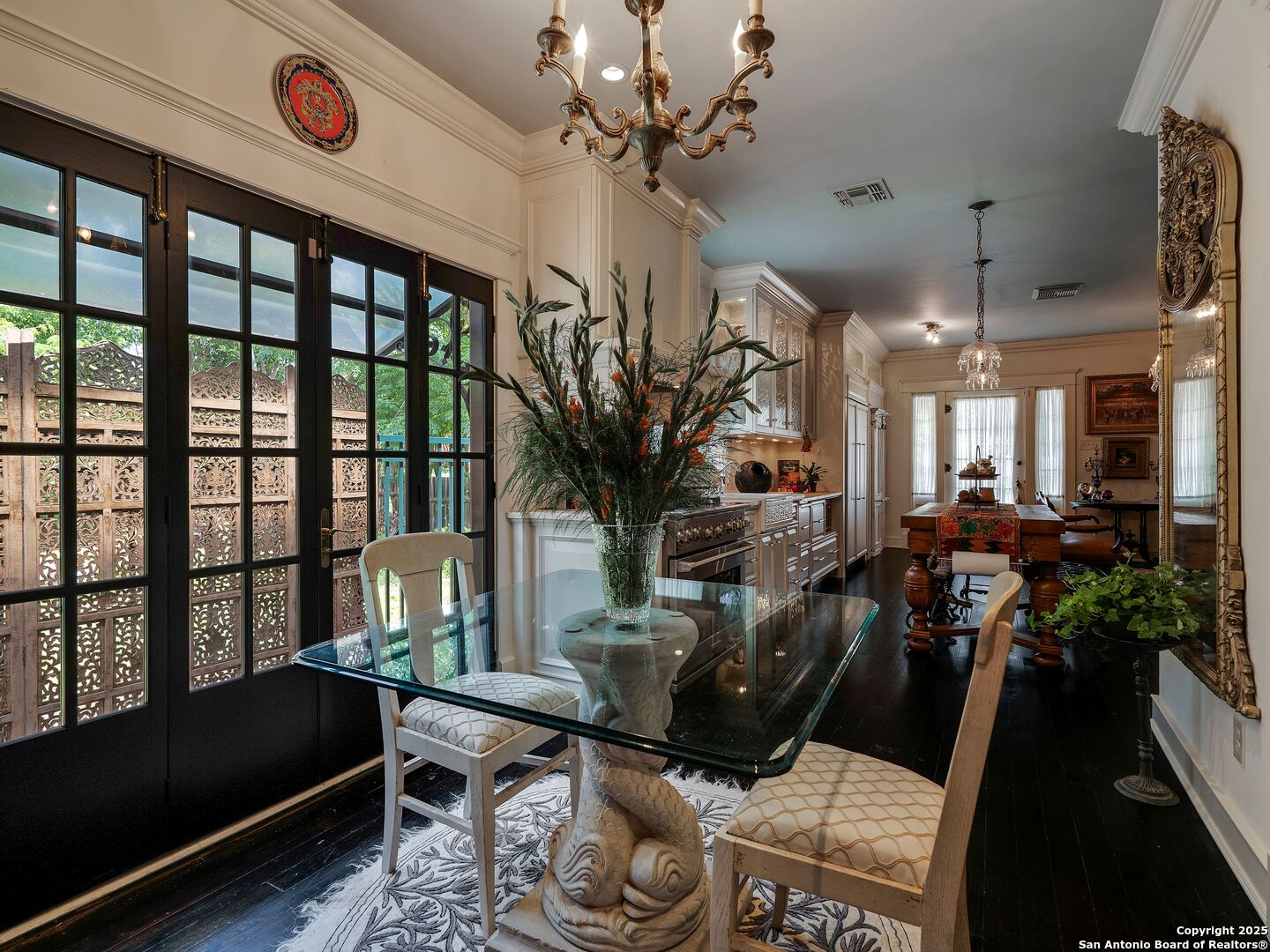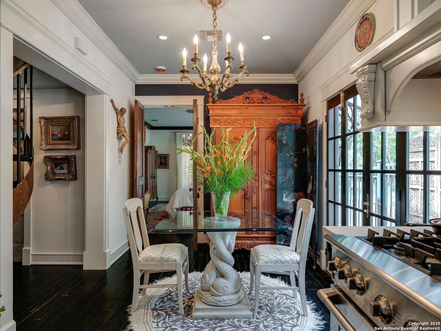 UrbanLiving Inside 410 - Old World Charm Meets Curated Elegance in Monte Vista. Welcome to this historic Monte Vista home, which blends classic curb appeal with richly layered interiors - crystal chandeliers, antique columns, dramatic dark wood flooring, and a chef's worthy kitchen wrapped in period detail. The main residence features a one-bedroom, one-and-a-half-bath layout on the main floor, complemented by a loft-style second bedroom with its own full bath upstairs, ideal for guests, a home office, or creative space. The chef-inspired kitchen honors the home's character, showcasing limestone countertops, custom cabinetry with glass-front doors, a built-in refrigerator, and gas cooking all wrapped in period detail. A spacious and romantic primary bedroom exudes elegance and tranquility. Soft linen window coverings gently filter natural light, creating a serene and airy atmosphere. The room offers generous space for lounging or reading, making it a true sanctuary within the home. The adjoining bath is an exquisite space featuring intricate, artisan-tiled floors and a freestanding claw-foot tub adorned with gleaming brass hardware. An incredible armoire-style vanity adds charm and character, blending vintage sophistication with modern functionality. A walk-in closet completes the suite, offering both style and storage in equal measure. Adding even more versatility, a spacious attached guest house offers two bedrooms and two full baths, making it perfect for extended family, guests, or rental income potential. This property also features convenient alley access and an electric gate for added privacy and ease of entry, perfectly suited for urban living in one of San Antonio's most historic and charming neighborhoods. Come see this one-of-a-kind home and make it yours.