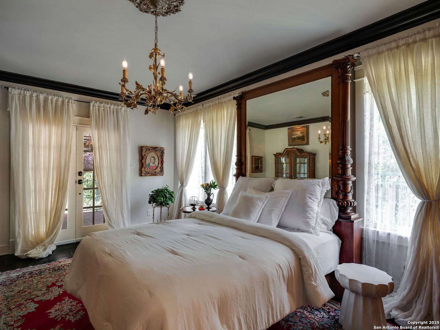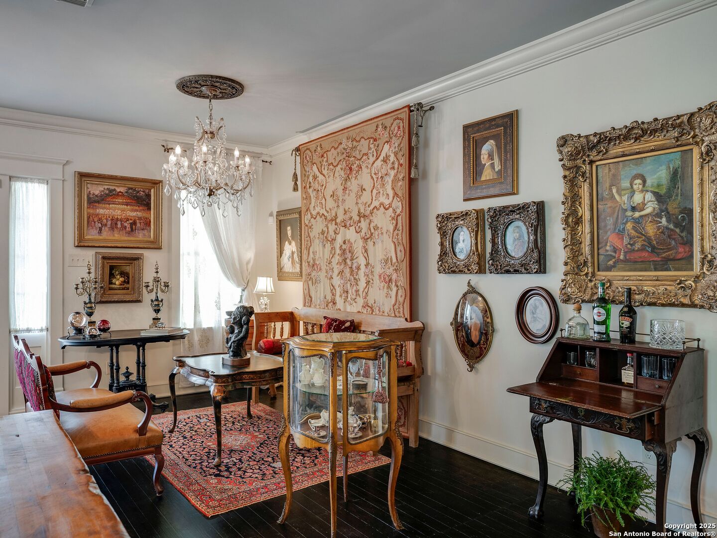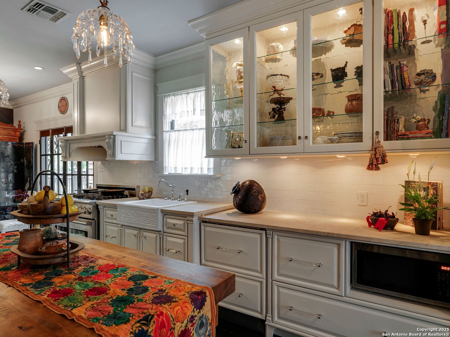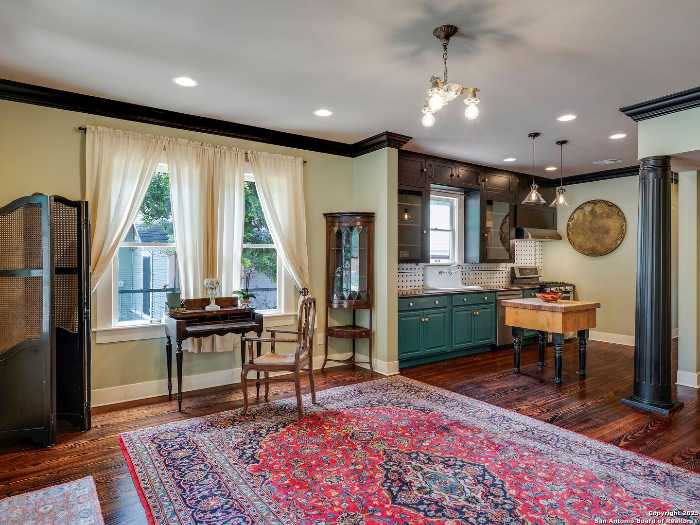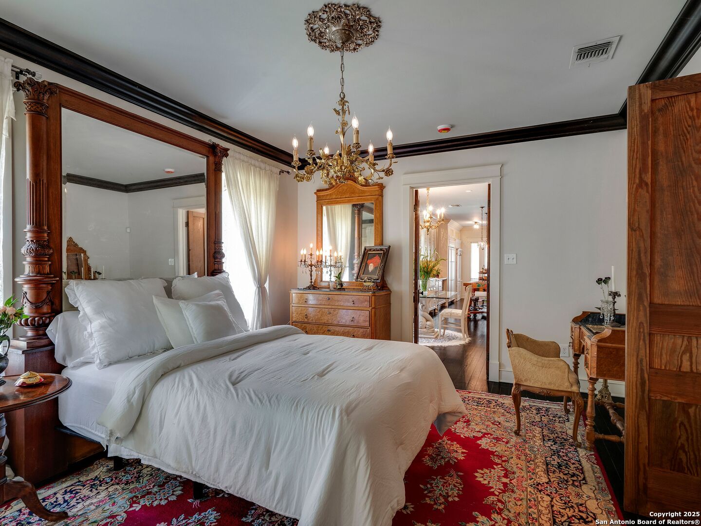 UrbanLiving Inside 410 - Old World Charm Meets Curated Elegance in Monte Vista. Welcome to this historic Monte Vista home, which blends classic curb appeal with richly layered interiors - crystal chandeliers, antique columns, dramatic dark wood flooring, and a chef's worthy kitchen wrapped in period detail. The main residence features a one-bedroom, one-and-a-half-bath layout on the main floor, complemented by a loft-style second bedroom with its own full bath upstairs, ideal for guests, a home office, or creative space. The chef-inspired kitchen honors the home's character, showcasing limestone countertops, custom cabinetry with glass-front doors, a built-in refrigerator, and gas cooking all wrapped in period detail. A spacious and romantic primary bedroom exudes elegance and tranquility. Soft linen window coverings gently filter natural light, creating a serene and airy atmosphere. The room offers generous space for lounging or reading, making it a true sanctuary within the home. The adjoining bath is an exquisite space featuring intricate, artisan-tiled floors and a freestanding claw-foot tub adorned with gleaming brass hardware. An incredible armoire-style vanity adds charm and character, blending vintage sophistication with modern functionality. A walk-in closet completes the suite, offering both style and storage in equal measure. Adding even more versatility, a spacious attached guest house offers two bedrooms and two full baths, making it perfect for extended family, guests, or rental income potential. This property also features convenient alley access and an electric gate for added privacy and ease of entry, perfectly suited for urban living in one of San Antonio's most historic and charming neighborhoods. Come see this one-of-a-kind home and make it yours.