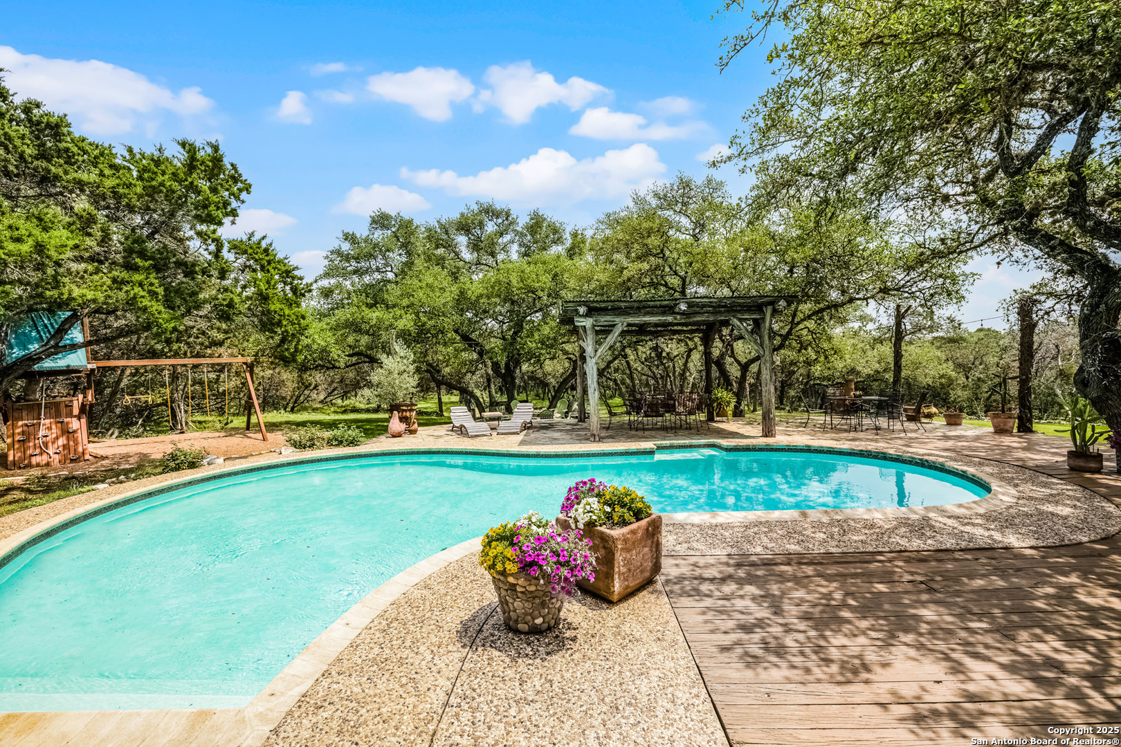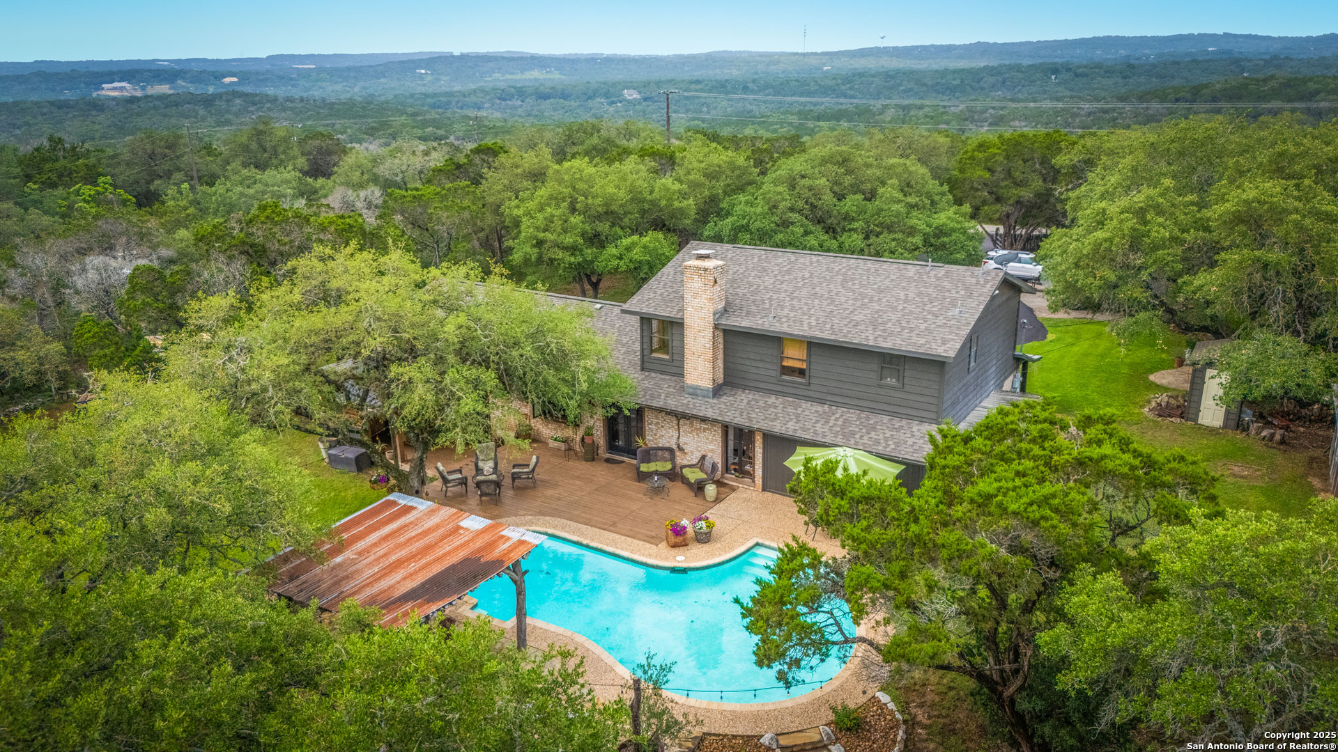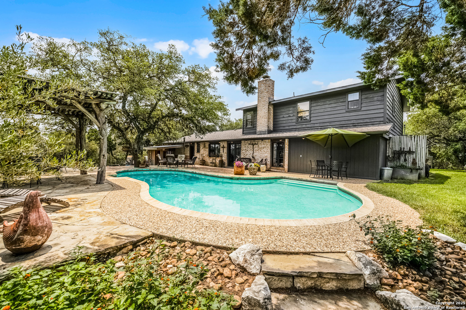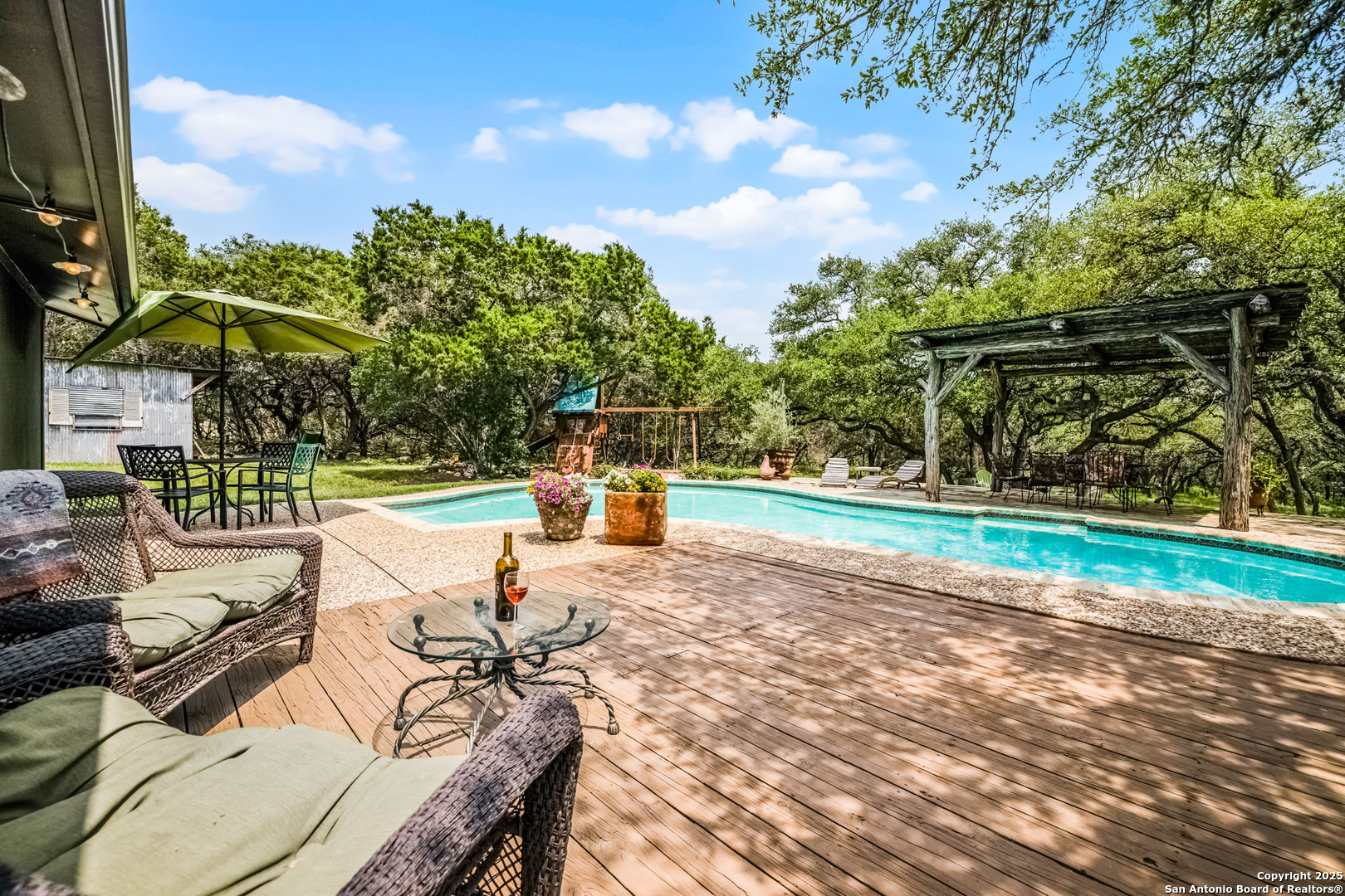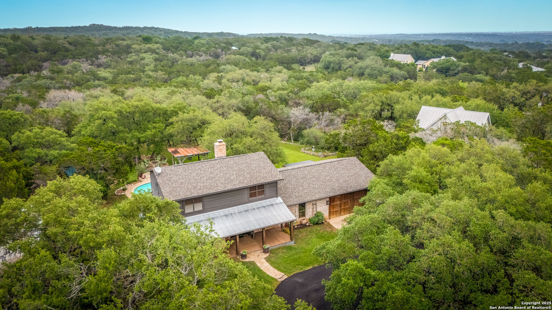 Experience Living at its best on 2.5 acres with a perfect blend of luxury, privacy, and convenience in the heart of Texas Hill Country. This recently remolded thoughtfully designed home blends rustic charm with refined luxury, featuring natural materials, top-tier finishes, and extensive outdoor living spaces ideal for entertaining. Entering the home is the terrazzo tile original to the house with exposed wooden beams that add warmth and architectural character to the house with Stucco interior walls which adds to the timeless elegance. The living room, kitchen and dining room have been opened up to create a very comfortable living space with a wood burning fireplace. The home has 4 bedrooms with the master being on the main floor with an on suite, upstairs are three bedrooms with a newly remolded bathroom. The gourmet kitchen has custom cabinetry, natural limestone pebble backsplash with natural limestone countertops. Professional-grade Z-line gas stove with pot filler and custom vent hood with Z-Line microwave drawer. The custom island allows room for seating while still plenty of room for cooking with an statement chandelier and European sconces for ambient lighting. The family room, formally the garage, was renovated in December of 2020. Which includes custom woodwork with beams and concreate floors. Off of the family room is a half bath with custom sink, custom wallpaper and European sconces. Outside provides a picturesque backdrop for entertainment and outdoor activities. The outdoor living spaces includes a pool with an outdoor kitchen with a built in BBQ grill with a mini-fridge, a firepit and plenty of room for relaxing. The property has no HOA so you can raise your AG/FFA projects at home with you. This is a house you don't want to slip by it is truly one of a kind.