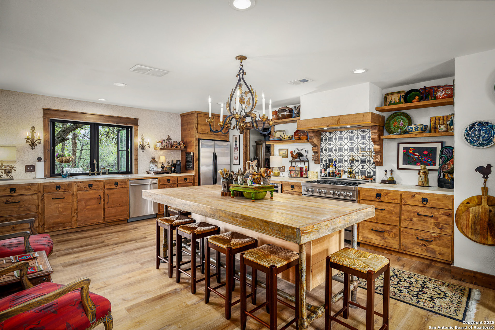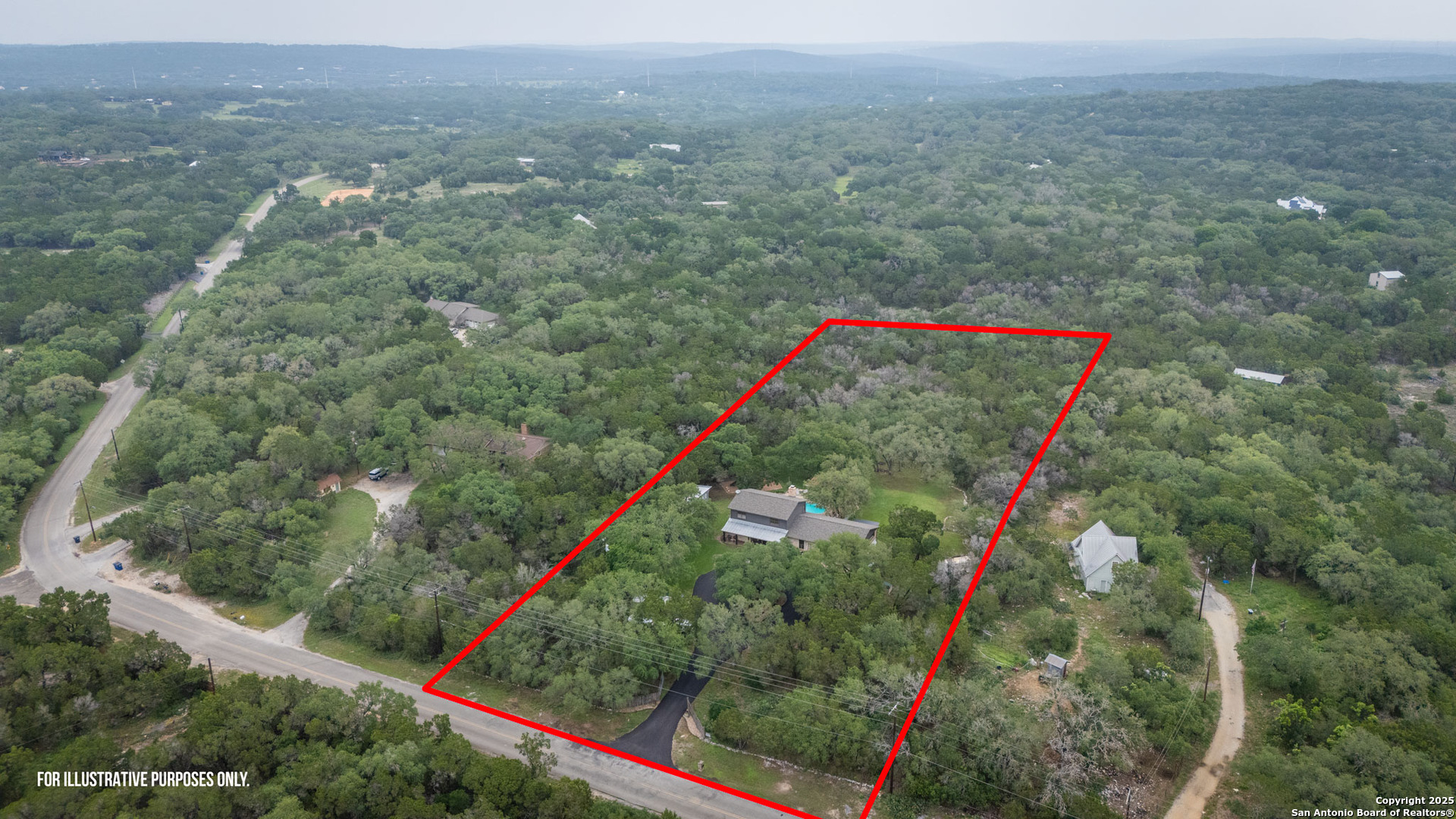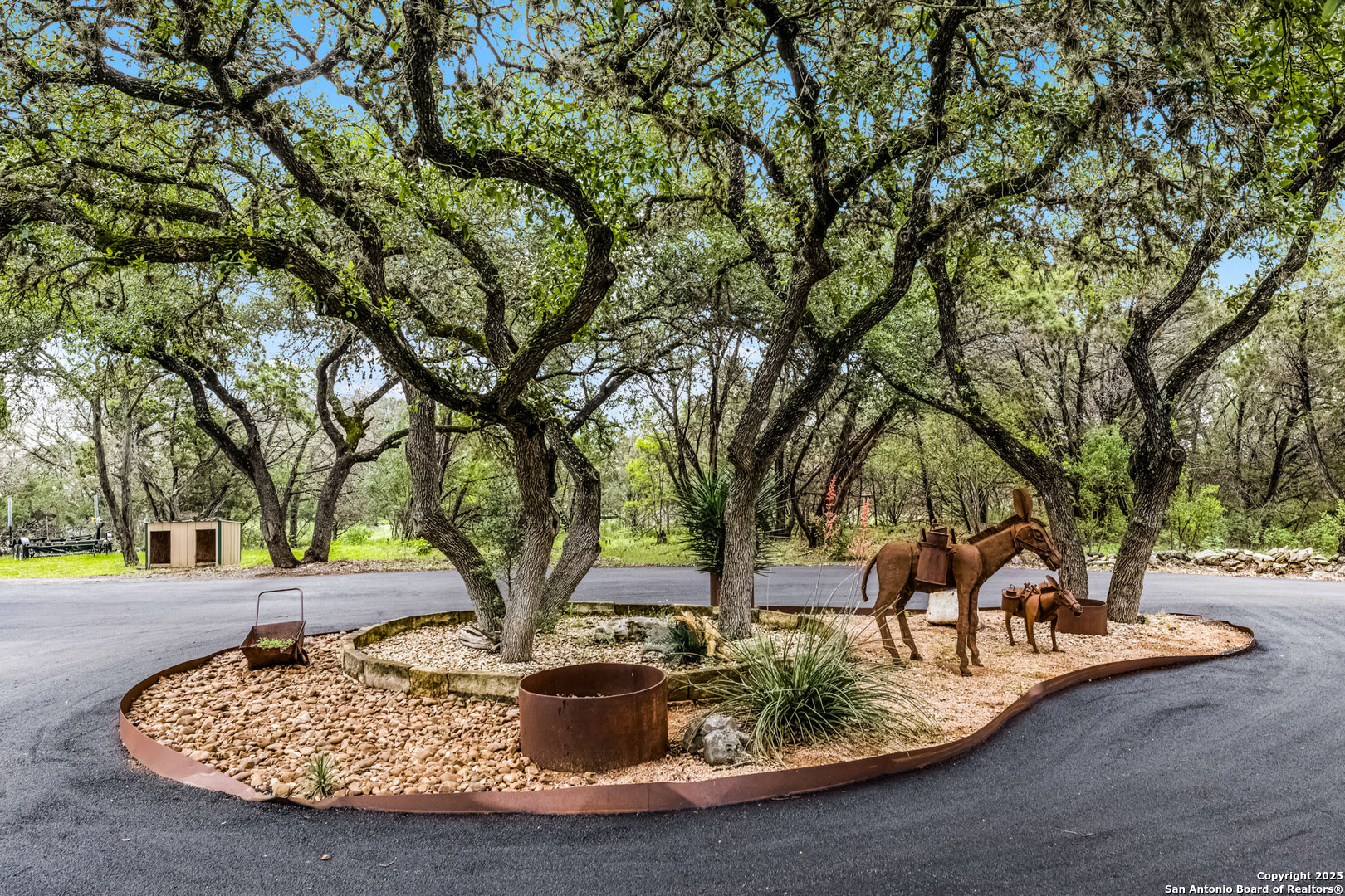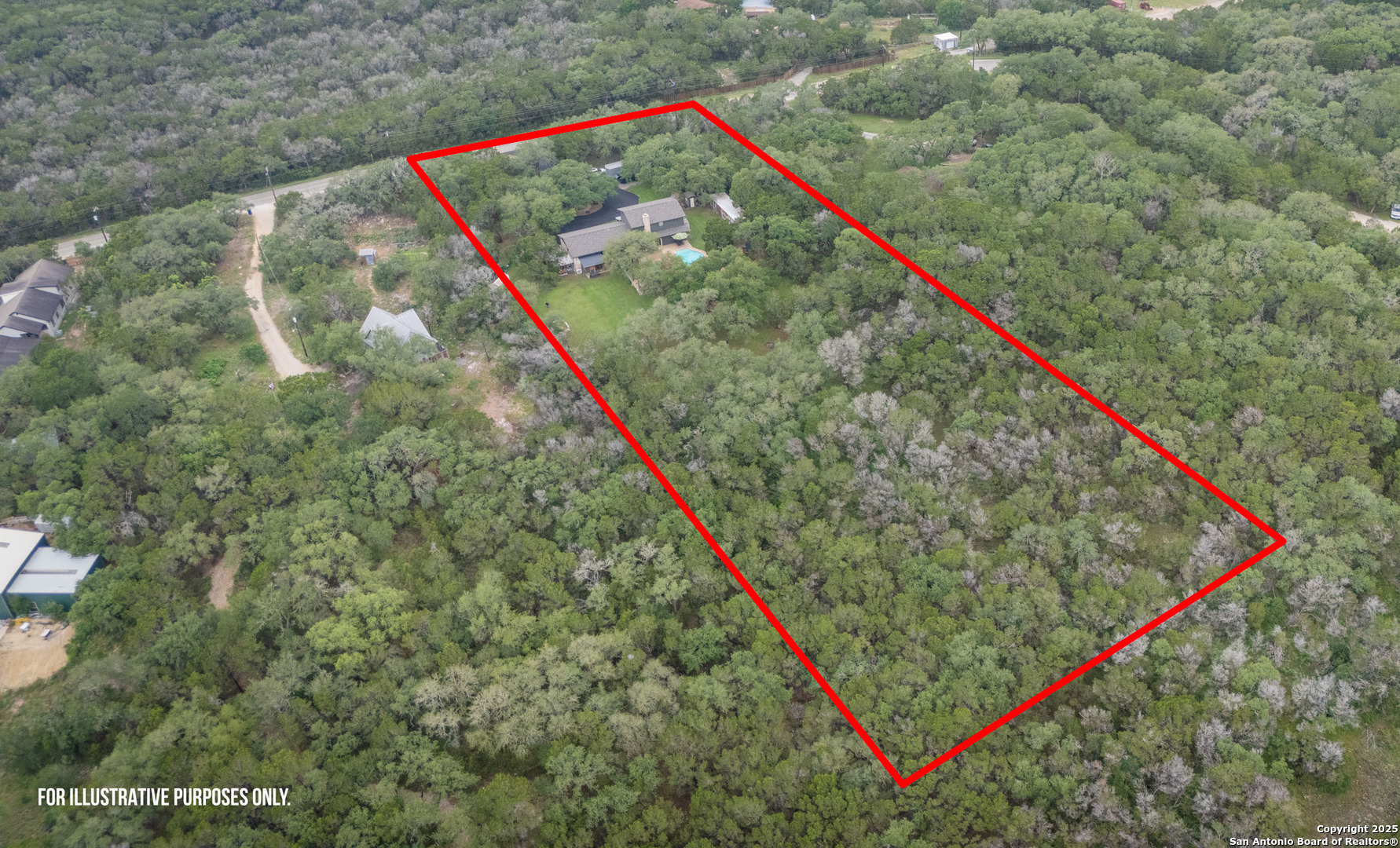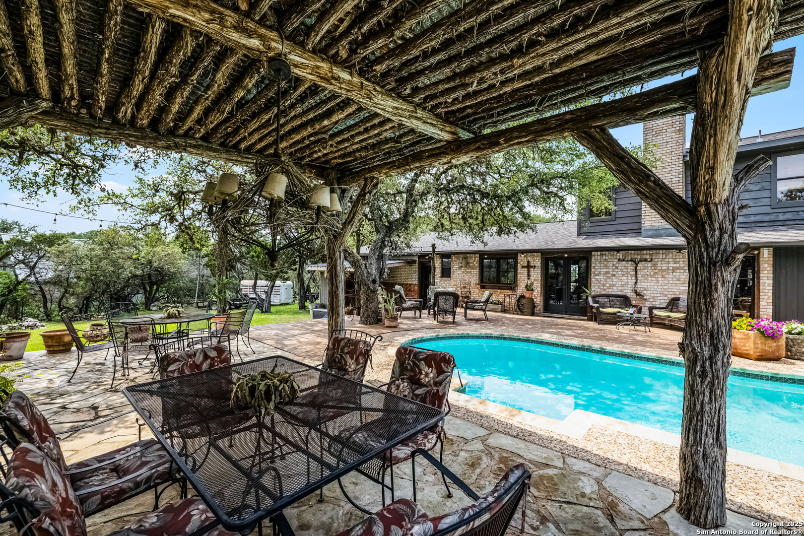 Experience Living at its best on 2.5 acres with a perfect blend of luxury, privacy, and convenience in the heart of Texas Hill Country. This recently remolded thoughtfully designed home blends rustic charm with refined luxury, featuring natural materials, top-tier finishes, and extensive outdoor living spaces ideal for entertaining. Entering the home is the terrazzo tile original to the house with exposed wooden beams that add warmth and architectural character to the house with Stucco interior walls which adds to the timeless elegance. The living room, kitchen and dining room have been opened up to create a very comfortable living space with a wood burning fireplace. The home has 4 bedrooms with the master being on the main floor with an on suite, upstairs are three bedrooms with a newly remolded bathroom. The gourmet kitchen has custom cabinetry, natural limestone pebble backsplash with natural limestone countertops. Professional-grade Z-line gas stove with pot filler and custom vent hood with Z-Line microwave drawer. The custom island allows room for seating while still plenty of room for cooking with an statement chandelier and European sconces for ambient lighting. The family room, formally the garage, was renovated in December of 2020. Which includes custom woodwork with beams and concreate floors. Off of the family room is a half bath with custom sink, custom wallpaper and European sconces. Outside provides a picturesque backdrop for entertainment and outdoor activities. The outdoor living spaces includes a pool with an outdoor kitchen with a built in BBQ grill with a mini-fridge, a firepit and plenty of room for relaxing. The property has no HOA so you can raise your AG/FFA projects at home with you. This is a house you don't want to slip by it is truly one of a kind.