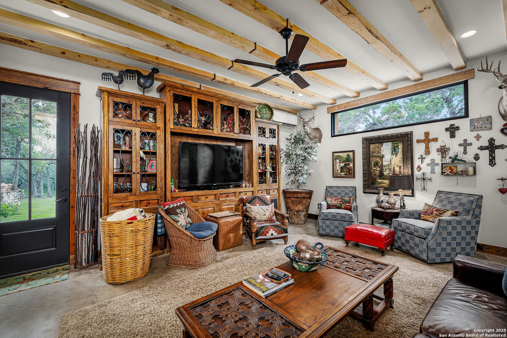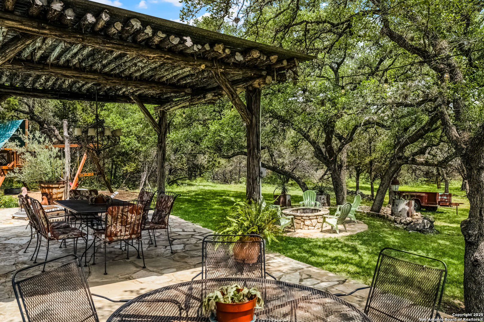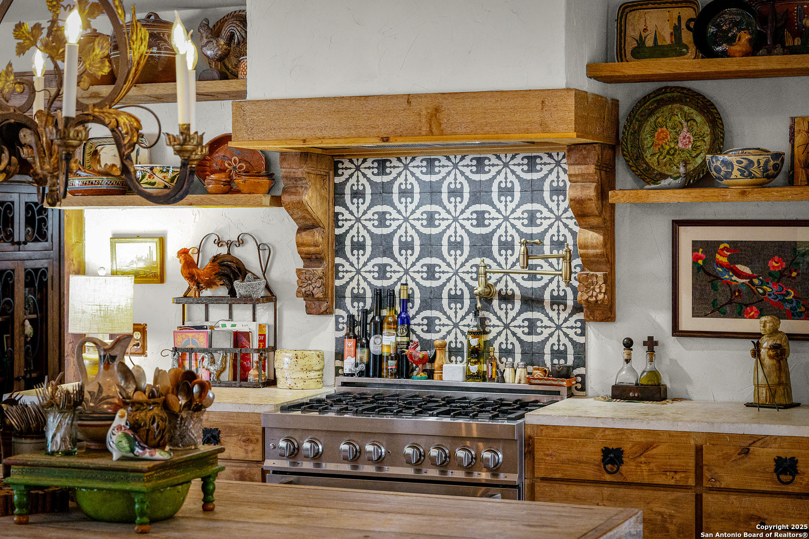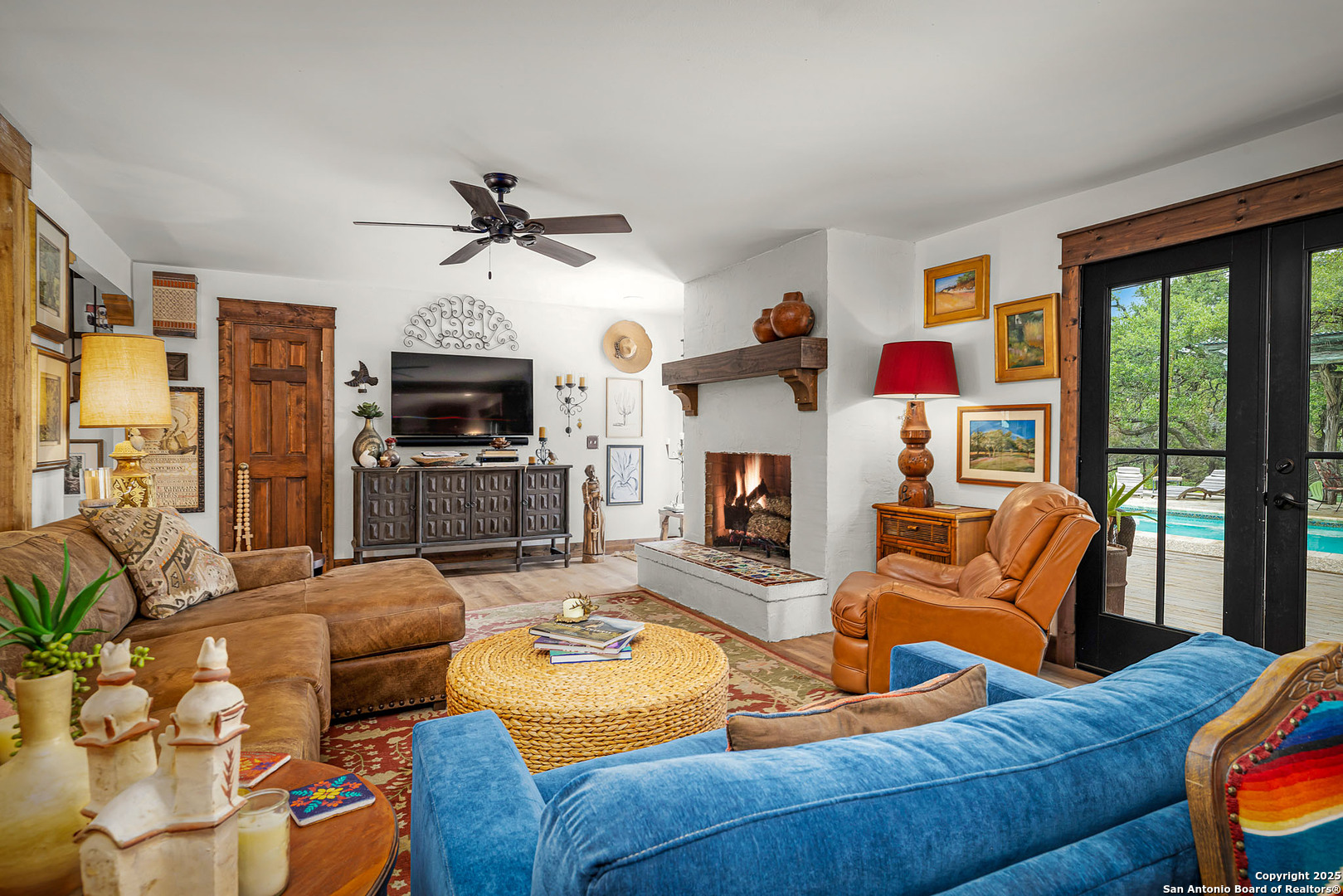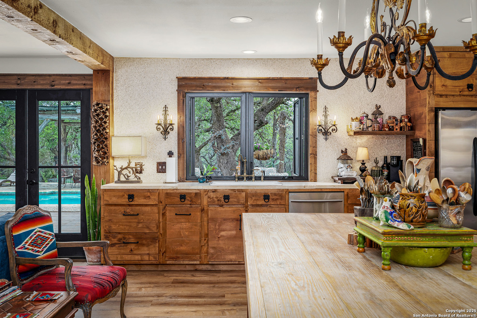 Experience Living at its best on 2.5 acres with a perfect blend of luxury, privacy, and convenience in the heart of Texas Hill Country. This recently remolded thoughtfully designed home blends rustic charm with refined luxury, featuring natural materials, top-tier finishes, and extensive outdoor living spaces ideal for entertaining. Entering the home is the terrazzo tile original to the house with exposed wooden beams that add warmth and architectural character to the house with Stucco interior walls which adds to the timeless elegance. The living room, kitchen and dining room have been opened up to create a very comfortable living space with a wood burning fireplace. The home has 4 bedrooms with the master being on the main floor with an on suite, upstairs are three bedrooms with a newly remolded bathroom. The gourmet kitchen has custom cabinetry, natural limestone pebble backsplash with natural limestone countertops. Professional-grade Z-line gas stove with pot filler and custom vent hood with Z-Line microwave drawer. The custom island allows room for seating while still plenty of room for cooking with an statement chandelier and European sconces for ambient lighting. The family room, formally the garage, was renovated in December of 2020. Which includes custom woodwork with beams and concreate floors. Off of the family room is a half bath with custom sink, custom wallpaper and European sconces. Outside provides a picturesque backdrop for entertainment and outdoor activities. The outdoor living spaces includes a pool with an outdoor kitchen with a built in BBQ grill with a mini-fridge, a firepit and plenty of room for relaxing. The property has no HOA so you can raise your AG/FFA projects at home with you. This is a house you don't want to slip by it is truly one of a kind.