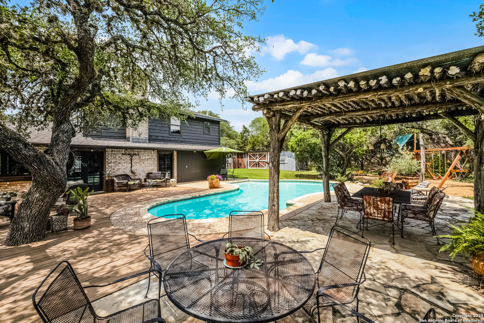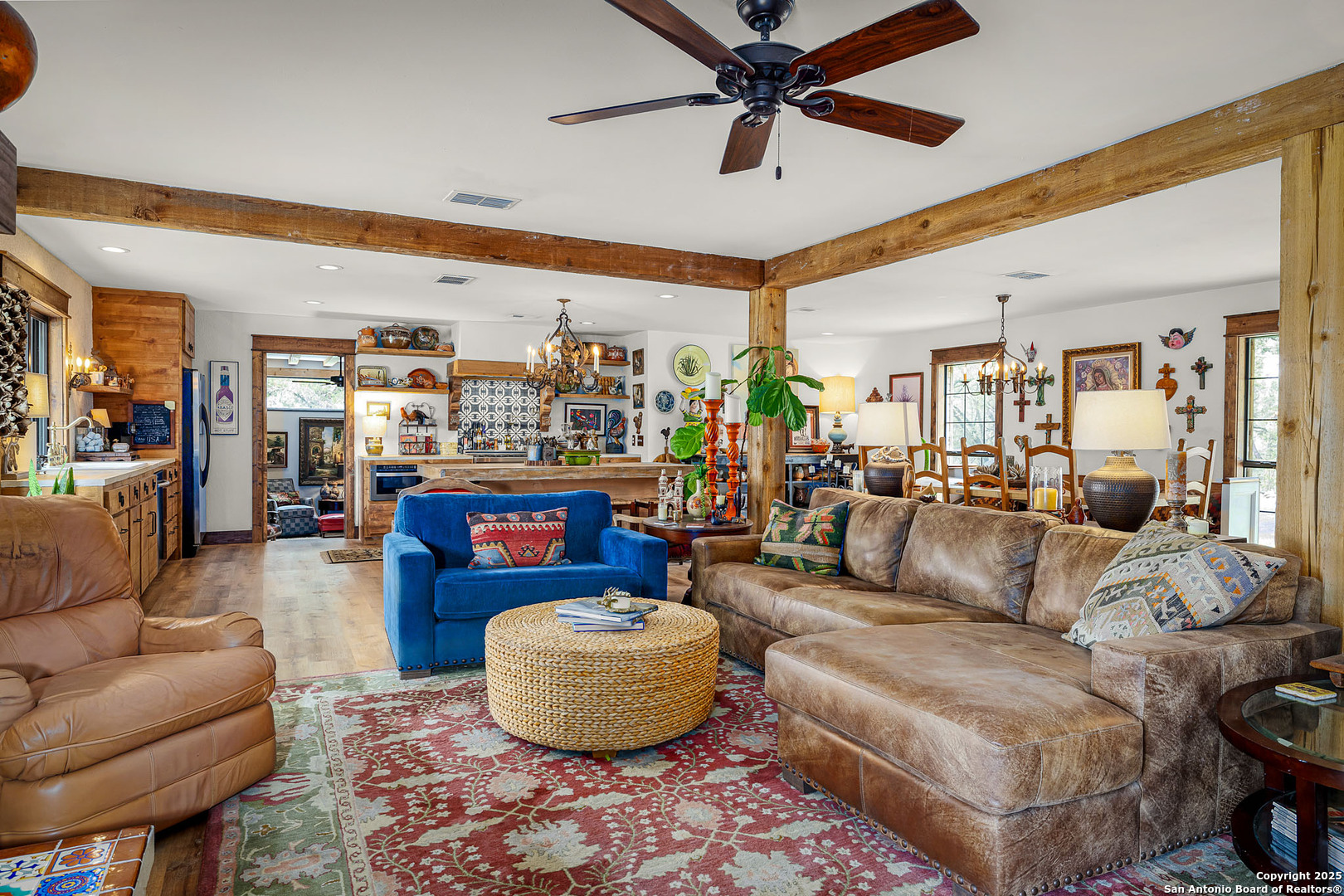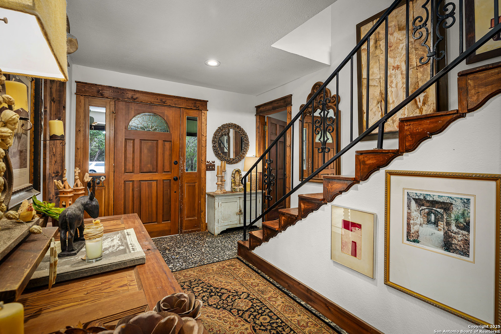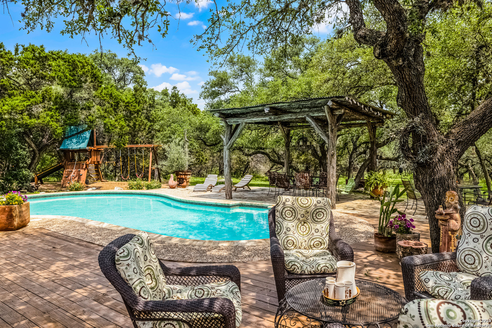 Experience Living at its best on 2.5 acres with a perfect blend of luxury, privacy, and convenience in the heart of Texas Hill Country. This recently remolded thoughtfully designed home blends rustic charm with refined luxury, featuring natural materials, top-tier finishes, and extensive outdoor living spaces ideal for entertaining. Entering the home is the terrazzo tile original to the house with exposed wooden beams that add warmth and architectural character to the house with Stucco interior walls which adds to the timeless elegance. The living room, kitchen and dining room have been opened up to create a very comfortable living space with a wood burning fireplace. The home has 4 bedrooms with the master being on the main floor with an on suite, upstairs are three bedrooms with a newly remolded bathroom. The gourmet kitchen has custom cabinetry, natural limestone pebble backsplash with natural limestone countertops. Professional-grade Z-line gas stove with pot filler and custom vent hood with Z-Line microwave drawer. The custom island allows room for seating while still plenty of room for cooking with an statement chandelier and European sconces for ambient lighting. The family room, formally the garage, was renovated in December of 2020. Which includes custom woodwork with beams and concreate floors. Off of the family room is a half bath with custom sink, custom wallpaper and European sconces. Outside provides a picturesque backdrop for entertainment and outdoor activities. The outdoor living spaces includes a pool with an outdoor kitchen with a built in BBQ grill with a mini-fridge, a firepit and plenty of room for relaxing. The property has no HOA so you can raise your AG/FFA projects at home with you. This is a house you don't want to slip by it is truly one of a kind.