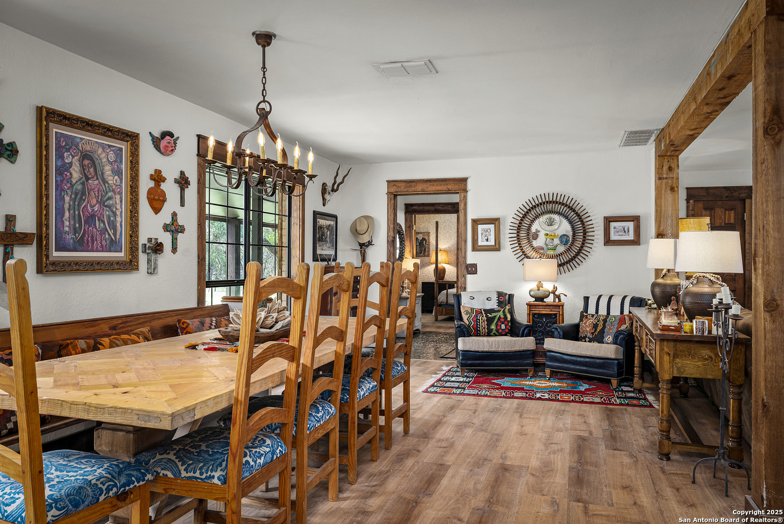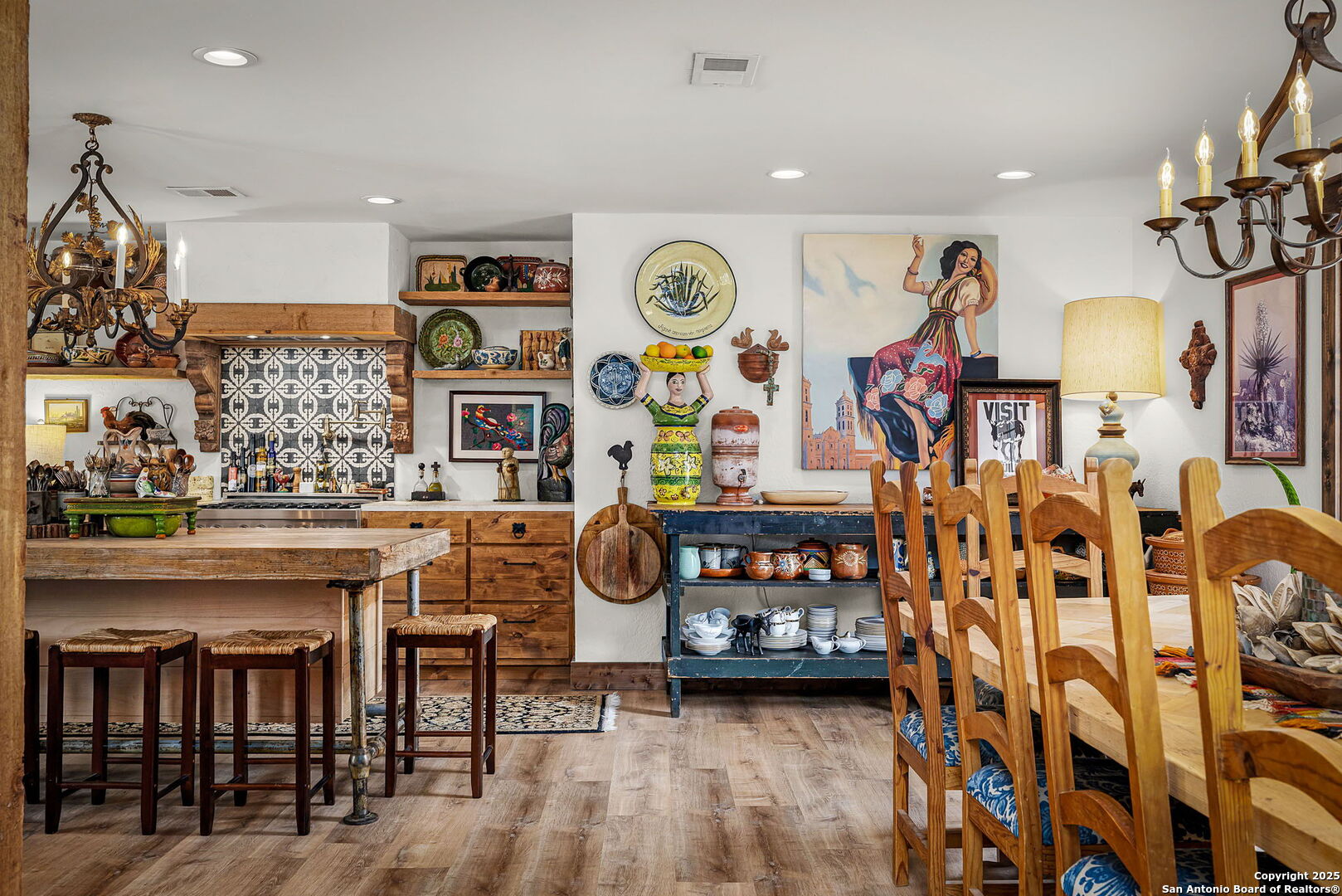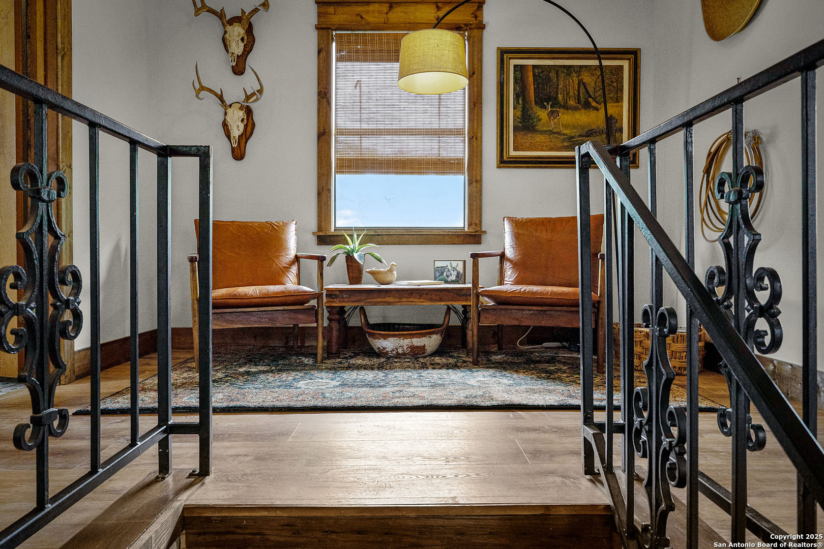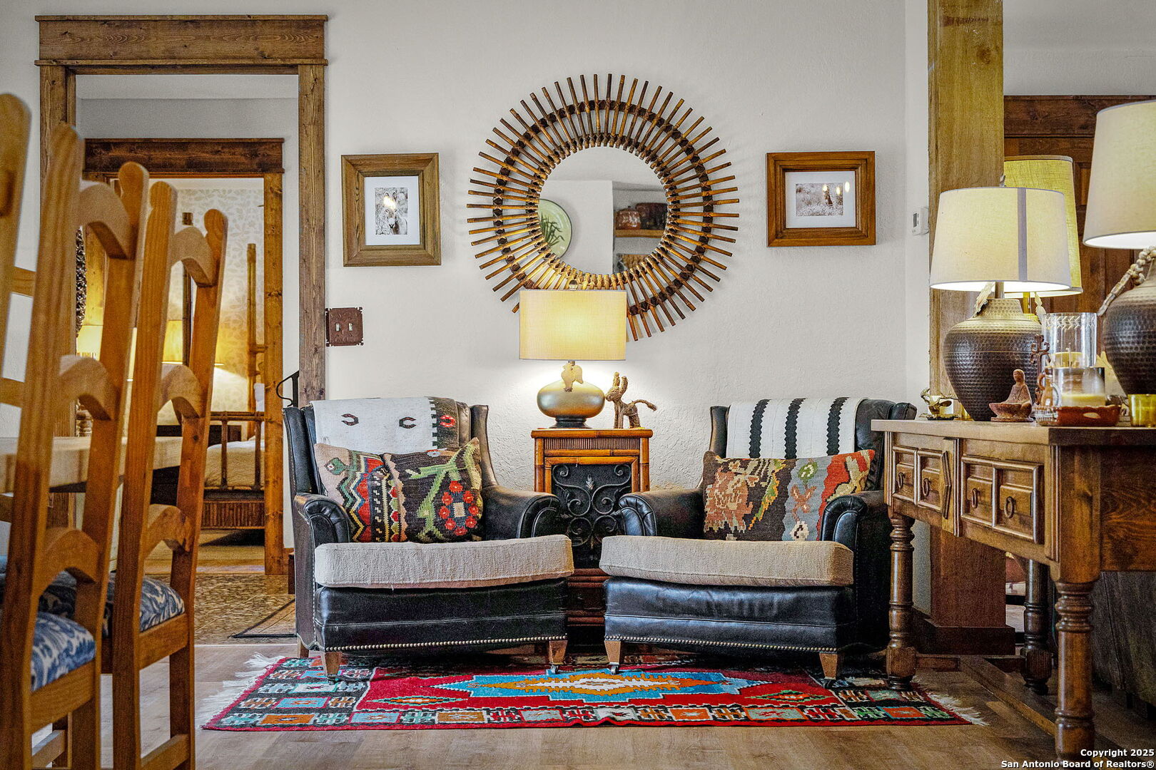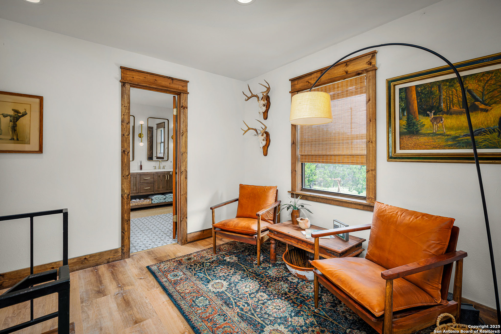Experience Living at its best on 2.5 acres with a perfect blend of luxury, privacy, and convenience in the heart of Texas Hill Country. This recently remolded thoughtfully designed home blends rustic charm with refined luxury, featuring natural materials, top-tier finishes, and extensive outdoor living spaces ideal for entertaining. Entering the home is the terrazzo tile original to the house with exposed wooden beams that add warmth and architectural character to the house with Stucco interior walls which adds to the timeless elegance. The living room, kitchen and dining room have been opened up to create a very comfortable living space with a wood burning fireplace. The home has 4 bedrooms with the master being on the main floor with an on suite, upstairs are three bedrooms with a newly remolded bathroom. The gourmet kitchen has custom cabinetry, natural limestone pebble backsplash with natural limestone countertops. Professional-grade Z-line gas stove with pot filler and custom vent hood with Z-Line microwave drawer. The custom island allows room for seating while still plenty of room for cooking with an statement chandelier and European sconces for ambient lighting. The family room, formally the garage, was renovated in December of 2020. Which includes custom woodwork with beams and concreate floors. Off of the family room is a half bath with custom sink, custom wallpaper and European sconces. Outside provides a picturesque backdrop for entertainment and outdoor activities. The outdoor living spaces includes a pool with an outdoor kitchen with a built in BBQ grill with a mini-fridge, a firepit and plenty of room for relaxing. The property has no HOA so you can raise your AG/FFA projects at home with you. This is a house you don't want to slip by it is truly one of a kind.