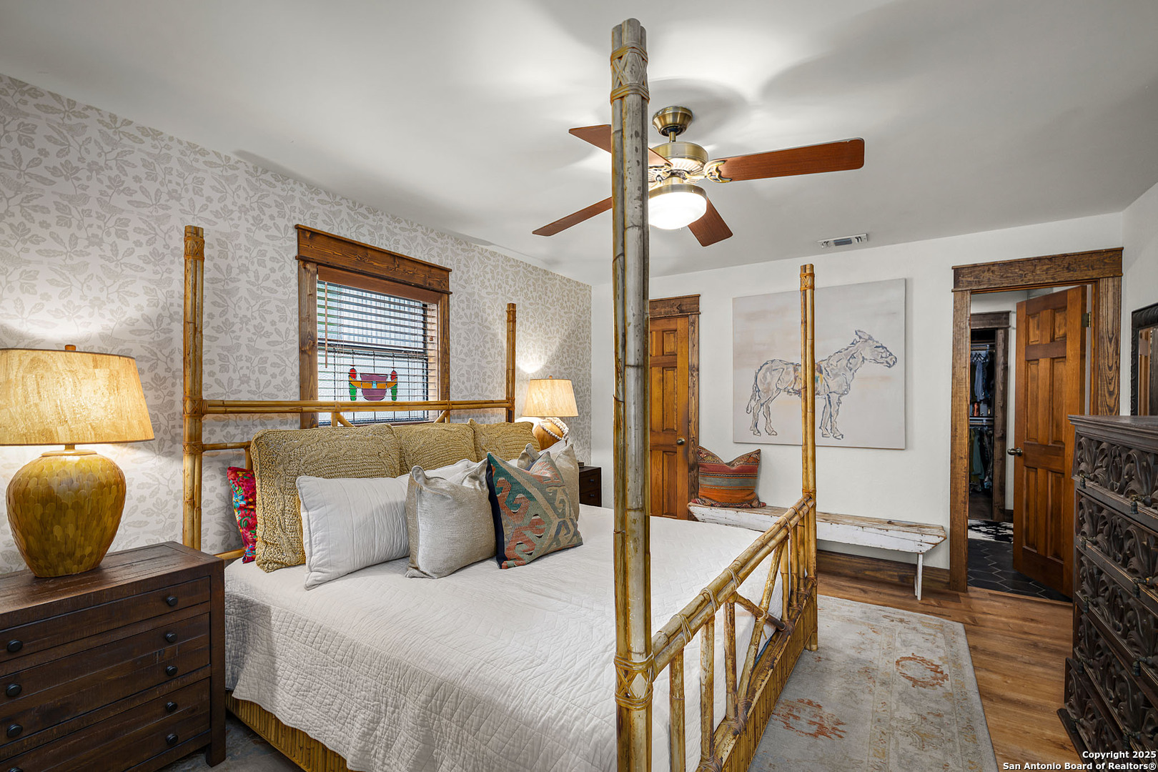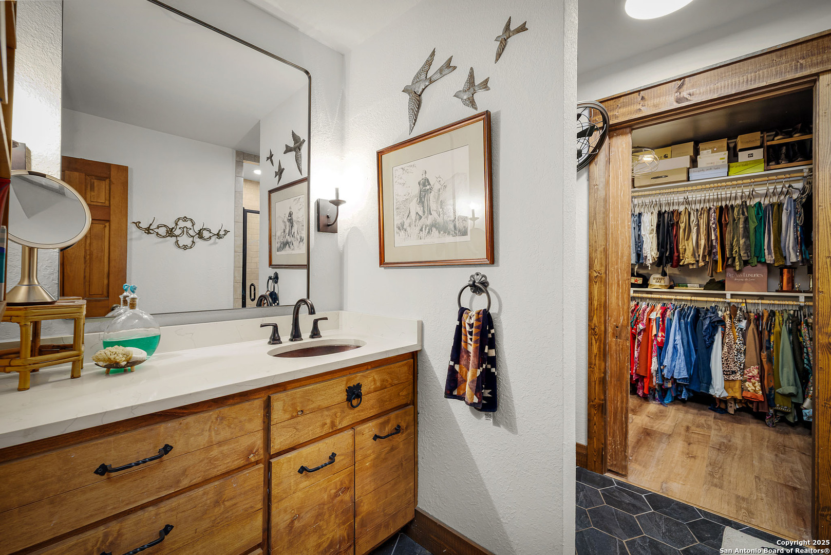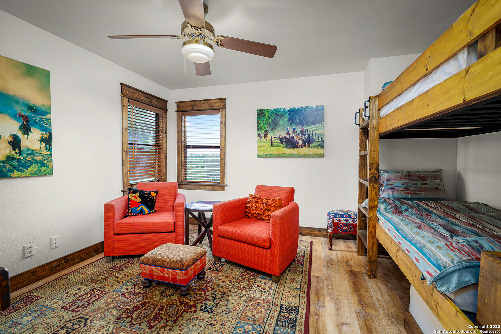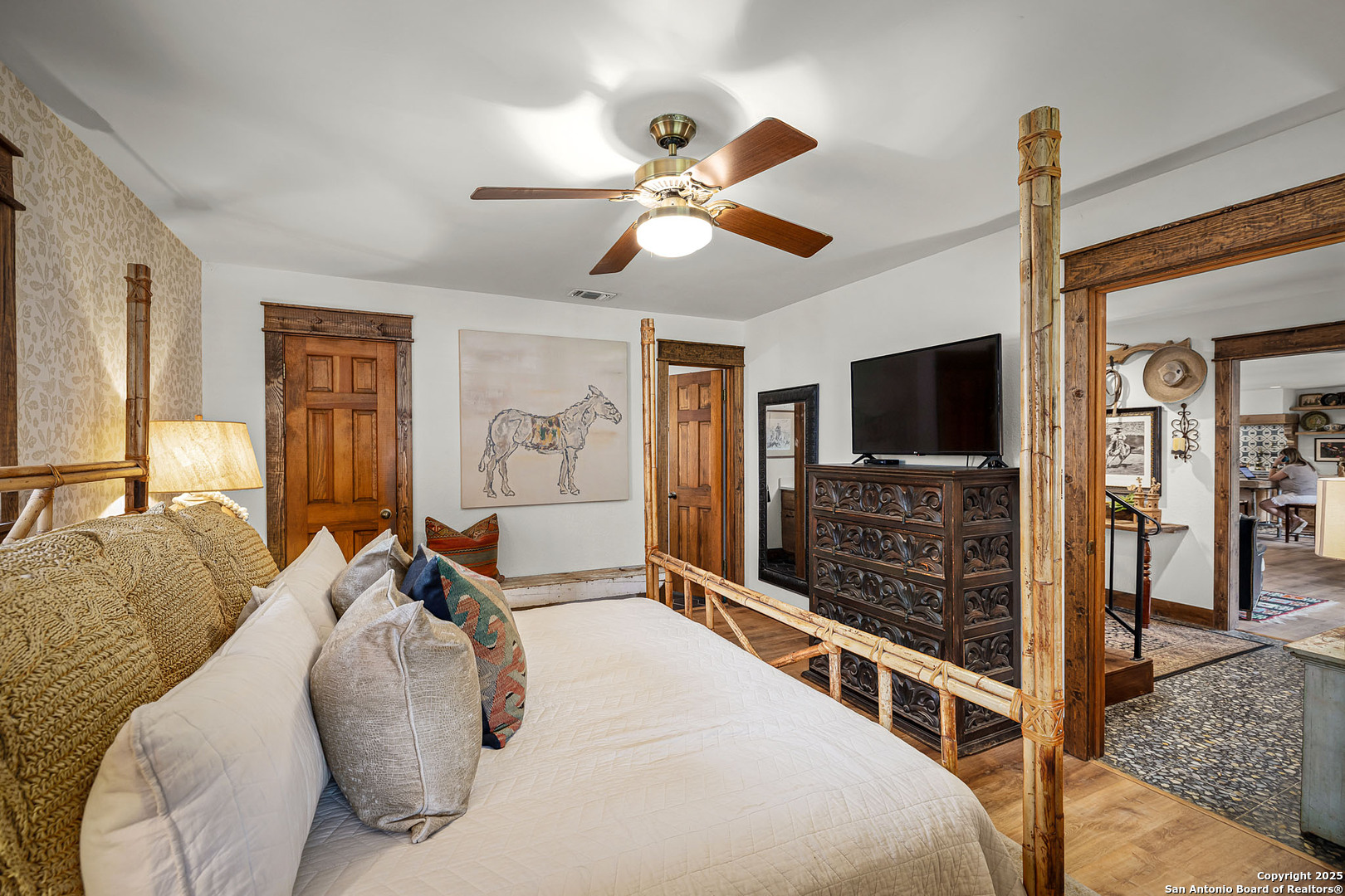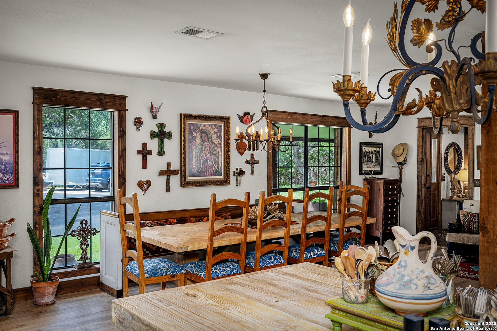 Experience Living at its best on 2.5 acres with a perfect blend of luxury, privacy, and convenience in the heart of Texas Hill Country. This recently remolded thoughtfully designed home blends rustic charm with refined luxury, featuring natural materials, top-tier finishes, and extensive outdoor living spaces ideal for entertaining. Entering the home is the terrazzo tile original to the house with exposed wooden beams that add warmth and architectural character to the house with Stucco interior walls which adds to the timeless elegance. The living room, kitchen and dining room have been opened up to create a very comfortable living space with a wood burning fireplace. The home has 4 bedrooms with the master being on the main floor with an on suite, upstairs are three bedrooms with a newly remolded bathroom. The gourmet kitchen has custom cabinetry, natural limestone pebble backsplash with natural limestone countertops. Professional-grade Z-line gas stove with pot filler and custom vent hood with Z-Line microwave drawer. The custom island allows room for seating while still plenty of room for cooking with an statement chandelier and European sconces for ambient lighting. The family room, formally the garage, was renovated in December of 2020. Which includes custom woodwork with beams and concreate floors. Off of the family room is a half bath with custom sink, custom wallpaper and European sconces. Outside provides a picturesque backdrop for entertainment and outdoor activities. The outdoor living spaces includes a pool with an outdoor kitchen with a built in BBQ grill with a mini-fridge, a firepit and plenty of room for relaxing. The property has no HOA so you can raise your AG/FFA projects at home with you. This is a house you don't want to slip by it is truly one of a kind.