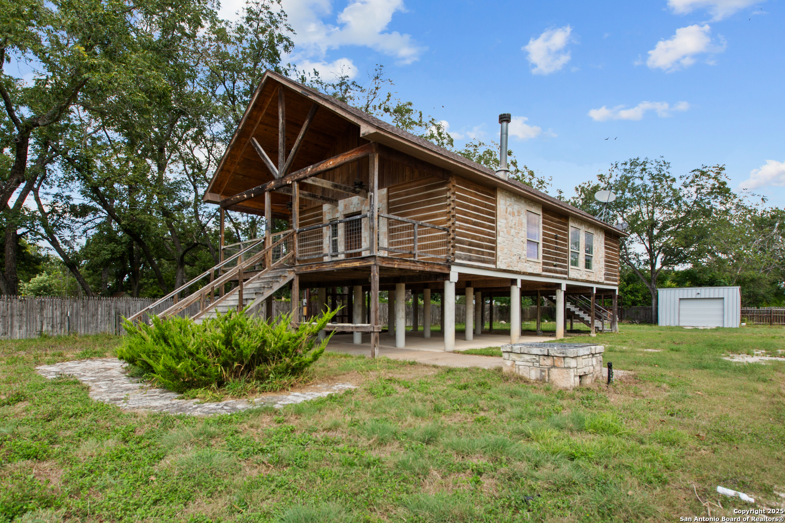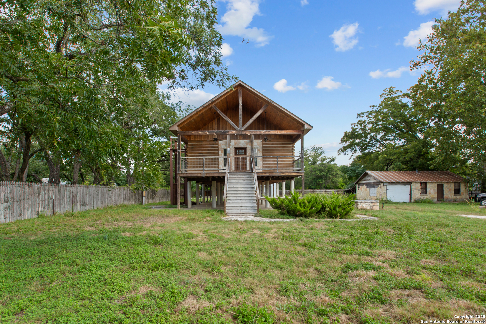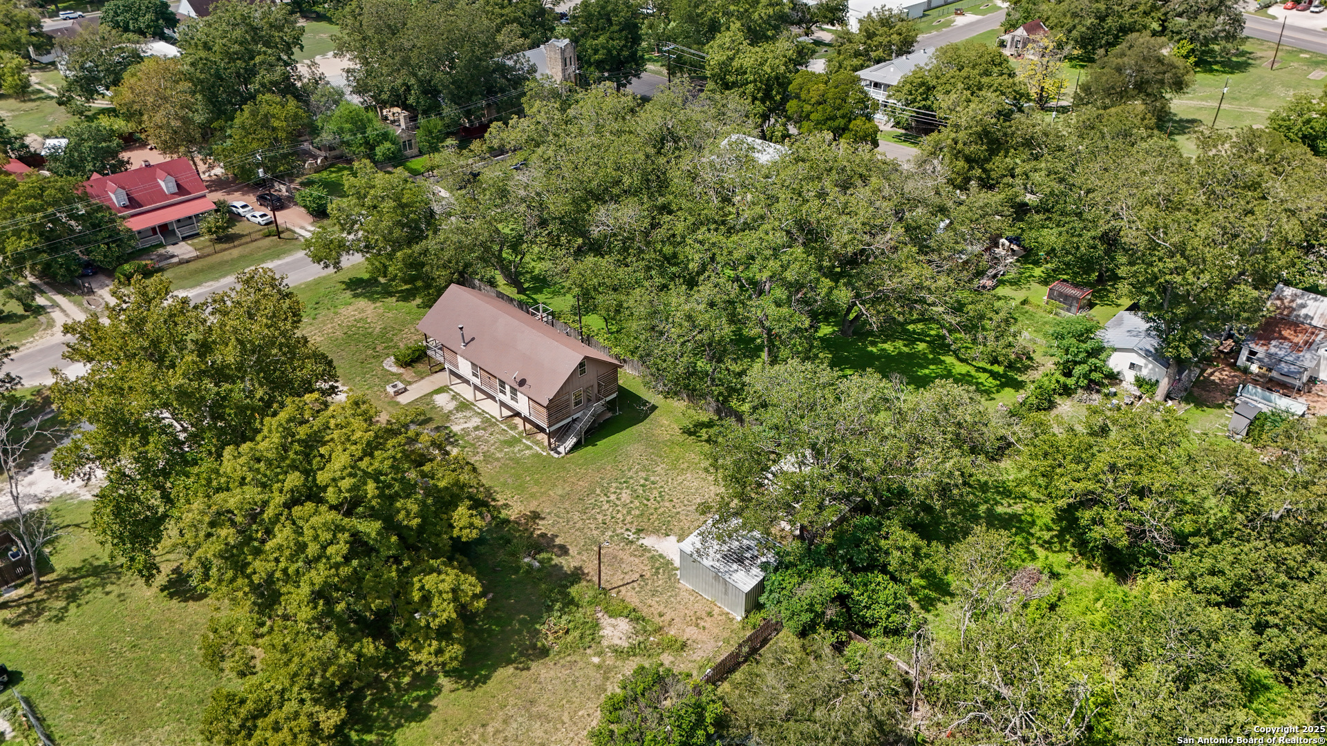 Rustic charm on the outside with a warm, cozy feel inside! The interior features a unique blend of log and drywall, creating a welcoming atmosphere. The open kitchen and dining area flow seamlessly into the living room, which connects to a spacious den-perfect for entertaining or easily converted into a third bedroom. The large primary suite offers a walk-in closet, and a second bedroom is located upstairs for added privacy. Vehicles can park underneath, with the option to enclose part or all of the pier area for storage, a workshop, or even a man cave. Nestled in the historic district and surrounded by mature trees, this home is within walking distance to downtown shops and dining.
