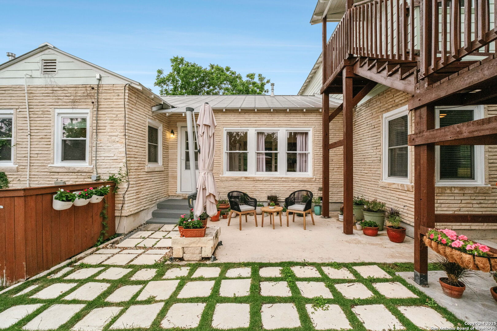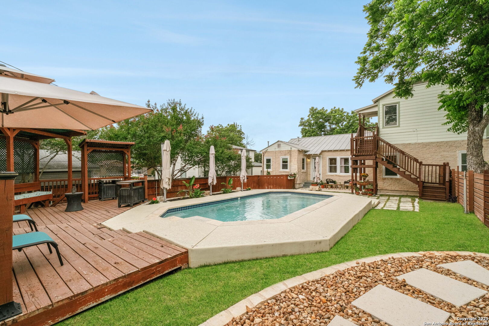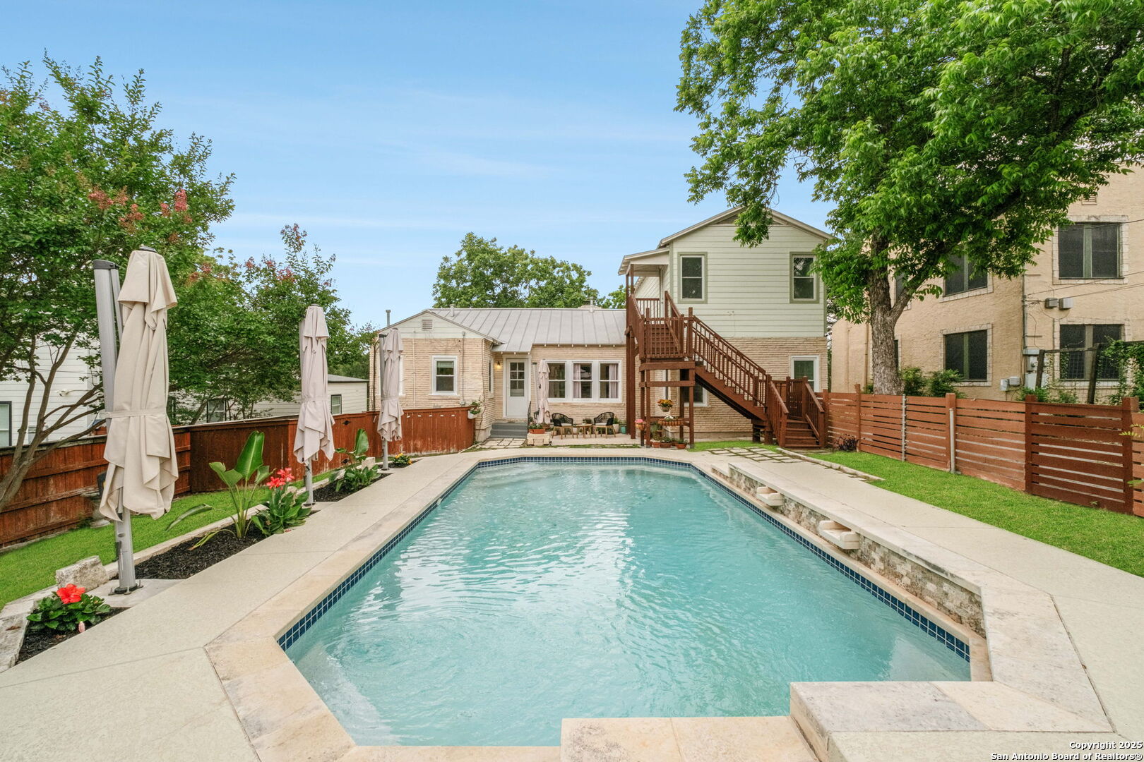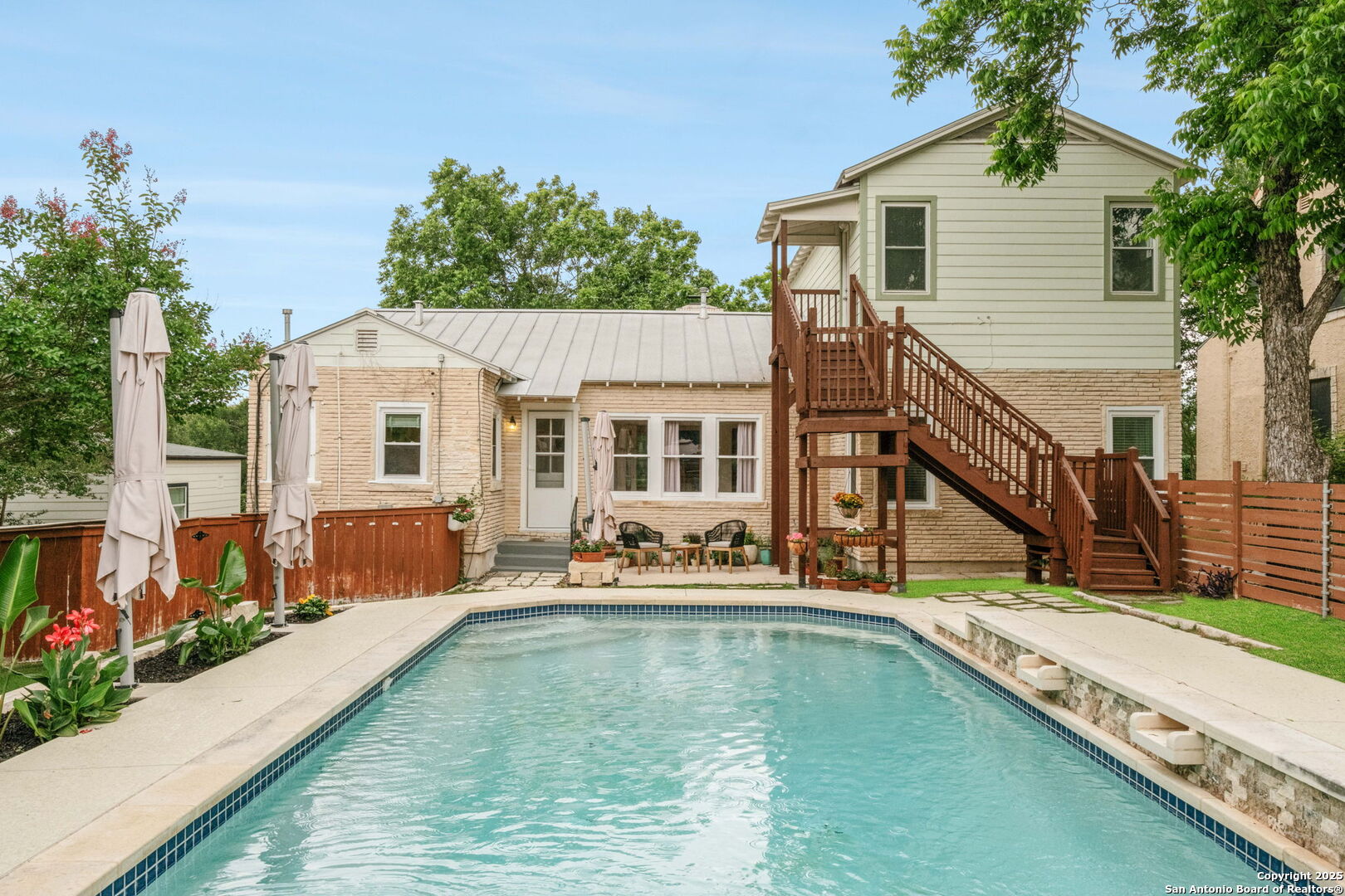 Welcome to this beautifully maintained home in the heart of the highly sought-after Mahncke Park neighborhood! Located directly across the street from the prestigious San Antonio Country Club and backing up directly to the San Antonio Botanical Gardens, this home offers unbeatable access to some of the city's top destinations. JBSA Ft. Sam Houston, the Historic Pearl, Brackenridge Park, the Witte Museum, shopping and dining on Broadway; all are just minutes away. When you are not enjoying the local entertainment - enjoy a refreshing dip in your amazing backyard POOL! One of the few in Mahcke Park! From the classic front porch step inside this 3 bedroom, 2 bath home and be greeted by timeless character and warmth. Gleaming original hardwood floors flow throughout the home, complemented by abundant natural light and a cozy fireplace, perfect for relaxing evenings at home. Two bedrooms and one bathroom reside on the bottom floor. On the second floor, via a private entrance, you will find one spacious bedroom, a full bath, and extra upstairs second living area. This offers exceptional flexibility. It can be used as a guest suite, home office, or potential rental income opportunity or with addition of a closet easily a fourth bedroom. In the past this was a separate rental - and can also be restored easily to a one-bedroom apartment. As mentioned, the paradise-style patio features an inground swimming pool, multiple seating areas, and a tranquil stone walkways, ideal for hosting gatherings or simply unwinding in a private retreat-like setting. With its prime central location, thoughtful updates, and flexible floor plan, this home offers a unique lifestyle opportunity in one of San Antonio's most beloved neighborhoods. Don't miss your chance to own a piece of classic San Antonio charm and experience the unmatched character and convenience this home has to offer.