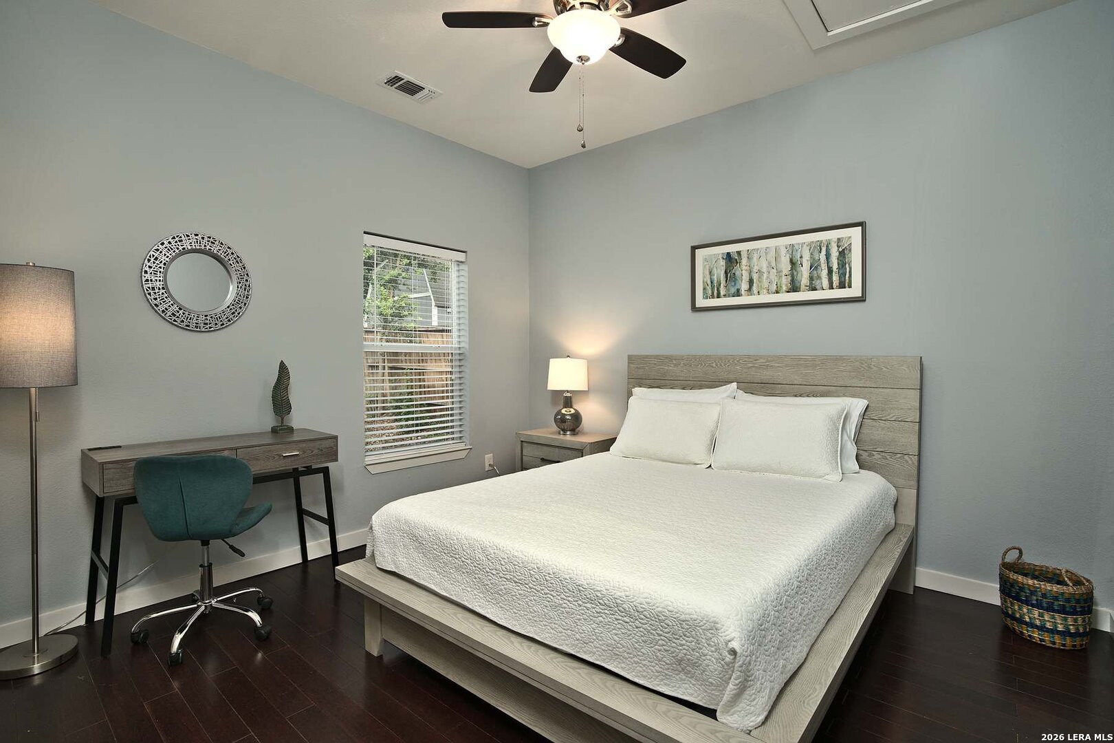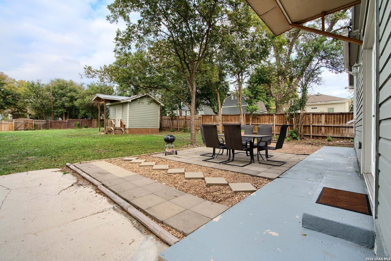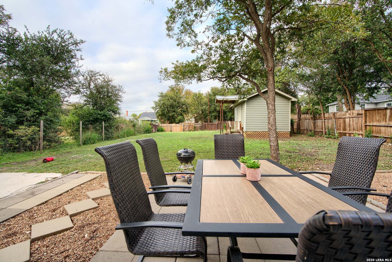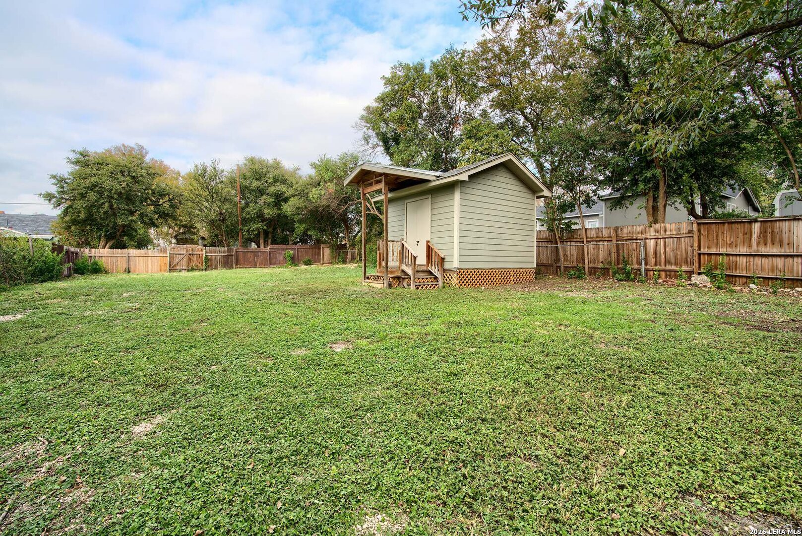 Located in the highly sought-after Dignowity Hill neighborhood, just 0.3 miles from the iconic Hays Street Bridge, this home offers walkable access to top dining, shops, and entertainment. Situated on an oversized 0.26-acre lot, the property provides generous outdoor space rarely found in this area-perfect for relaxing, entertaining, or enjoying added privacy. Inside, the home features high ceilings and an open-concept layout with ceramic tile and wood flooring, a clean, timeless color palette, and thoughtfully selected finishes throughout. The kitchen is well-appointed with ample cabinetry and a large island, ideal for everyday living and hosting. The bedrooms are positioned on separate hallways for added privacy, each offering spacious closets. The primary bathroom includes a double vanity and upgraded walk-in shower, while the secondary bathroom features a tub-shower combination. A standing seam metal roof enhances durability and curb appeal. Enjoy views of downtown San Antonio from the inviting front porch, or take advantage of the expansive backyard, storage shed, and gated parking pad. Offered fully furnished, this home is a turnkey leasing opportunity in one of San Antonio's most vibrant and historic neighborhoods.