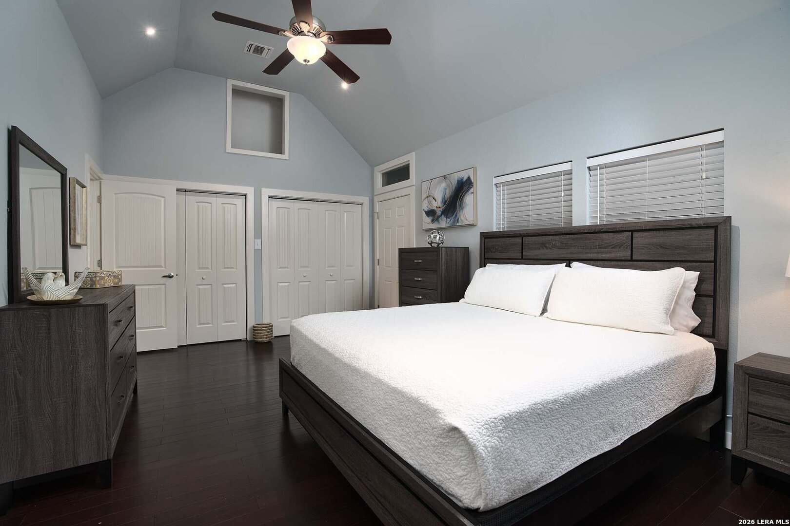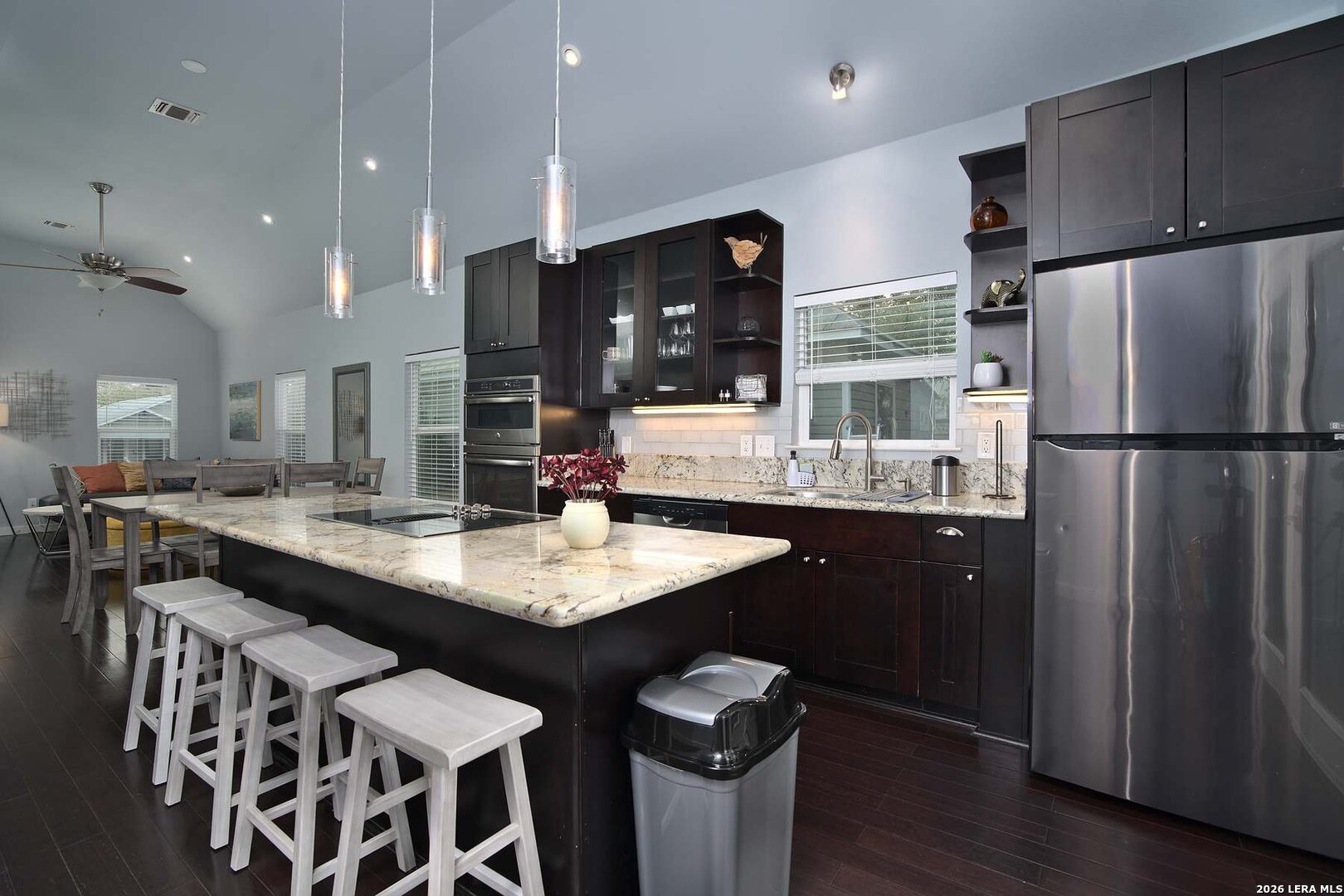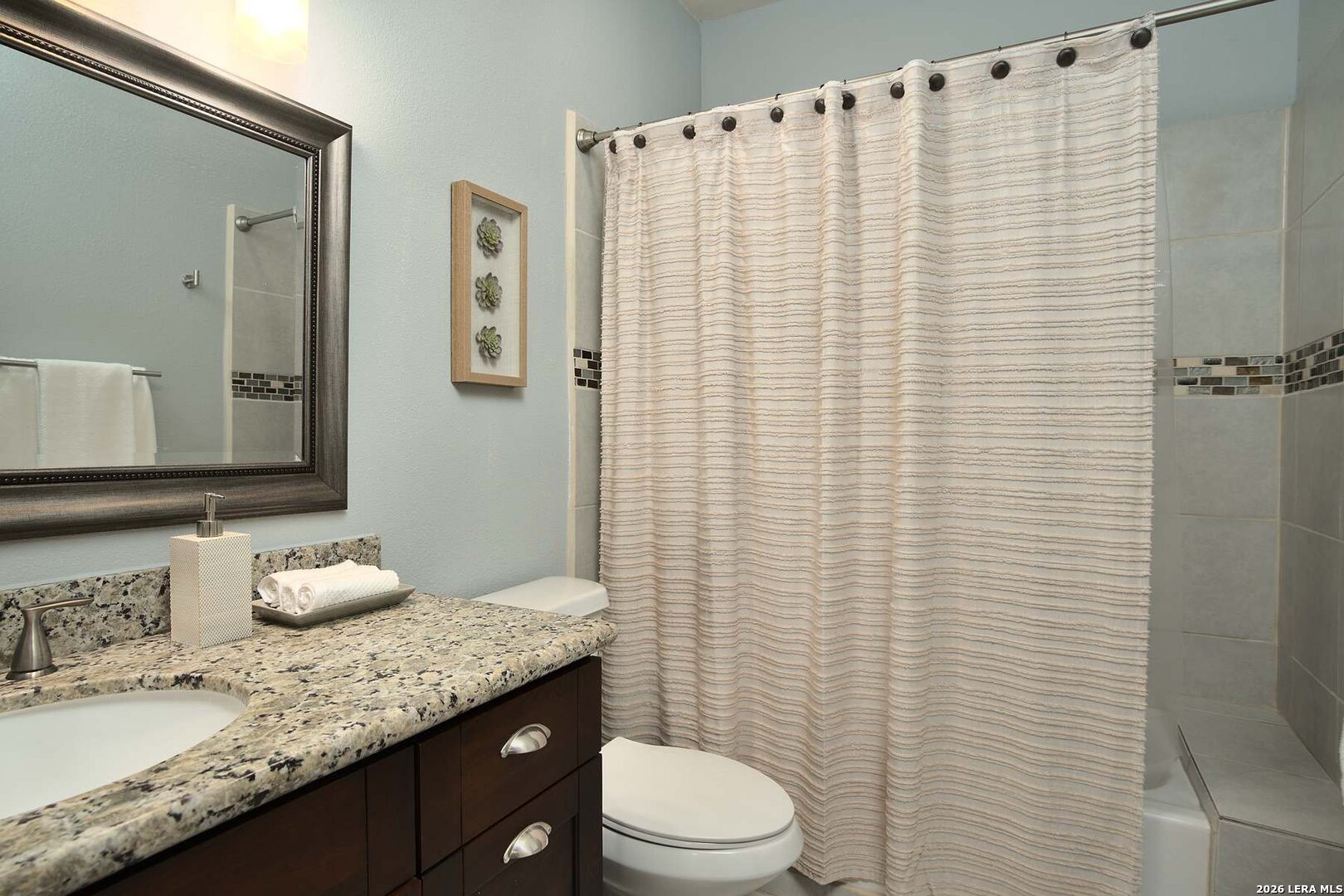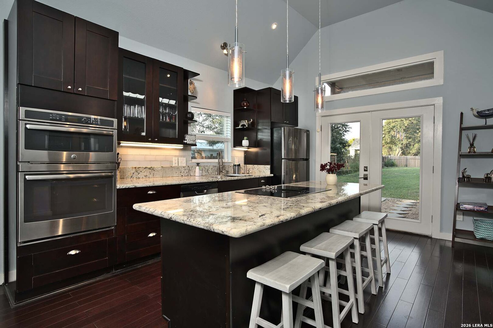 Located in the highly sought-after Dignowity Hill neighborhood, just 0.3 miles from the iconic Hays Street Bridge, this home offers walkable access to top dining, shops, and entertainment. Situated on an oversized 0.26-acre lot, the property provides generous outdoor space rarely found in this area-perfect for relaxing, entertaining, or enjoying added privacy. Inside, the home features high ceilings and an open-concept layout with ceramic tile and wood flooring, a clean, timeless color palette, and thoughtfully selected finishes throughout. The kitchen is well-appointed with ample cabinetry and a large island, ideal for everyday living and hosting. The bedrooms are positioned on separate hallways for added privacy, each offering spacious closets. The primary bathroom includes a double vanity and upgraded walk-in shower, while the secondary bathroom features a tub-shower combination. A standing seam metal roof enhances durability and curb appeal. Enjoy views of downtown San Antonio from the inviting front porch, or take advantage of the expansive backyard, storage shed, and gated parking pad. Offered fully furnished, this home is a turnkey leasing opportunity in one of San Antonio's most vibrant and historic neighborhoods.