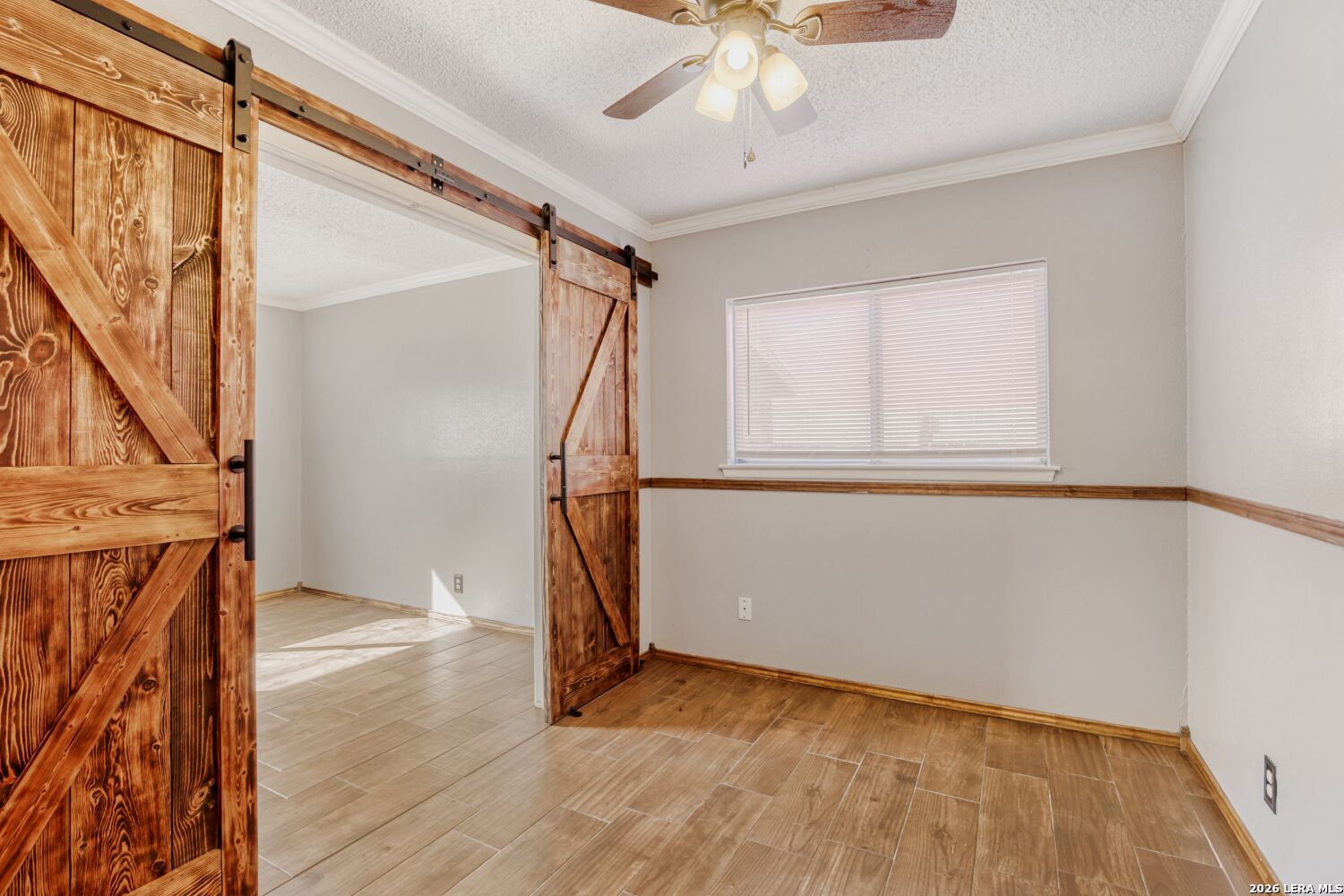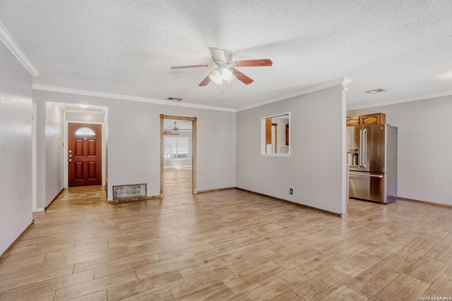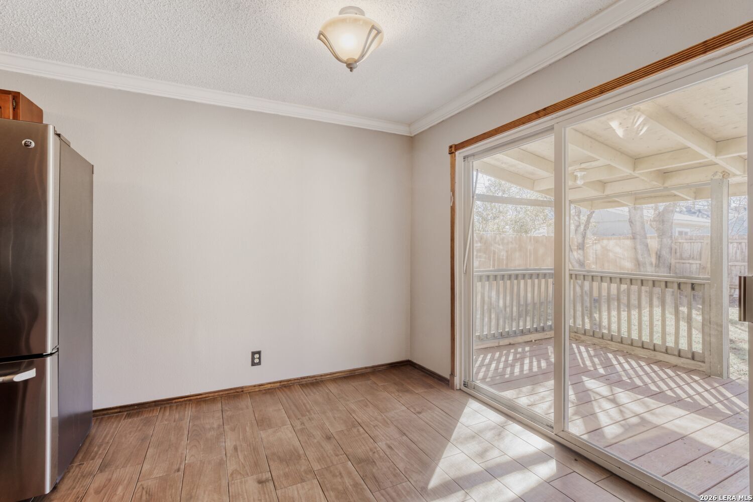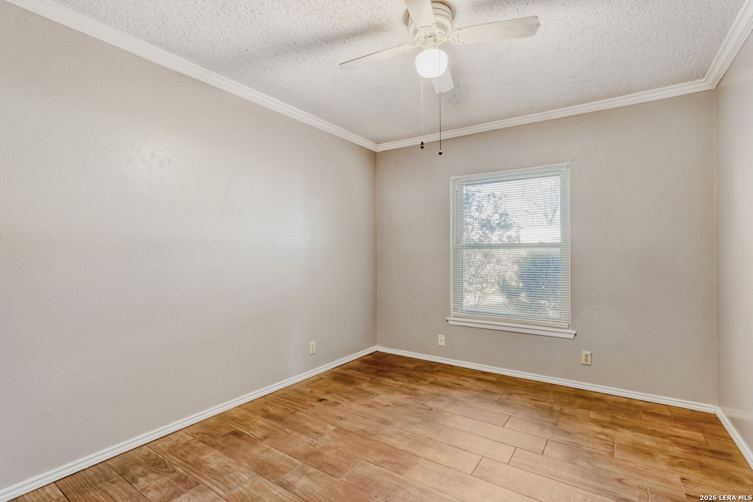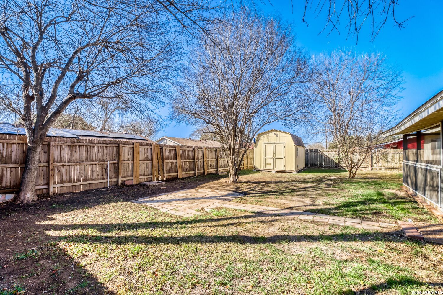 This well-maintained and spacious 4-bedroom, 2-bath home offers a comfortable layout with two generous living areas with a thoughtful refresh. Hardwood flooring flows through the living room, hallway, and bedrooms, complemented by elegant crown molding and custom built-in shelving. The inviting living room features a cozy wood-burning fireplace, perfect for relaxing evenings. Major updates include a roof replacement in 2012, front windows replaced in 2015, and foundation repair with a lifetime transferable warranty for added peace of mind. Step outside to enjoy the covered back patio and deck, charming garden gazebo areas, and a large 19x20 storage building with extra storage space. Conveniently located near Fort Sam Houston, Randolph Air Force Base, Loop 410, IH-35, and IH-10, this home offers both comfort and accessibility in a prime location. Don't miss this gem. Check it out today and make it yours!