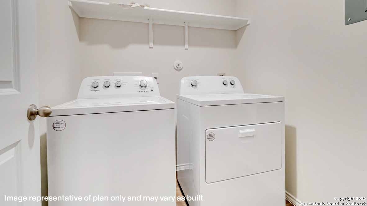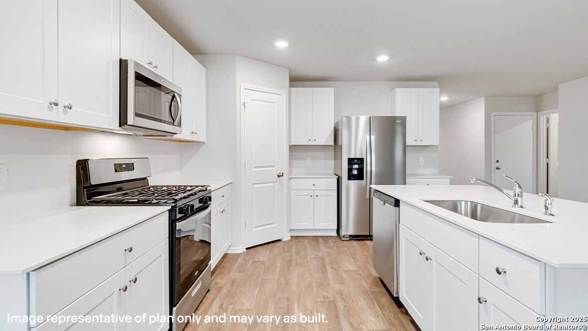 Step into The Tobin floorplan at Riverstone at Westpointe in San Antonio, TX, a single-story home featuring 3 bedrooms and 2 bathrooms. The Tobin also offers 2 classic exterior with siding, a 1-car garage and 1412 square feet of comfortable living space. The Tobin features an open-concept layout that blends seamlessly to creat the perfect every day space designed with you in mind. An elongated foyer leads you to the kitchen and dining space before flowing into a grand living room. The kitchen features quartz countertops, gleaming stainless steel appliances, shaker style cabinets and an eat-in bar that overlooks the dining area. Your main bedroom suite is located off the living area toward the back of the home and includes a walk-in closet and a relaxing bathroom space. The ensuite bathroom includes a single vanity sink with a spacious quartz counter top, shaker style cabinets and combined shower and bathtub. You'll find quality carpet and spacious closets in all of your secondary bedrooms, located off the front foyer of the home. Use these rooms as offices, playrooms or other bonus spaces. Head out the back door located off the living room to find a fully landscaped yard with a state-of-the-art irrigation system. Additional features include sheet vinyl flooring in entry, living room, and all wet areas, quartz counter tops in all bathrooms and our HOME IS CONNECTED base package. Using one central hub that talks to all the devices in your home, you can control the lights, thermostat and locks, all from your cellular device.