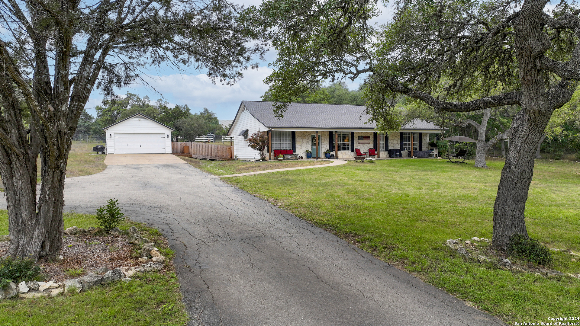 Almost 3 acres! Super cute home on a double lot!! Recent updates and upgrades include roof, HVAC, interior paint and flooring in kitchen (comes with flooring for the rest of the entire home) Custom Kitchen cabinets!! Unique hardwood countertops! Covered porches front and back! Completely high fenced and cross fenced! 24x30 metal shop/building, animal loafing pen for horses or turn into a chicken coop! Come see this special home today!