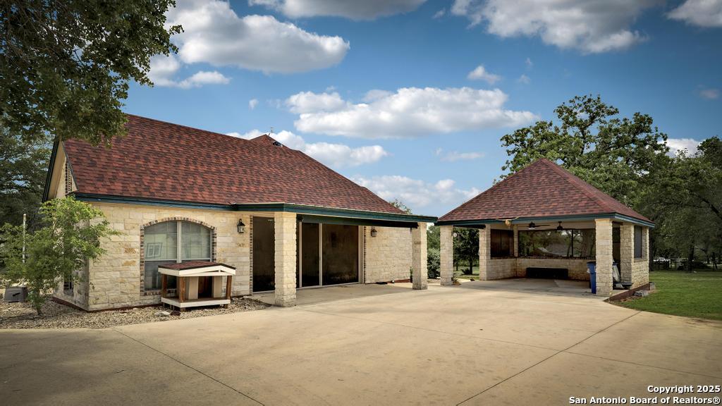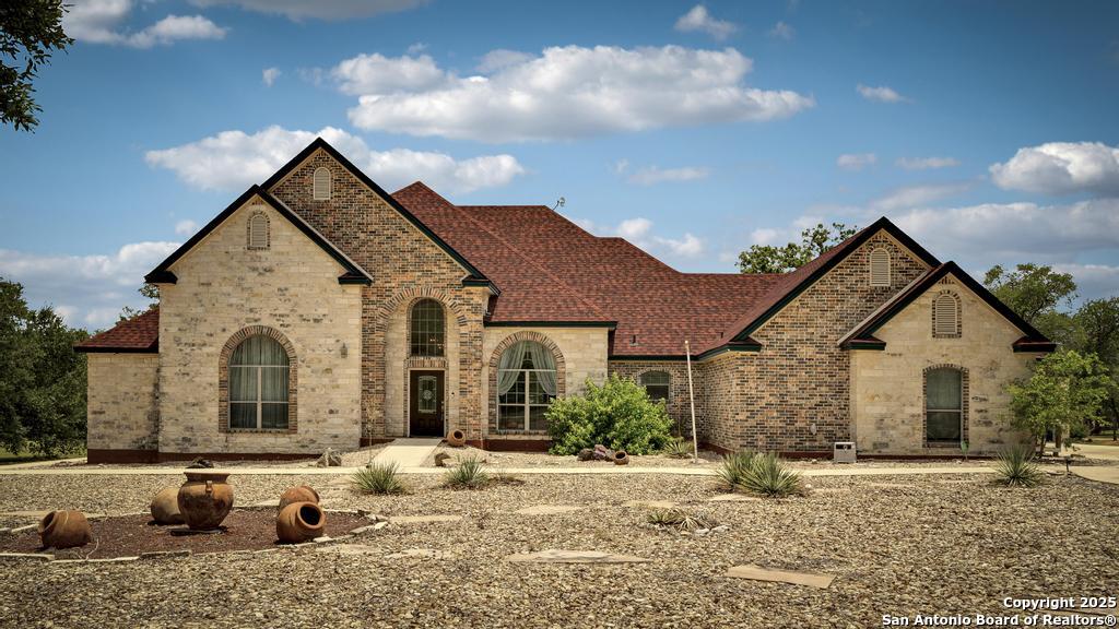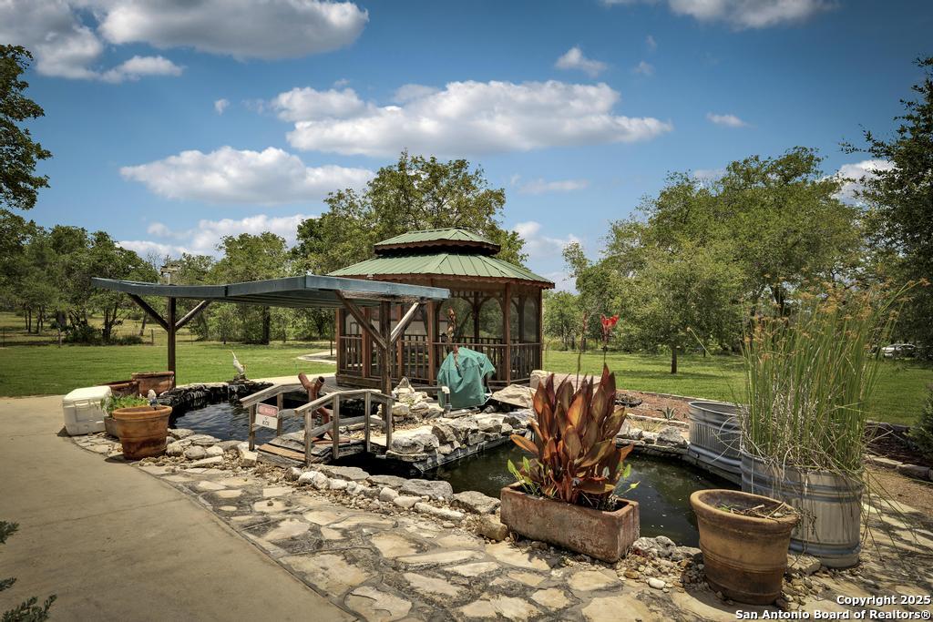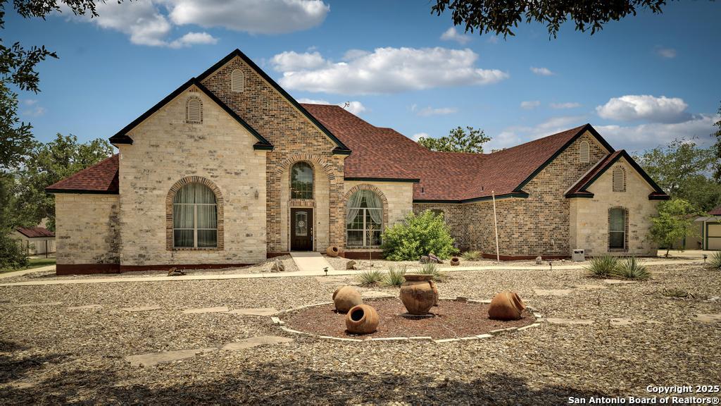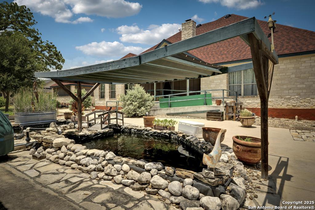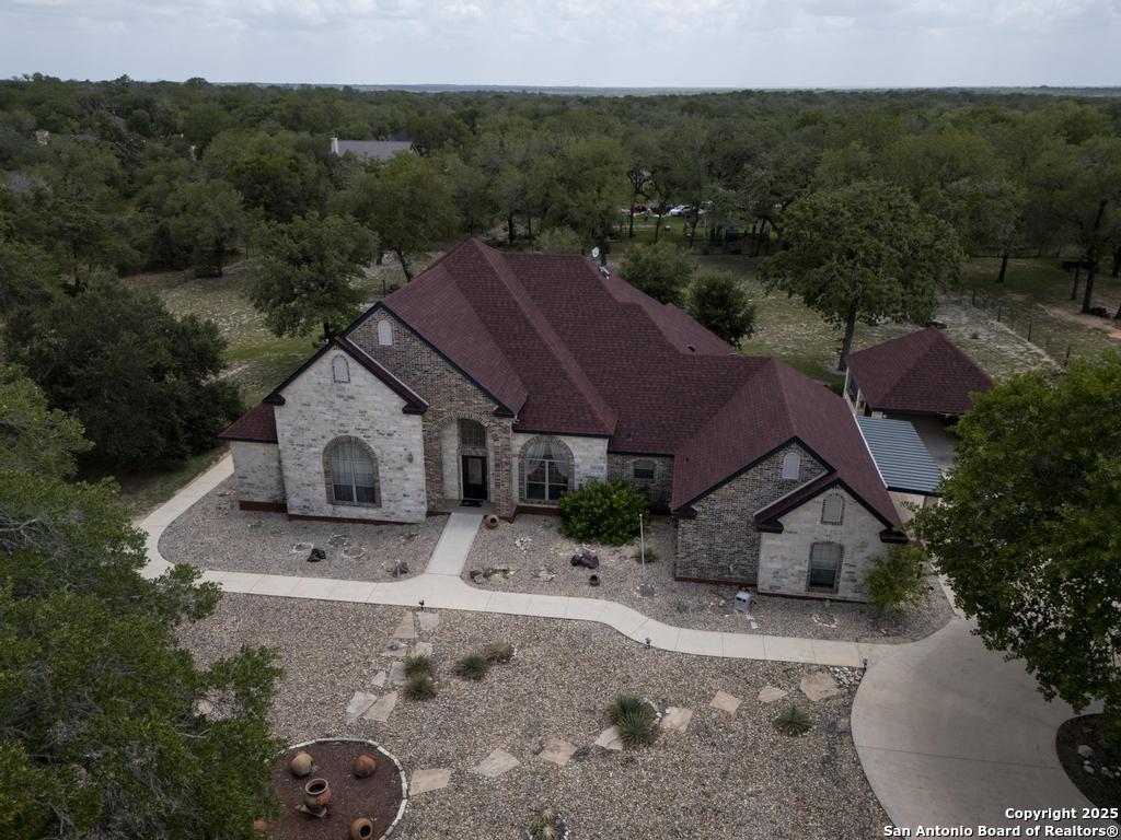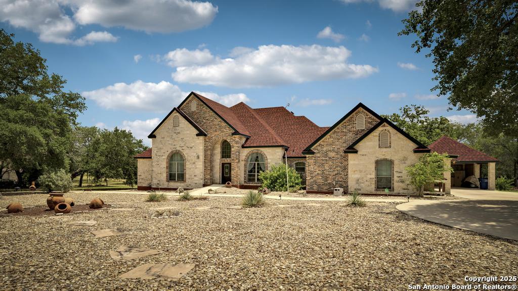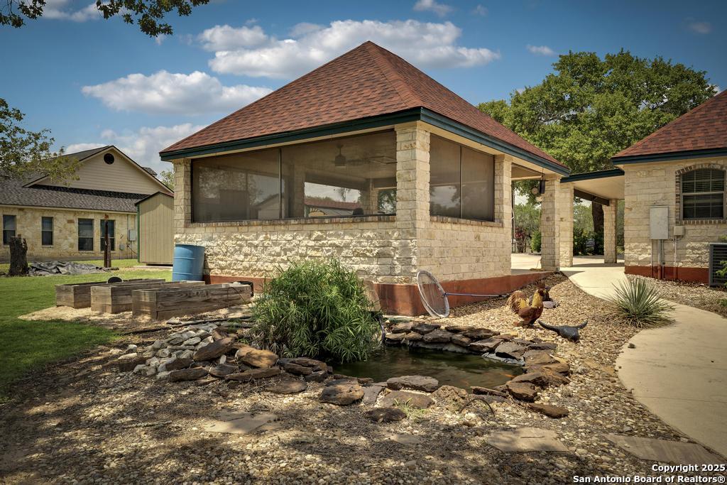 Stunning rock and brick home set on nearly two fully fenced, oak-studded acres in the peaceful Rosewood community. A circular drive welcomes you to this private retreat featuring vaulted ceilings, wood-look tile flooring throughout, and a striking rock wood-burning fireplace with dual ceiling fans in the living room. Enjoy smart living with Alexa-enabled lighting and recessed fixtures. The split primary suite offers French doors leading to a screened-in patio, while the spacious family room flows into an island kitchen with a stainless steel vent hood and oversized pantry. Additional highlights include newer roof, hvac systems and water heater (2022), three outdoor storage sheds, two serene ponds with Koi and Sambuca fish, and a relaxing pergola. Wall-mounted TVs convey in multiple rooms-including the garage-and there's even a private office or workspace just off the garage. A one-of-a-kind property combining detail, space, and smart functionality!