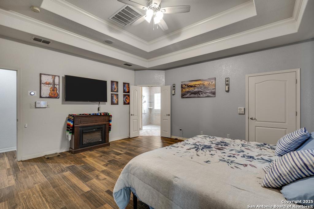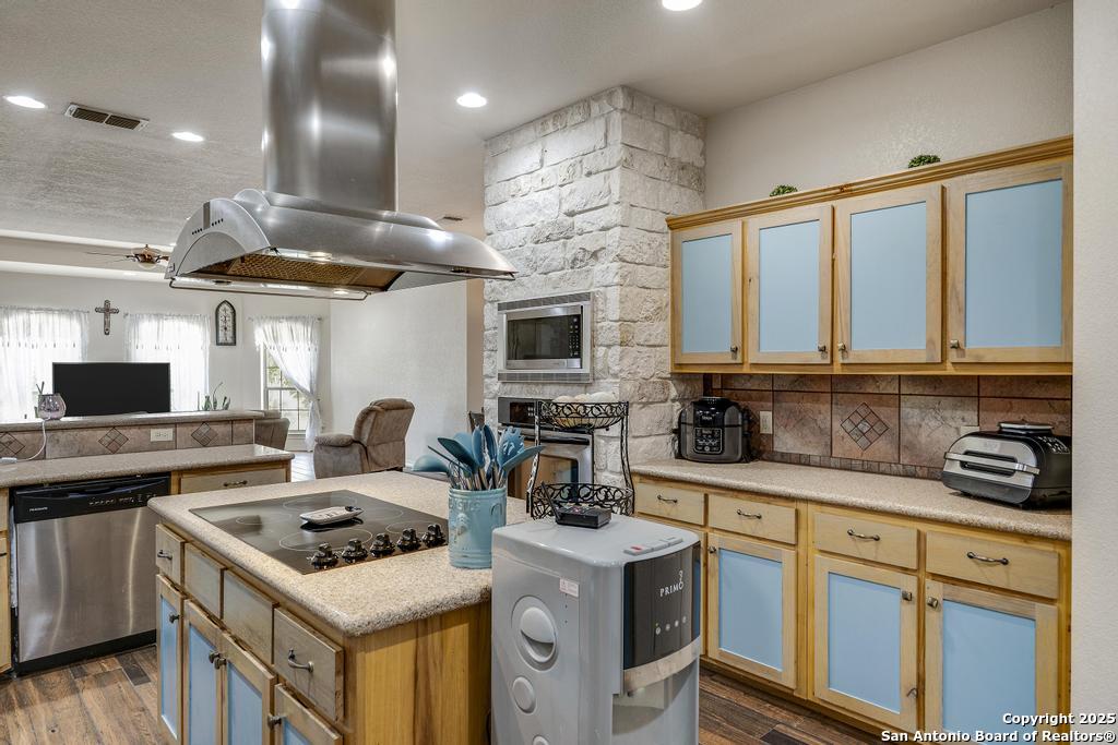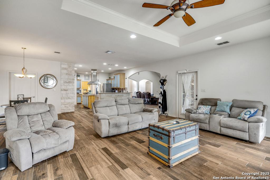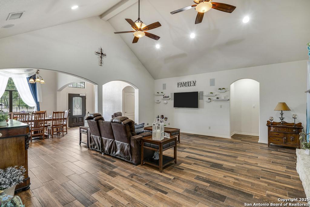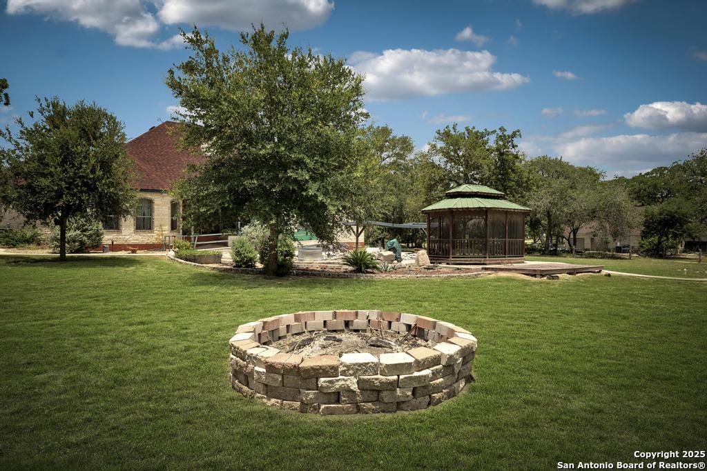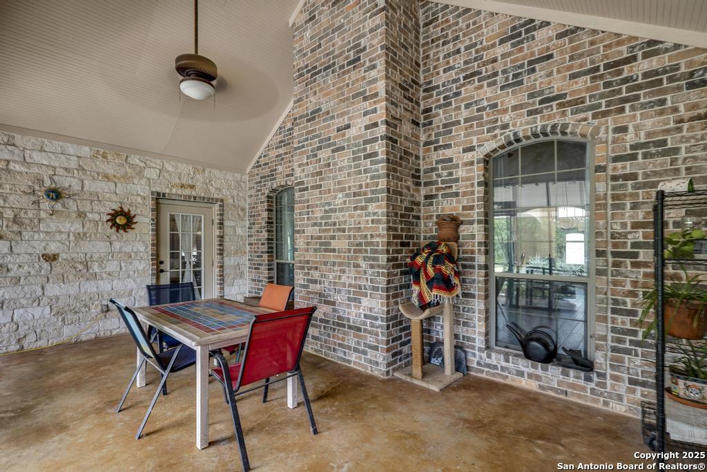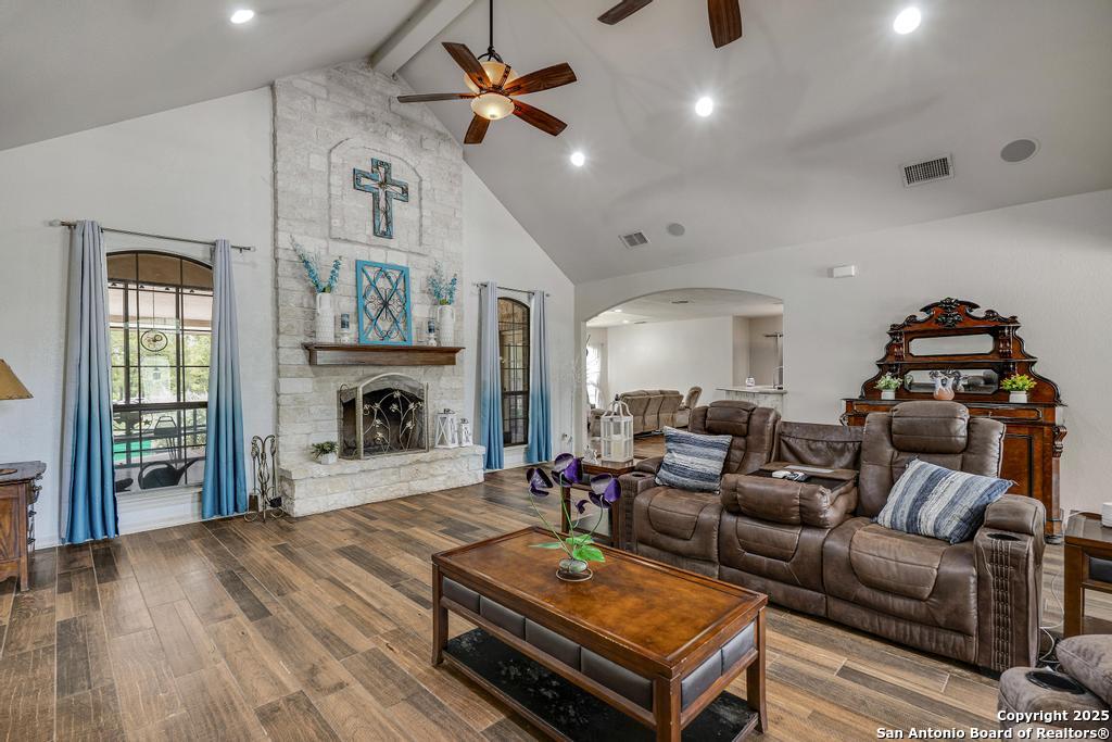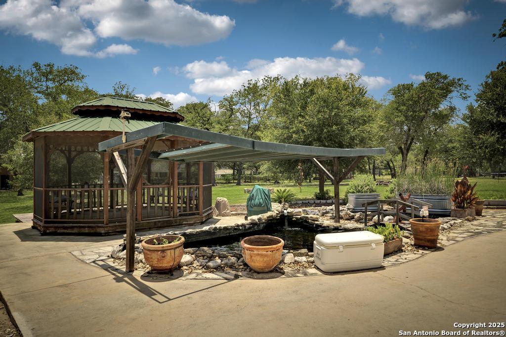 Stunning rock and brick home set on nearly two fully fenced, oak-studded acres in the peaceful Rosewood community. A circular drive welcomes you to this private retreat featuring vaulted ceilings, wood-look tile flooring throughout, and a striking rock wood-burning fireplace with dual ceiling fans in the living room. Enjoy smart living with Alexa-enabled lighting and recessed fixtures. The split primary suite offers French doors leading to a screened-in patio, while the spacious family room flows into an island kitchen with a stainless steel vent hood and oversized pantry. Additional highlights include newer roof, hvac systems and water heater (2022), three outdoor storage sheds, two serene ponds with Koi and Sambuca fish, and a relaxing pergola. Wall-mounted TVs convey in multiple rooms-including the garage-and there's even a private office or workspace just off the garage. A one-of-a-kind property combining detail, space, and smart functionality!