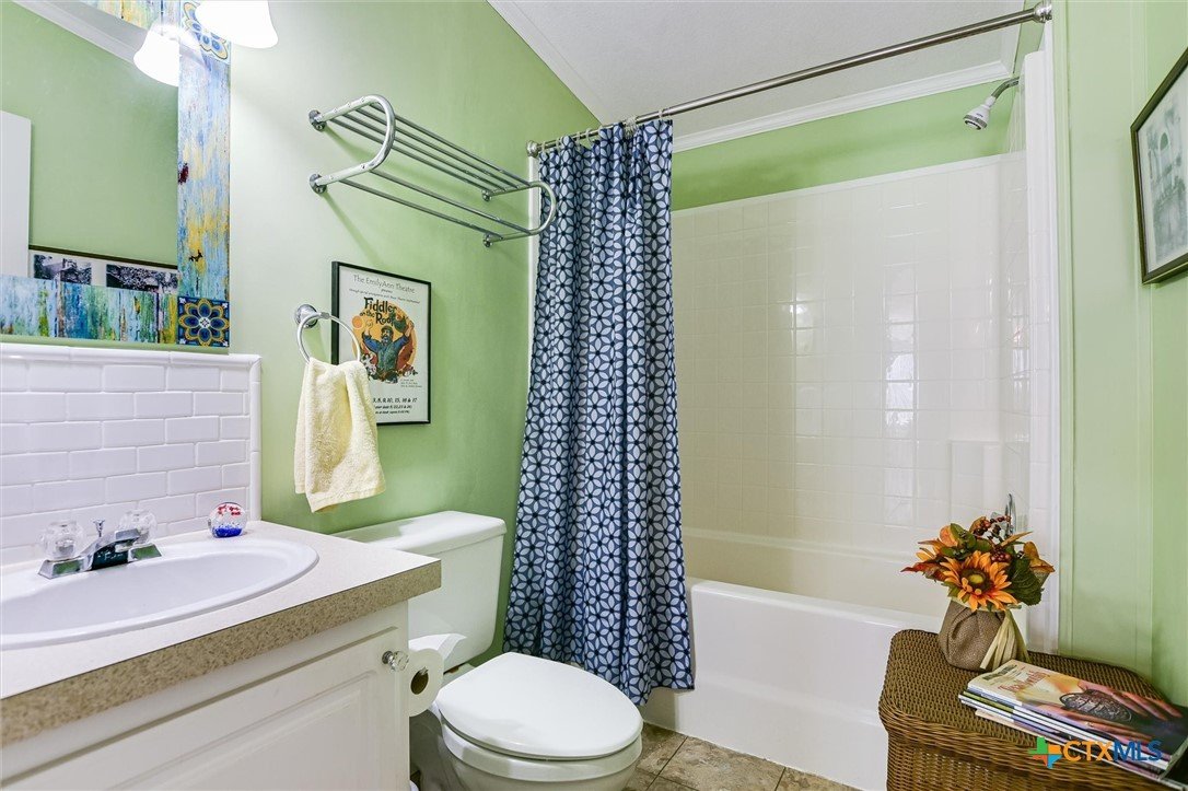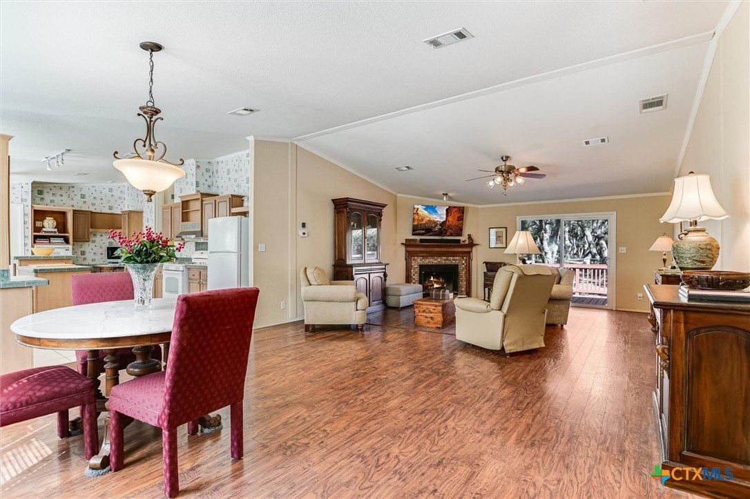 Nicely maintained manufactured home nestled among mature oak trees on 5.79 fully fenced acres. This inviting 3-bed, 2-bath home offers an open-concept layout with a spacious kitchen featuring a center island, gas range, built-in desk, and a sunny eat-in dining area. The living and formal dining rooms showcase peaceful views of the oaks and include a cozy wood-burning fireplace. Enjoy outdoor living on both the front and back decks. Additional features include a laundry room, a detached 2-car carport, and a large metal shop situated toward the back of the property—ideal for storage, hobbies, or workspace. The property also includes a small (currently dry) pond, hot tub on back deck, a fenced backyard, and a garden area. Experience quiet, scenic Hill Country living just minutes from town.