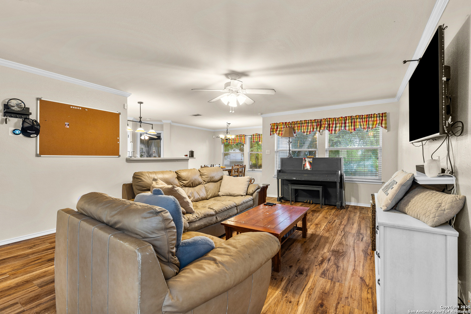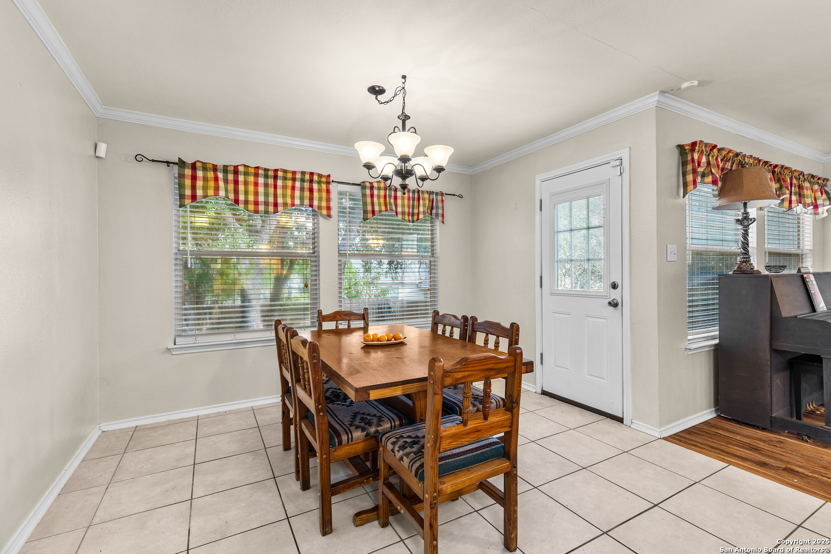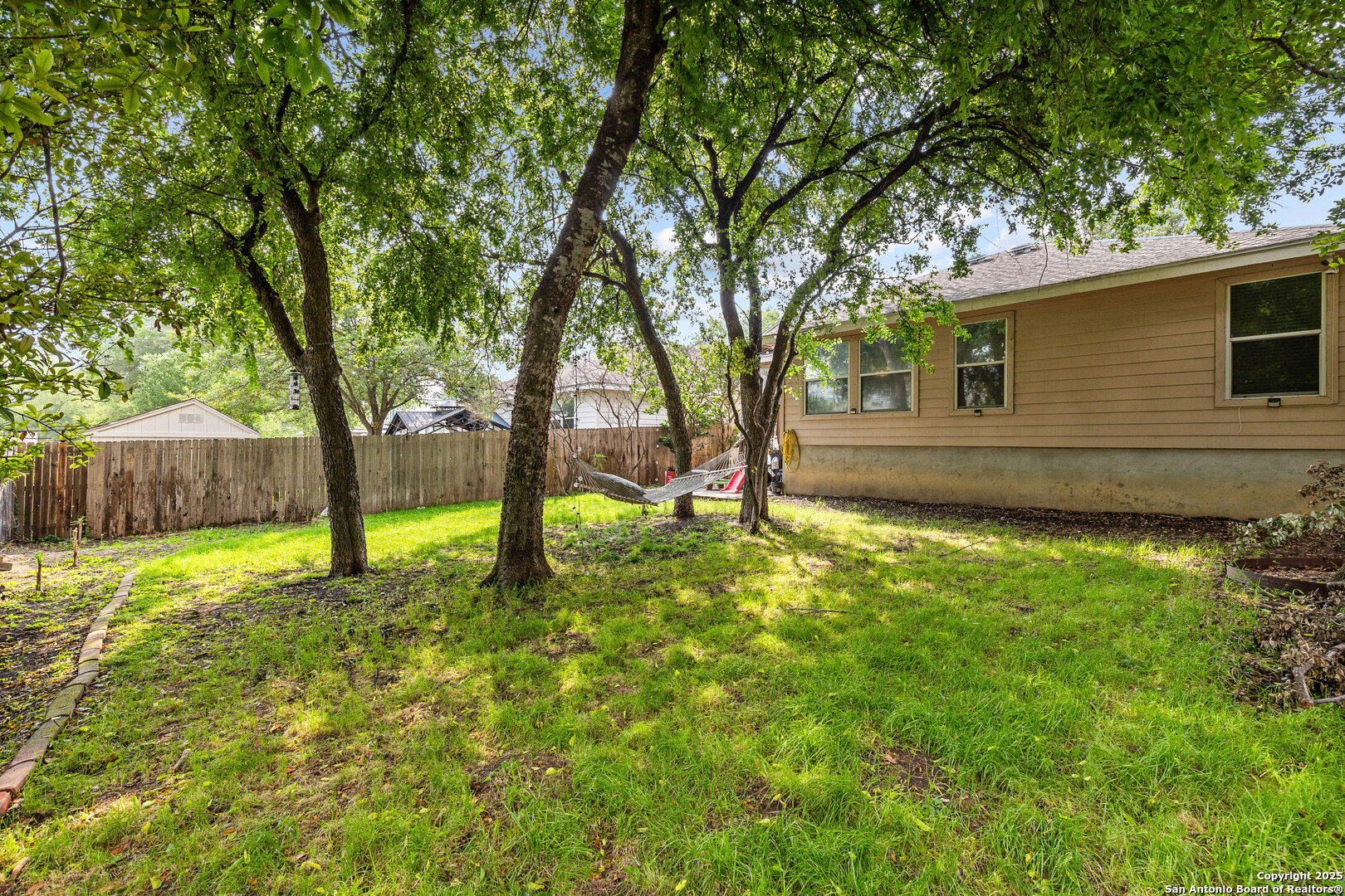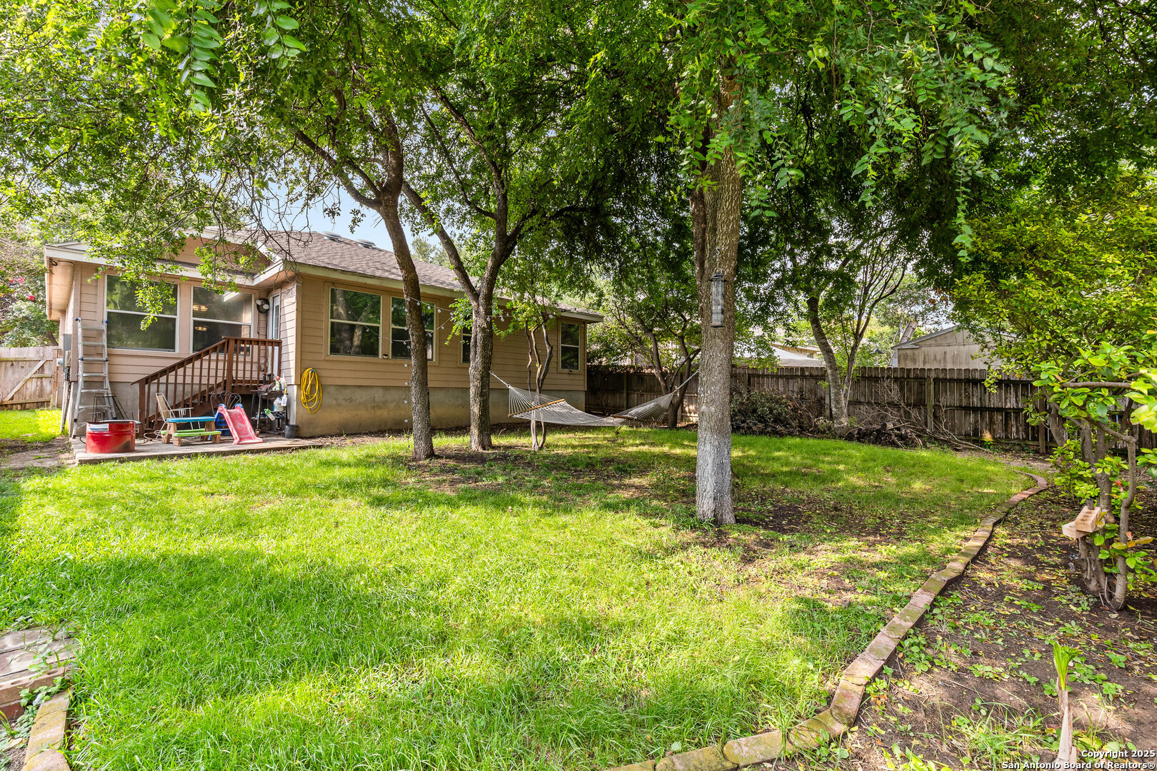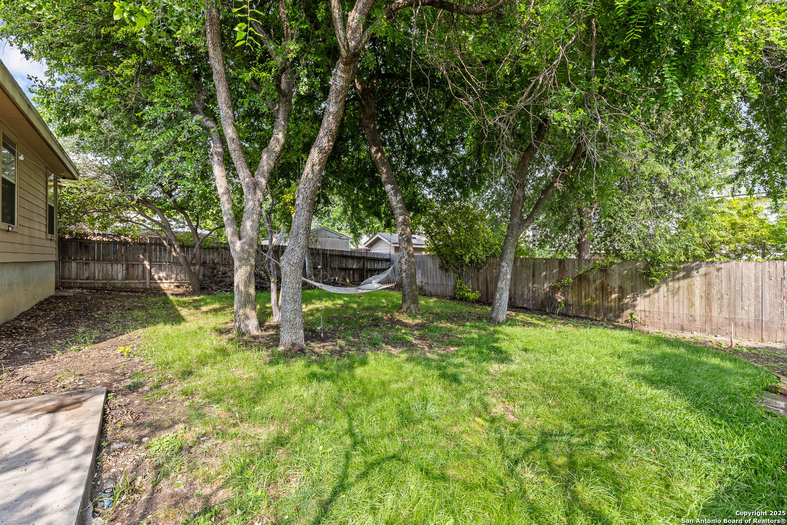 Welcome to this beautifully cared-for home, where curb appeal meets comfort. Nestled in a highly desirable neighborhood, the property features mature shade trees and thoughtfully designed landscape lighting that creates a warm, welcoming glow in the evenings. Inside, the home offers a clean, carpet-free interior with stylish wood laminate and tile flooring throughout. Crown molding and large windows enhance the space with natural light and peaceful views of the private backyard. The flexible dining area features a custom built-in, making it perfect for entertaining, a home office, or a study. The spacious primary suite offers a relaxing retreat with serene views of the backyard, adding to the home's tranquil feel. Located just minutes from Loop 1604, I-35, Hwy 281, H-E-B, and an array of shopping and dining destinations, and within walking distance to top-rated schools - this home offers both convenience and lifestyle. Don't miss your opportunity to own this well-maintained gem in one of the area's most sought-after communities!