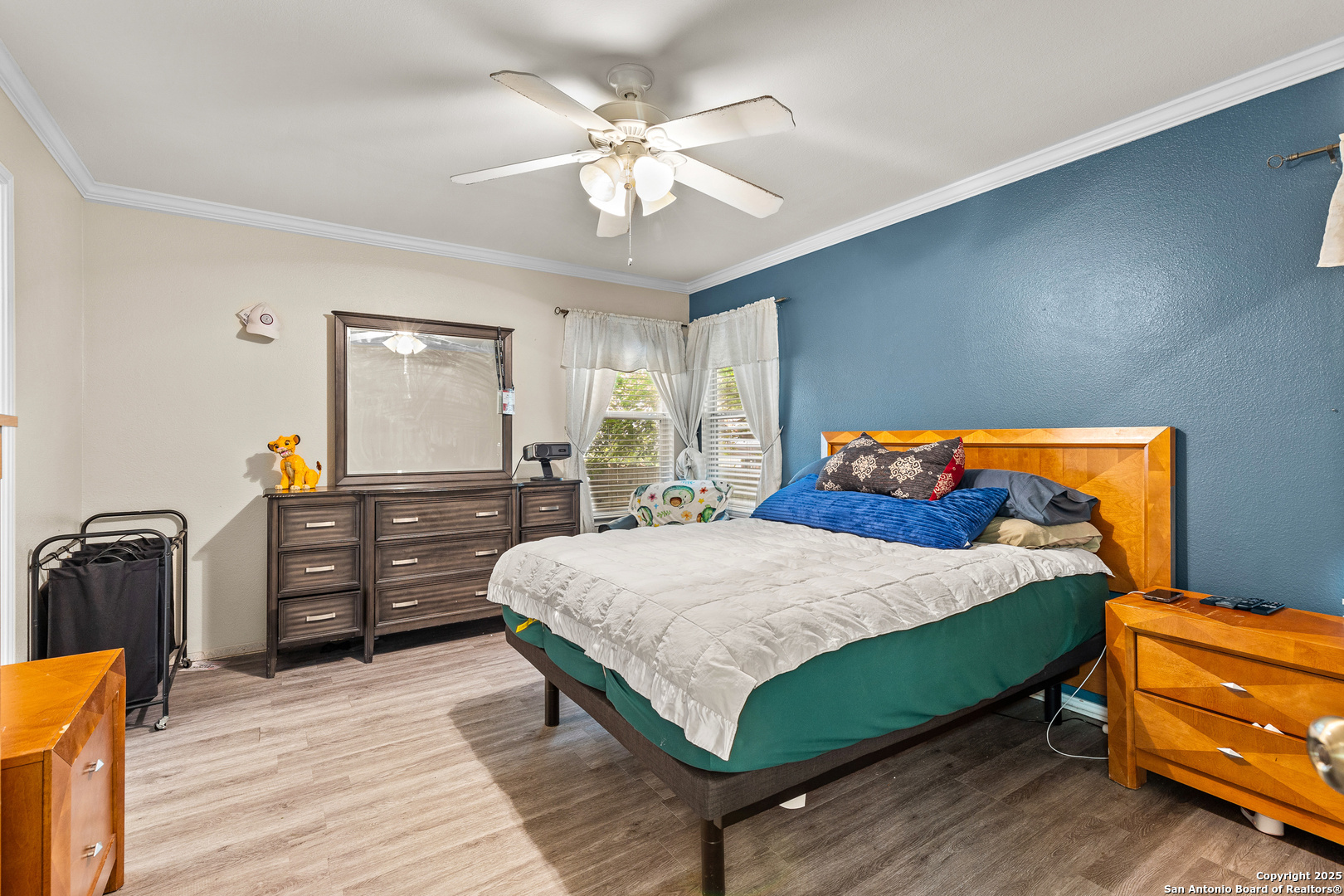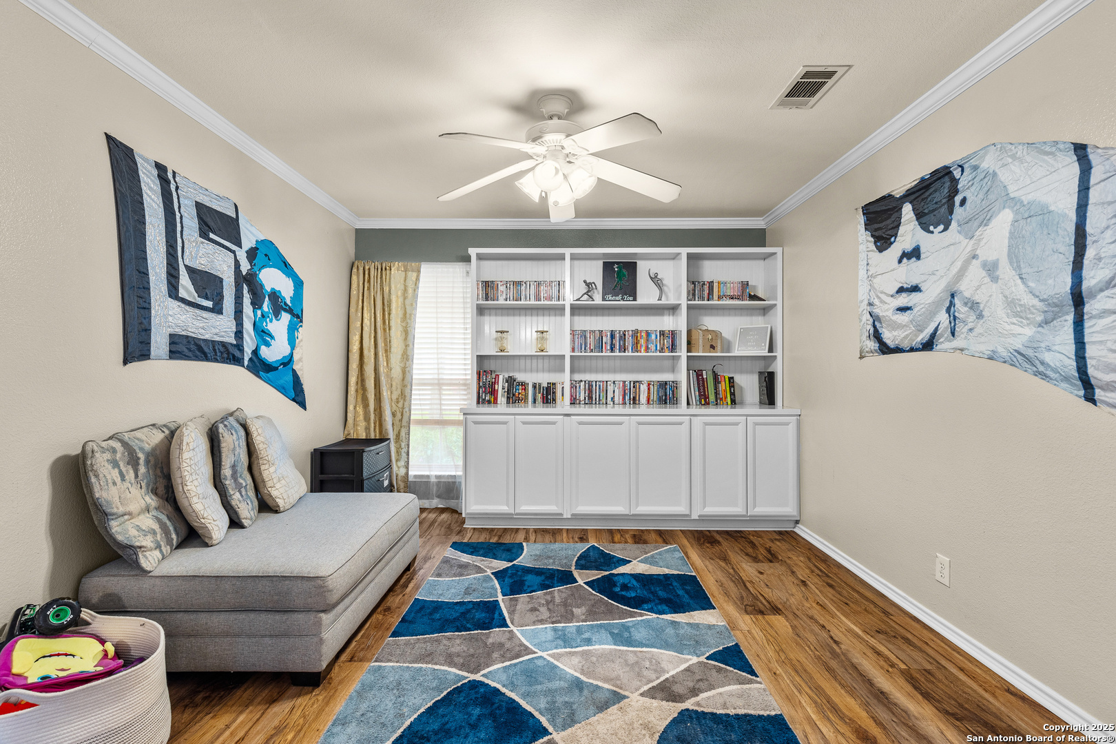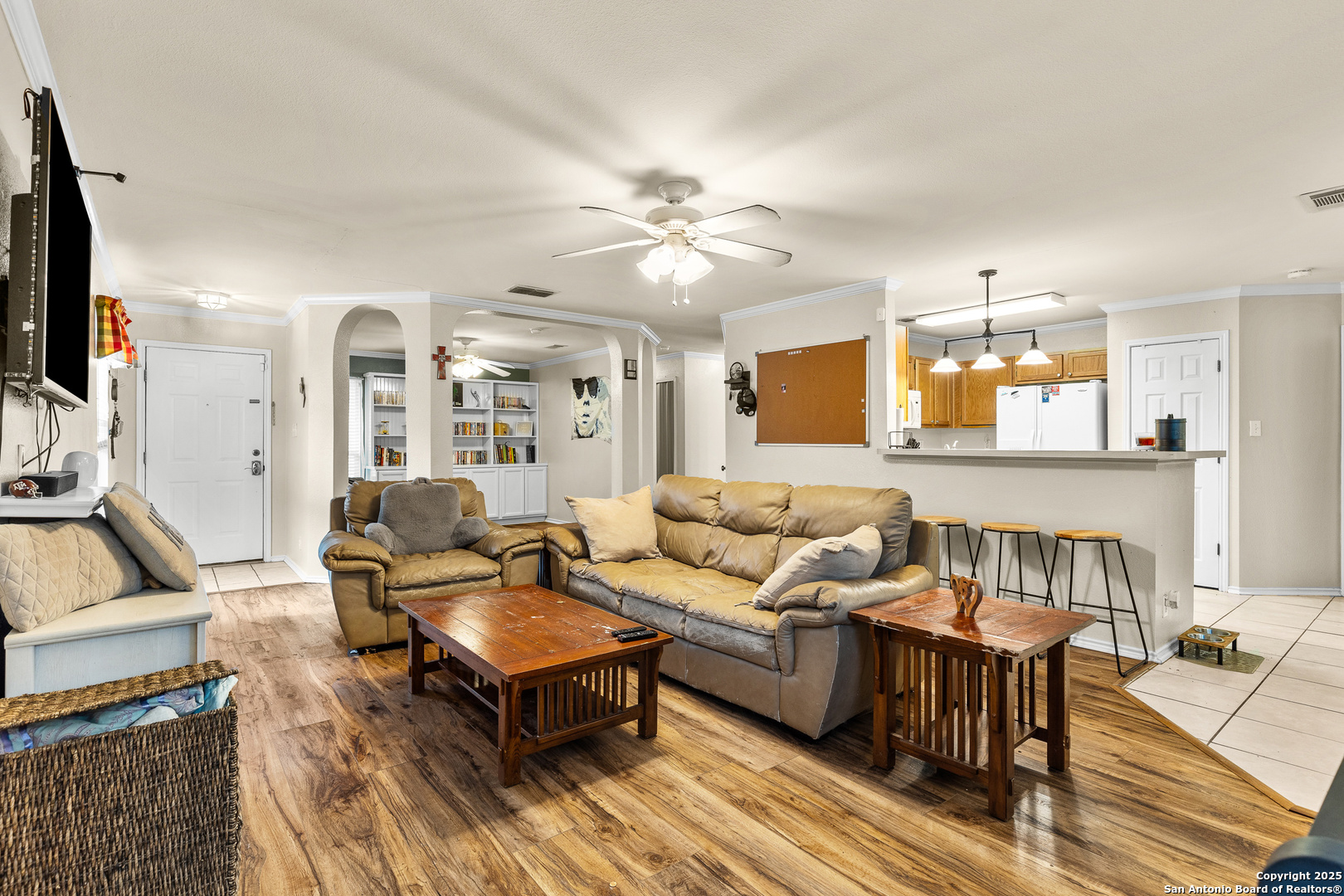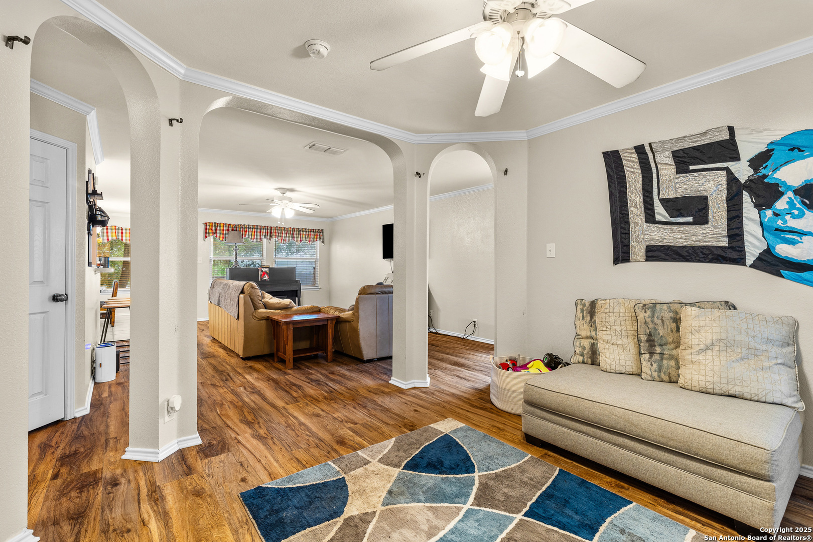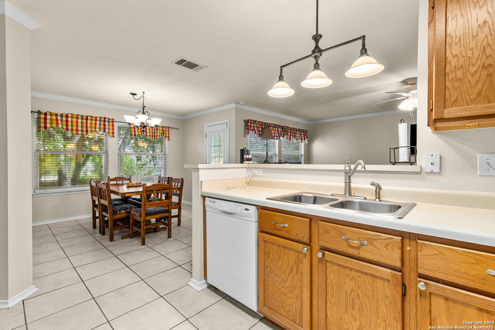 Welcome to this beautifully cared-for home, where curb appeal meets comfort. Nestled in a highly desirable neighborhood, the property features mature shade trees and thoughtfully designed landscape lighting that creates a warm, welcoming glow in the evenings. Inside, the home offers a clean, carpet-free interior with stylish wood laminate and tile flooring throughout. Crown molding and large windows enhance the space with natural light and peaceful views of the private backyard. The flexible dining area features a custom built-in, making it perfect for entertaining, a home office, or a study. The spacious primary suite offers a relaxing retreat with serene views of the backyard, adding to the home's tranquil feel. Located just minutes from Loop 1604, I-35, Hwy 281, H-E-B, and an array of shopping and dining destinations, and within walking distance to top-rated schools - this home offers both convenience and lifestyle. Don't miss your opportunity to own this well-maintained gem in one of the area's most sought-after communities!