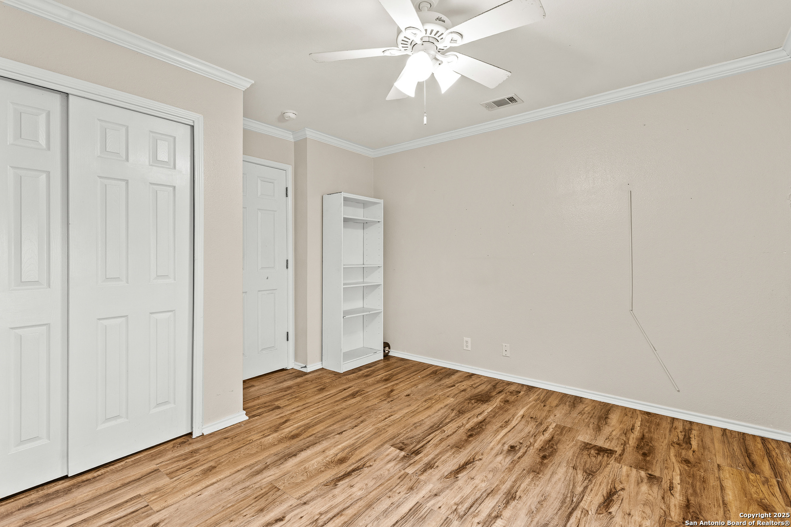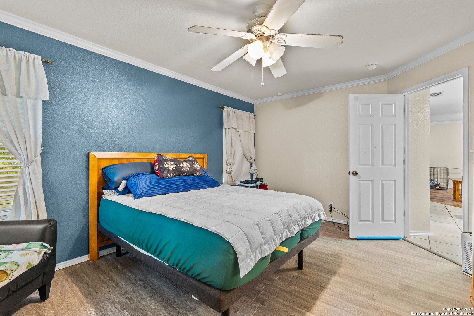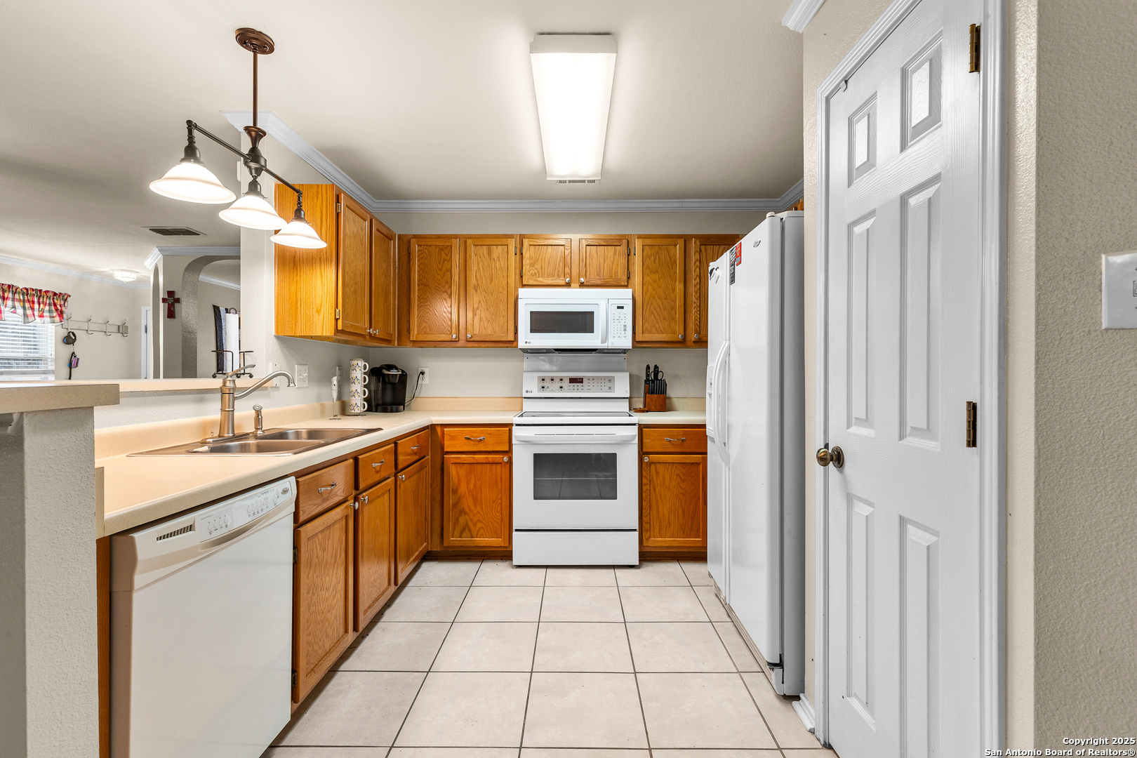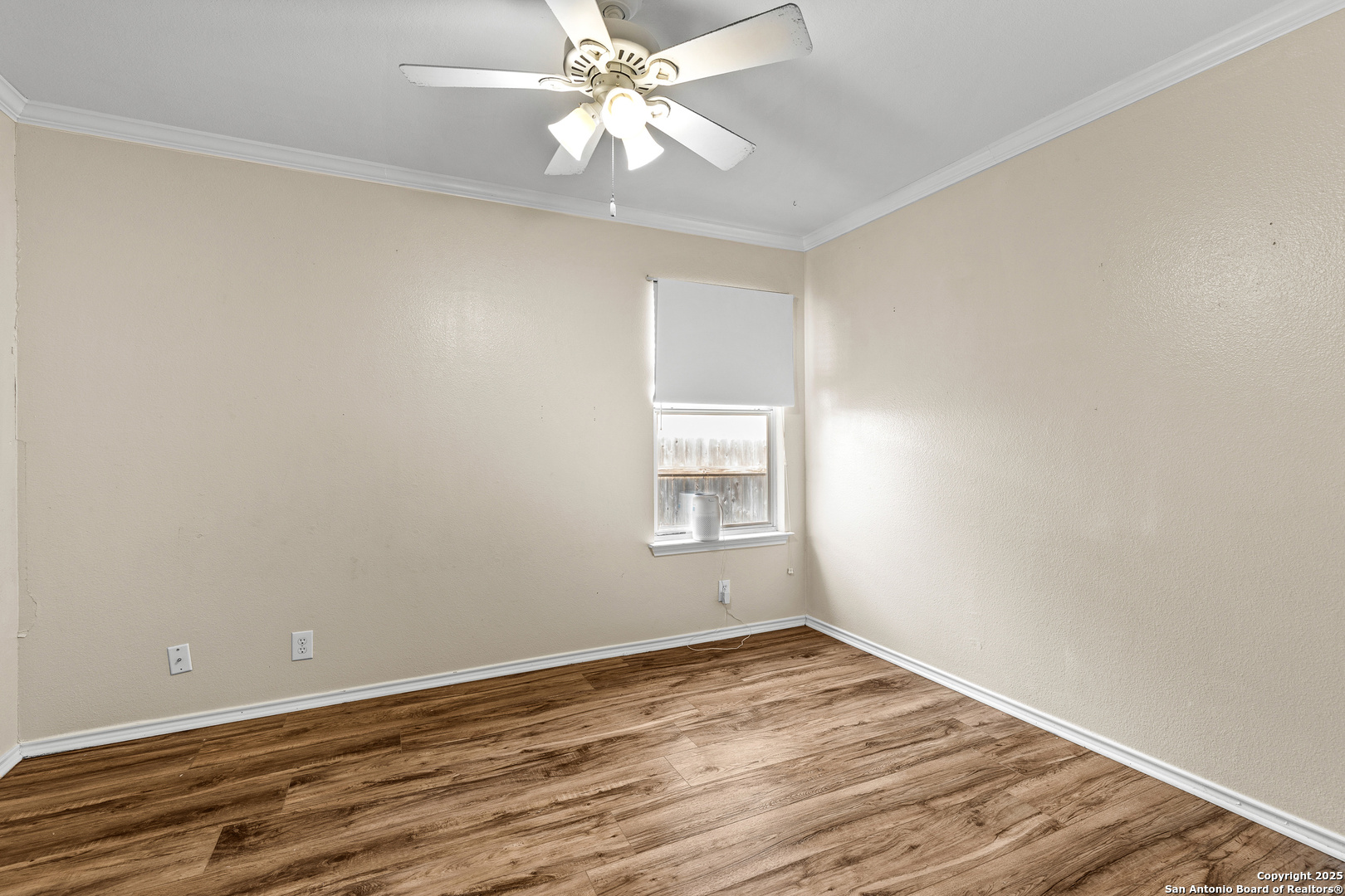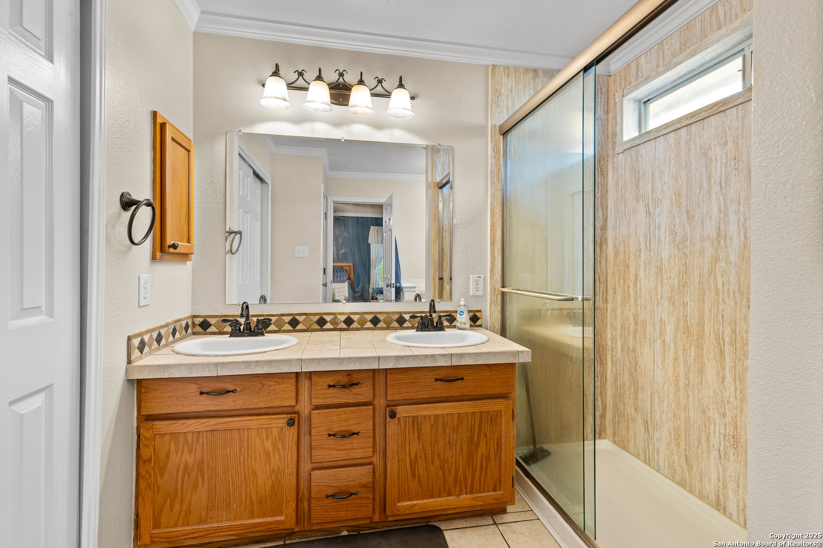 Welcome to this beautifully cared-for home, where curb appeal meets comfort. Nestled in a highly desirable neighborhood, the property features mature shade trees and thoughtfully designed landscape lighting that creates a warm, welcoming glow in the evenings. Inside, the home offers a clean, carpet-free interior with stylish wood laminate and tile flooring throughout. Crown molding and large windows enhance the space with natural light and peaceful views of the private backyard. The flexible dining area features a custom built-in, making it perfect for entertaining, a home office, or a study. The spacious primary suite offers a relaxing retreat with serene views of the backyard, adding to the home's tranquil feel. Located just minutes from Loop 1604, I-35, Hwy 281, H-E-B, and an array of shopping and dining destinations, and within walking distance to top-rated schools - this home offers both convenience and lifestyle. Don't miss your opportunity to own this well-maintained gem in one of the area's most sought-after communities!