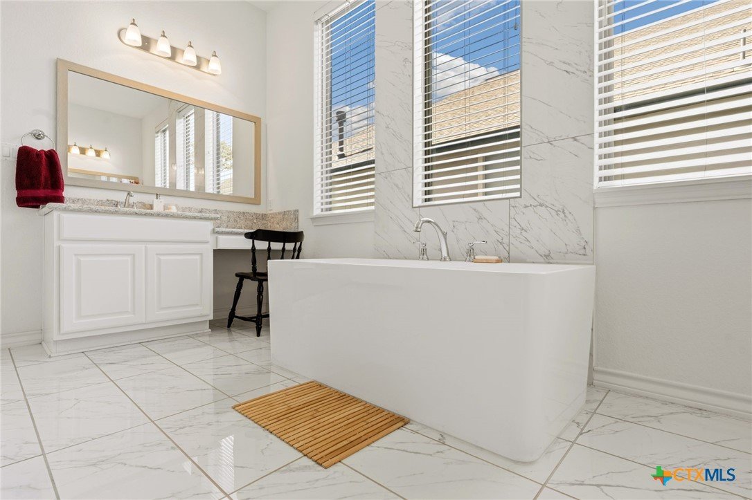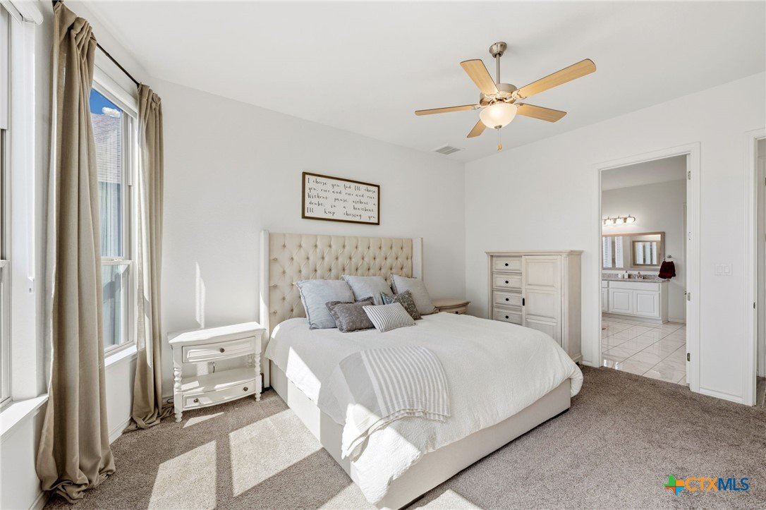 Experience elevated Hill Country living in this exceptional 2021 Monticello 2-story home, perfectly positioned in the prestigious Grove section of Vintage Oaks. Offering 2,959 square feet of refined design, this 4-bedroom, 3.5-bath residence seamlessly blends sophistication with everyday comfort. From the moment you enter, you’re welcomed by an elegant open-concept layout filled with natural light and upscale finishes. The chef’s kitchen is a true showpiece, featuring a gas range, expansive granite island, walk-in pantry, and abundant cabinetry—all flowing effortlessly into the spacious living and dining areas designed for stylish entertaining. The private primary suite on the main level serves as a serene retreat, complete with a spa-inspired bath showcasing a walk-in shower, garden tub, and oversized walk-in closets. A dedicated office offers a quiet, polished space for working from home. Upstairs, three generously appointed secondary bedrooms accompany a versatile game room, ideal for media, recreation, or additional lounge space. Step outside to your covered patio and private backyard—perfect for relaxing evenings or hosting guests. As a resident of Vintage Oaks, enjoy access to premier resort-style amenities including multiple pools, a state-of-the-art fitness center, clubhouse, sports courts, and scenic trails. This is luxury, space, and community living at its finest.