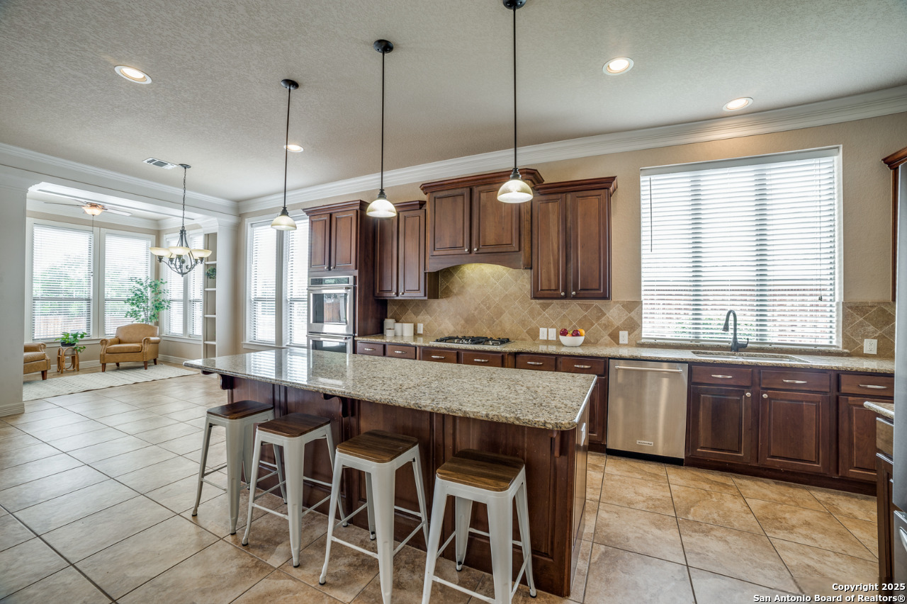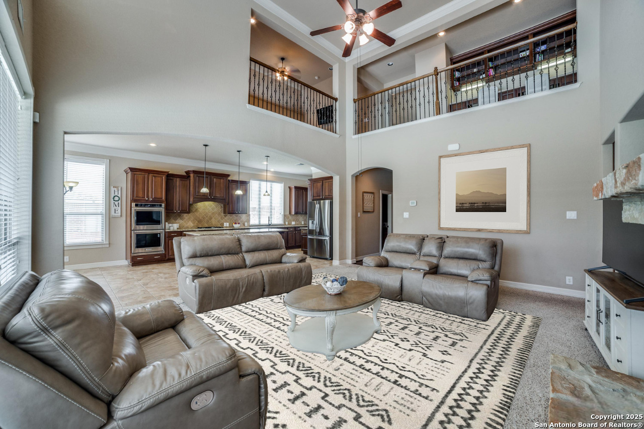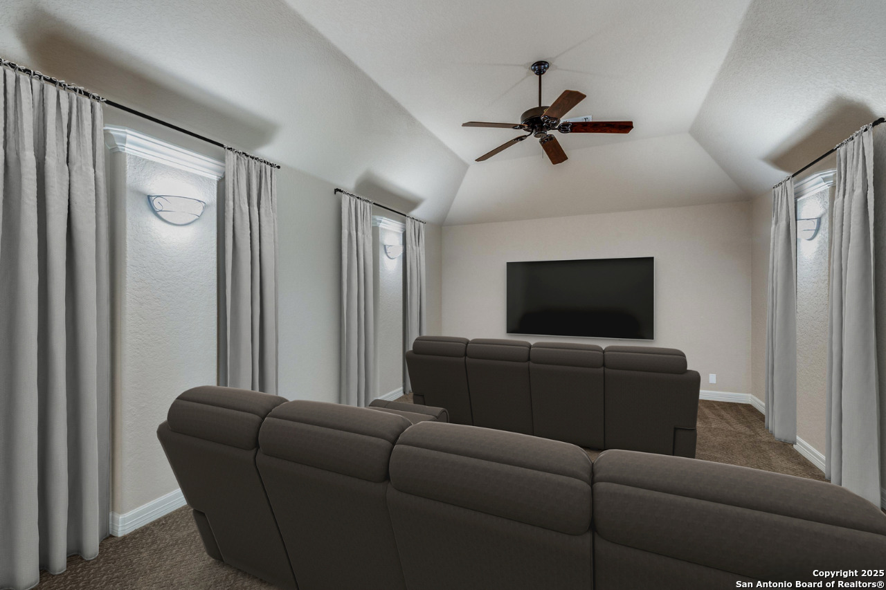 This impressive two-story residence, located in a gated community, offers five bedrooms, four-and-a-half bathrooms, and a three-car garage. Exceptional curb appeal sets the tone as you arrive. Inside, soaring ceilings, abundant natural light, and a wide-open layout create an inviting atmosphere. The living room showcases a striking floor-to-ceiling stone fireplace, while the kitchen is equipped with a gas cooktop, double ovens, and a spacious walk-in pantry. A casual dining area with a charming sitting nook sits just off the kitchen. The main level includes the primary suite, a secondary guest suite, and a dedicated home office. The primary suite features a generous walk-in closet and an elegant en-suite bath with a dual vanity, glass-enclosed walk-in shower, and garden tub. Upstairs, a large game room, theater room, and additional bedrooms offer versatile spaces for leisure and entertainment. Outdoors, a covered patio overlooks an expansive in-ground pool and connected spa-an ideal setting for enjoying outdoor living at its finest.