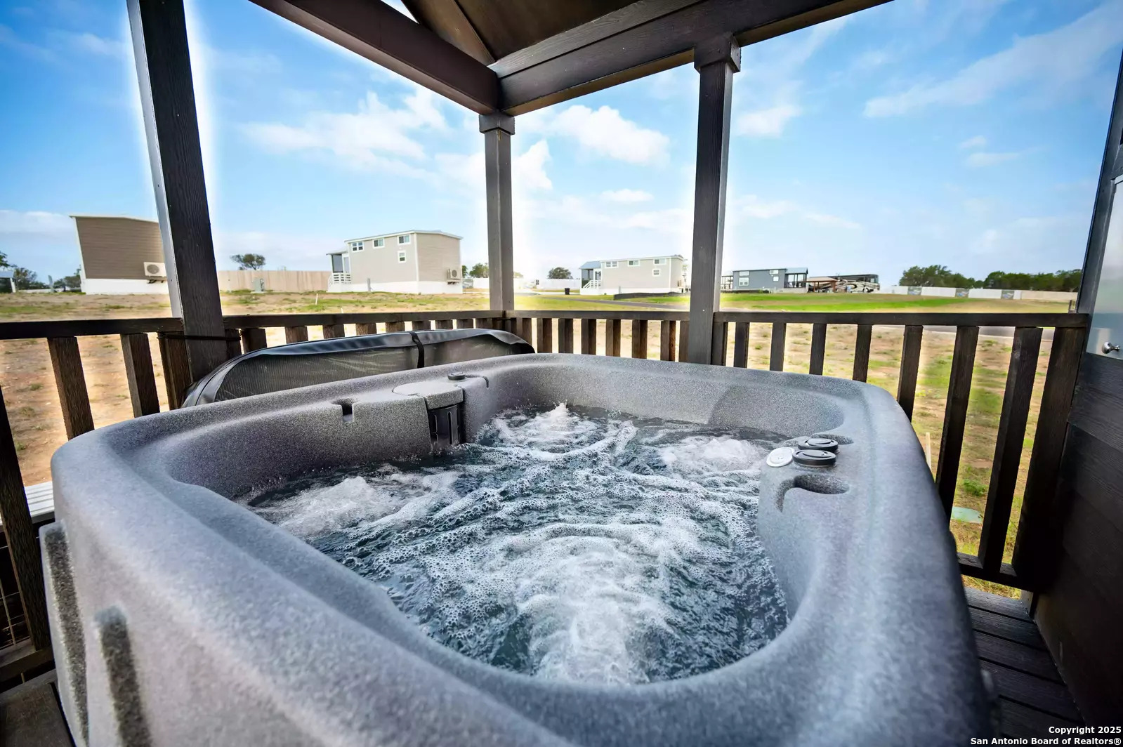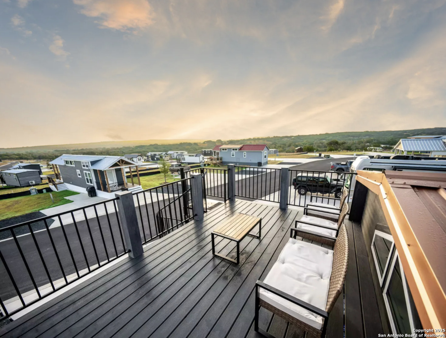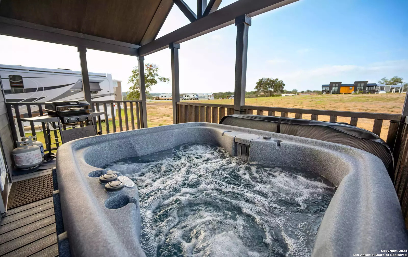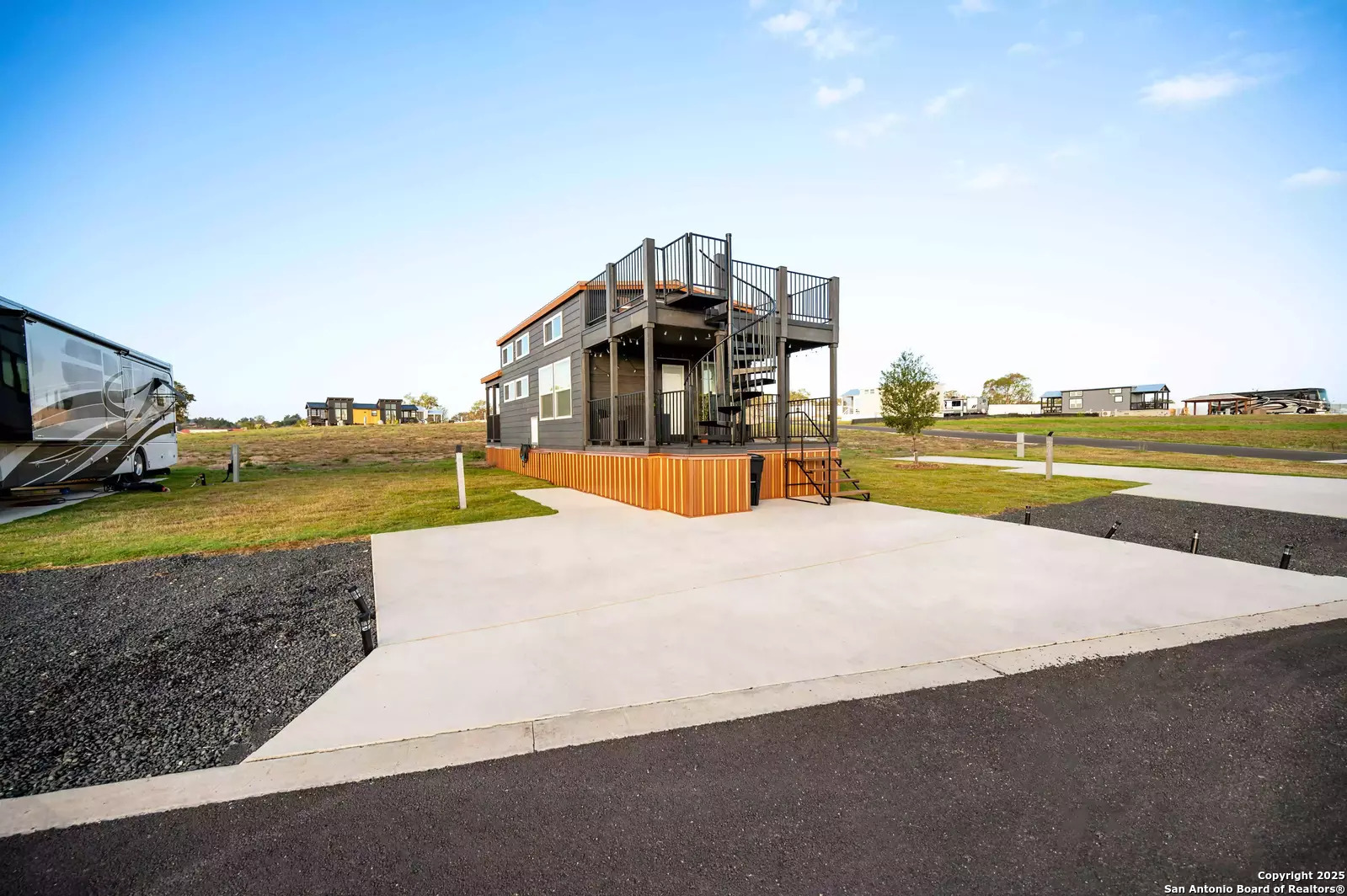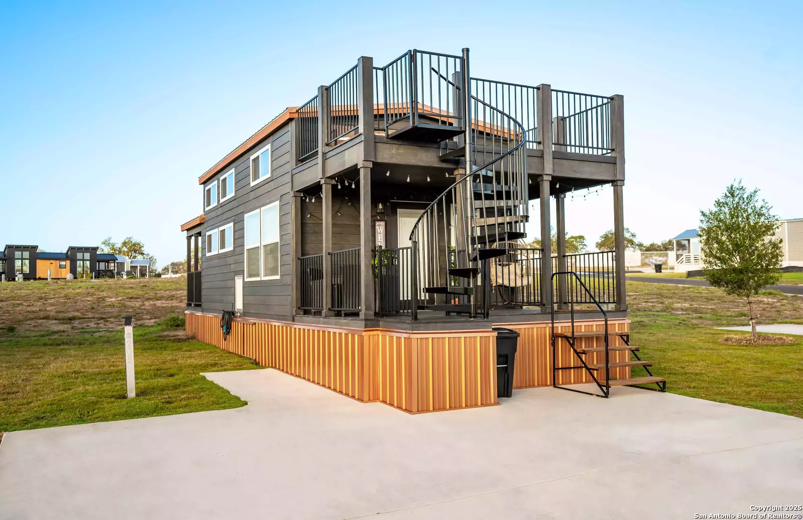 Tucked within the highly desirable Firefly Resort in Fredericksburg, Texas, this thoughtfully designed tiny home offers a unique opportunity to own a luxurious retreat in the heart of the Hill Country. Located just 10 miles from Main Street and surrounded by the vineyards of the famous Highway 290 wine trail, this property is ideal for both personal enjoyment and short-term rental income. The home itself is a masterclass in compact luxury. Inside, you'll find a cozy main-level bedroom, a full bathroom, and a well-equipped kitchen with everything you need to cook and entertain. The upper-level loft accommodates two full-size beds comfortably, making it a great space for families or guests. Every square foot of this tiny home has been maximized to provide both comfort and style. Step outside and the charm continues. A covered front porch with a hanging chair offers the perfect spot to enjoy your morning coffee or a glass of local wine in the evening. Follow the elegant spiral staircase to the rooftop deck, where you can take in the wide-open skies and sweeping views of the Hill Country. And tucked around the back of the home is a private, covered hot tub that makes this property truly feel like a personal spa getaway. Firefly Resort itself is full of amenities that make life easy and enjoyable. Residents and guests enjoy access to a resort-style pool with panoramic views, a modern clubhouse, outdoor kitchen and grill stations, laundry facilities, a business center, a dog park, and a playground. Whether you're looking for a weekend escape, a low-maintenance investment, or a place to call home in one of Texas's most charming destinations, Unit #205 offers it all-style, comfort, and an unbeatable location.