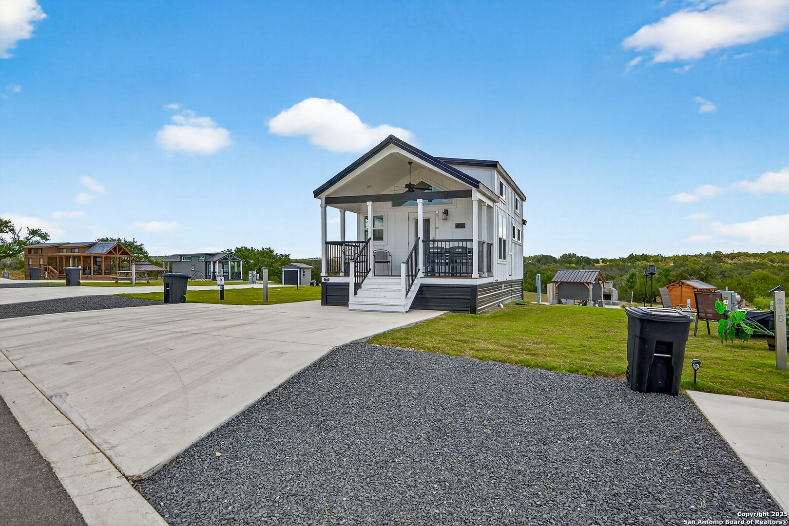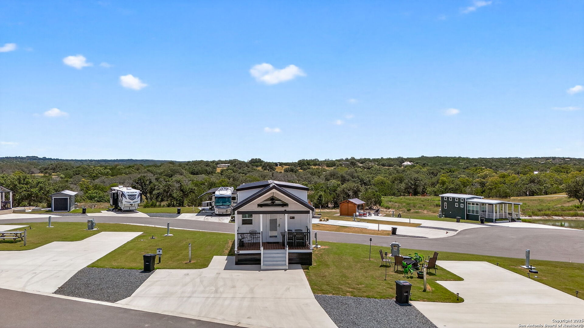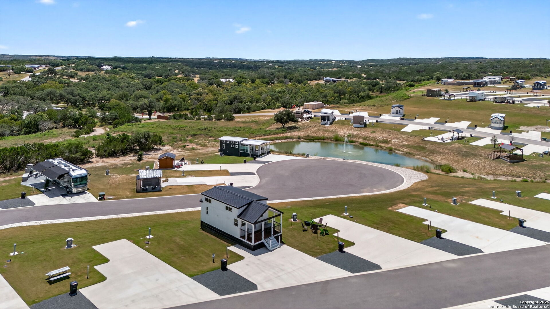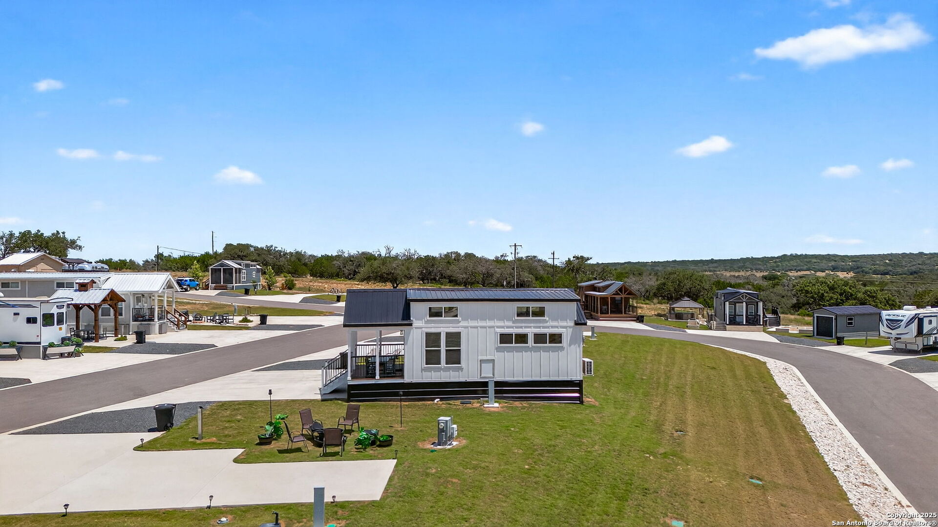 Charming light-filled tiny home featuring a welcoming covered deck with a large dining table. Inside, enjoy high ceilings, a well-appointed kitchen with rolling island, a downstairs bedroom, full bath with shower, and a loft with two full beds. Sold fully furnished. Located in this Hill Country resort with exceptional amenities, this home is a short walk to all the offereings - two-tiered infinity pool, gas grills, multiple TVs for ballgames, etc., dog park, playground, and more. View from this home include the pond, wide views of the Hill Country and, of course, the starlit night sky! Very nearby is Luckenbach, TX Wine Trail and Fredericksburg's Main Street. You need to visit Firefly to understand what a treasure this place is!