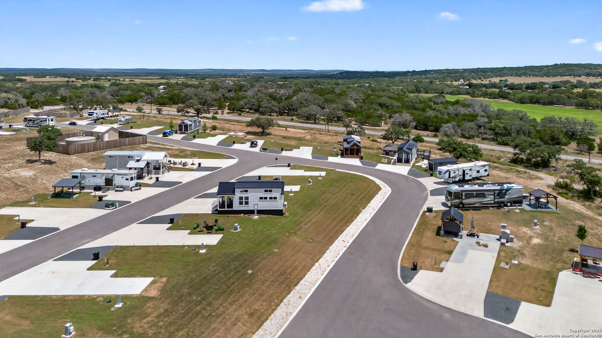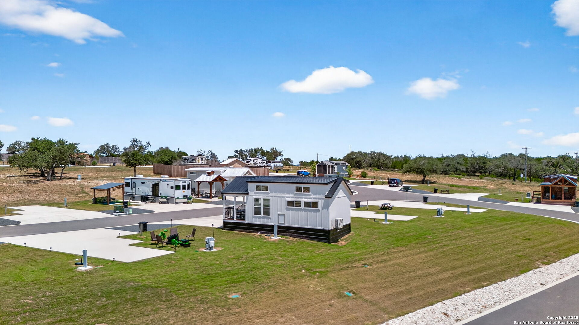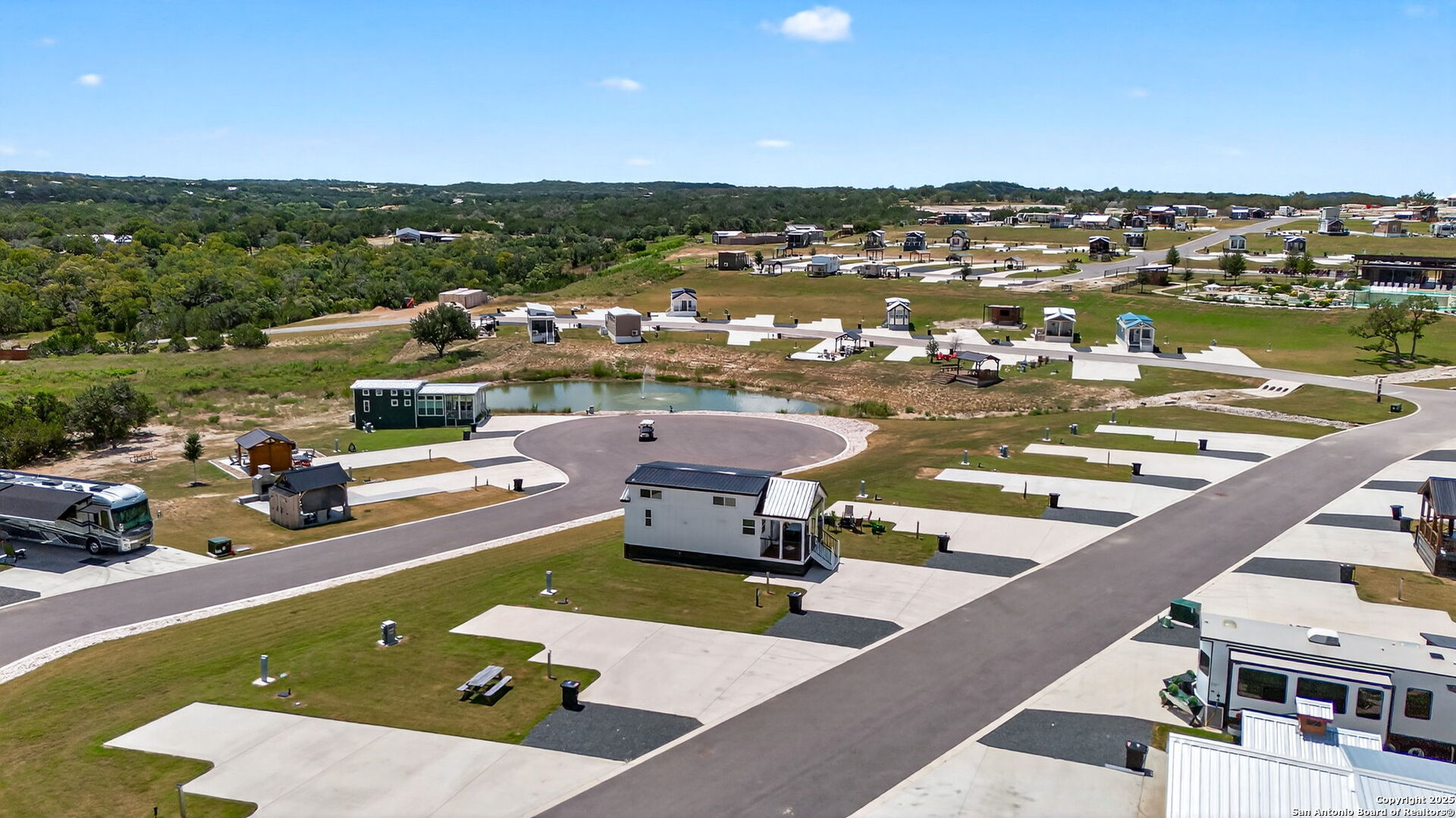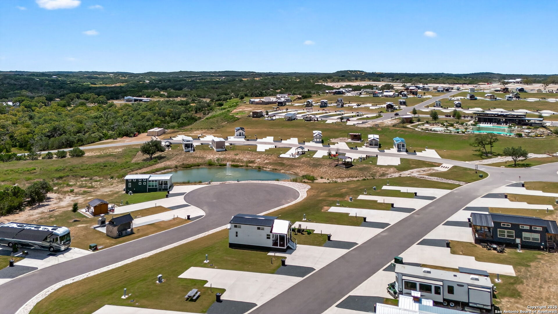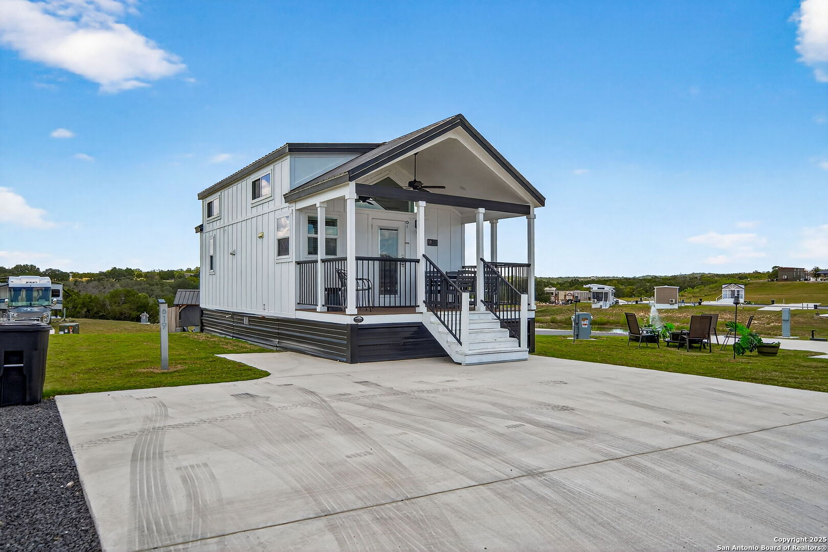Charming light-filled tiny home featuring a welcoming covered deck with a large dining table. Inside, enjoy high ceilings, a well-appointed kitchen with rolling island, a downstairs bedroom, full bath with shower, and a loft with two full beds. Sold fully furnished. Located in this Hill Country resort with exceptional amenities, this home is a short walk to all the offereings - two-tiered infinity pool, gas grills, multiple TVs for ballgames, etc., dog park, playground, and more. View from this home include the pond, wide views of the Hill Country and, of course, the starlit night sky! Very nearby is Luckenbach, TX Wine Trail and Fredericksburg's Main Street. You need to visit Firefly to understand what a treasure this place is!