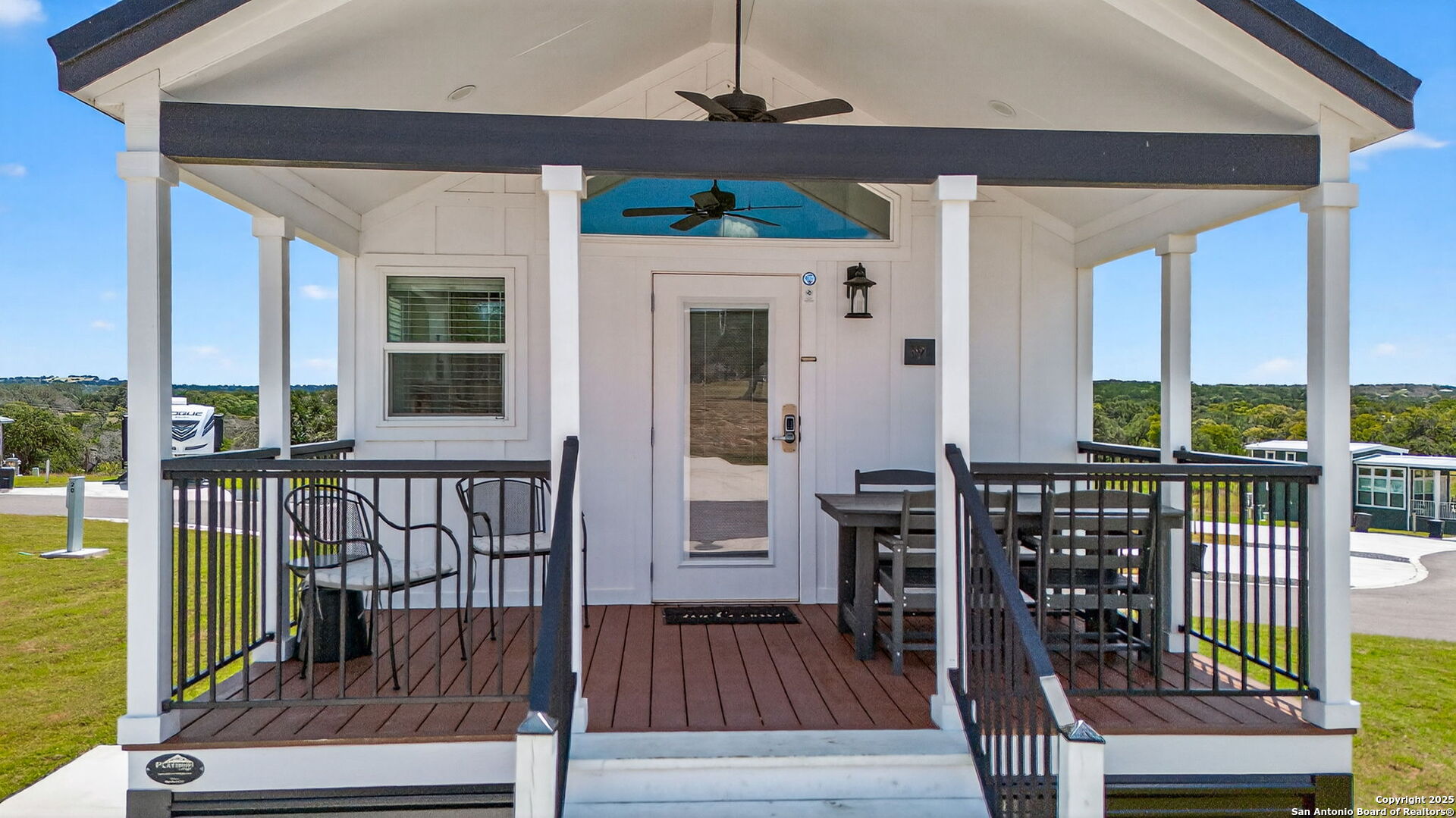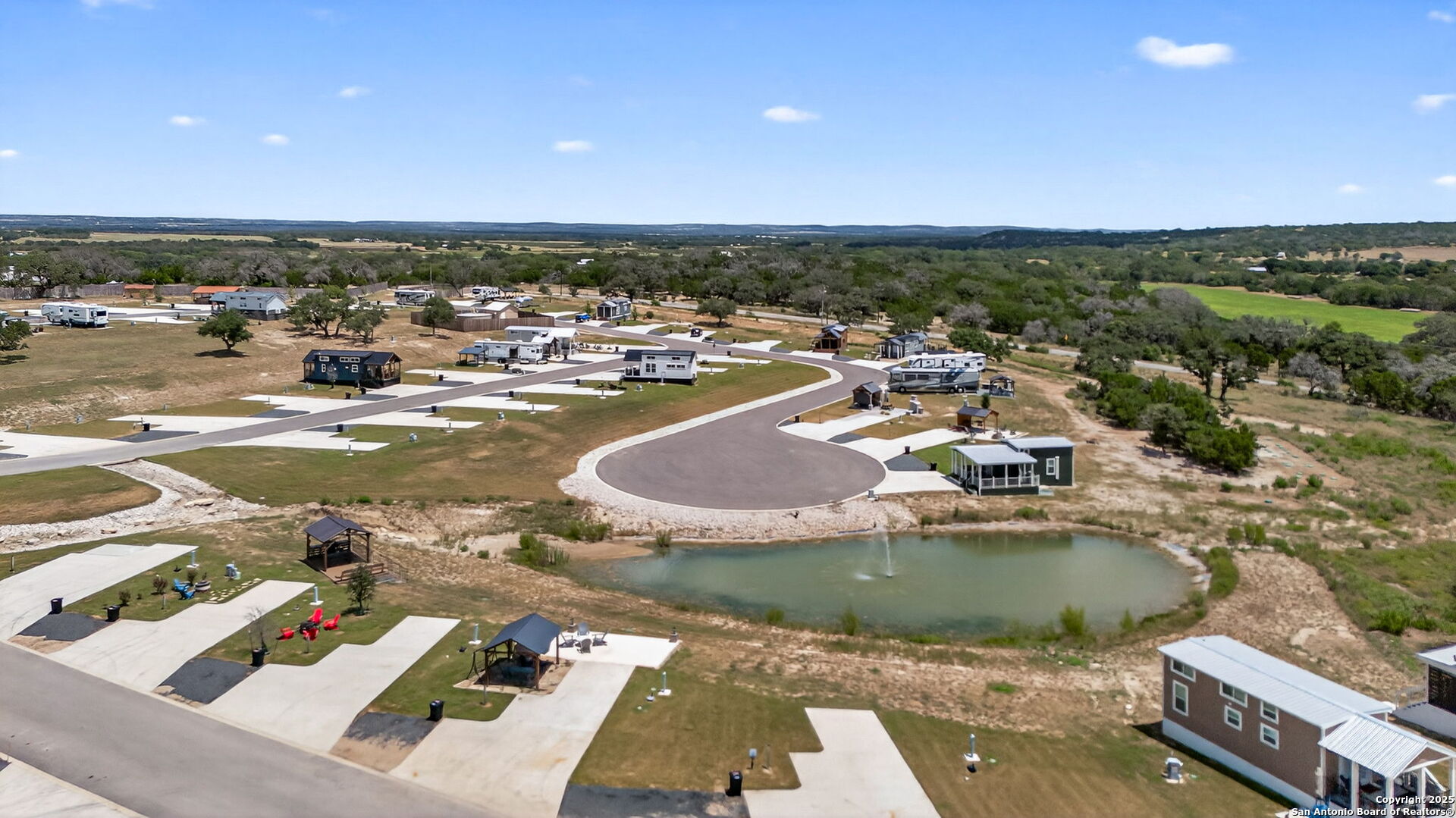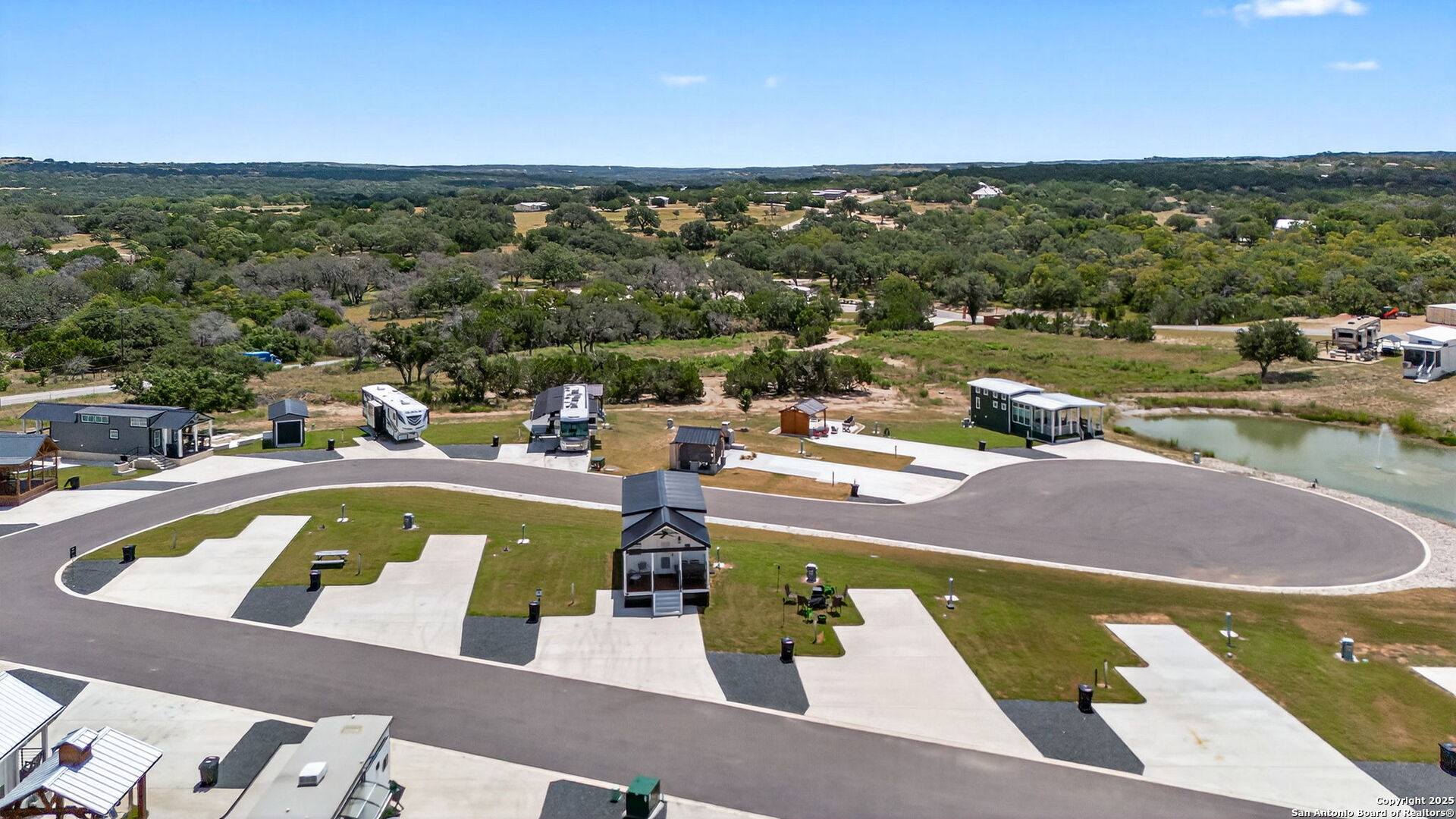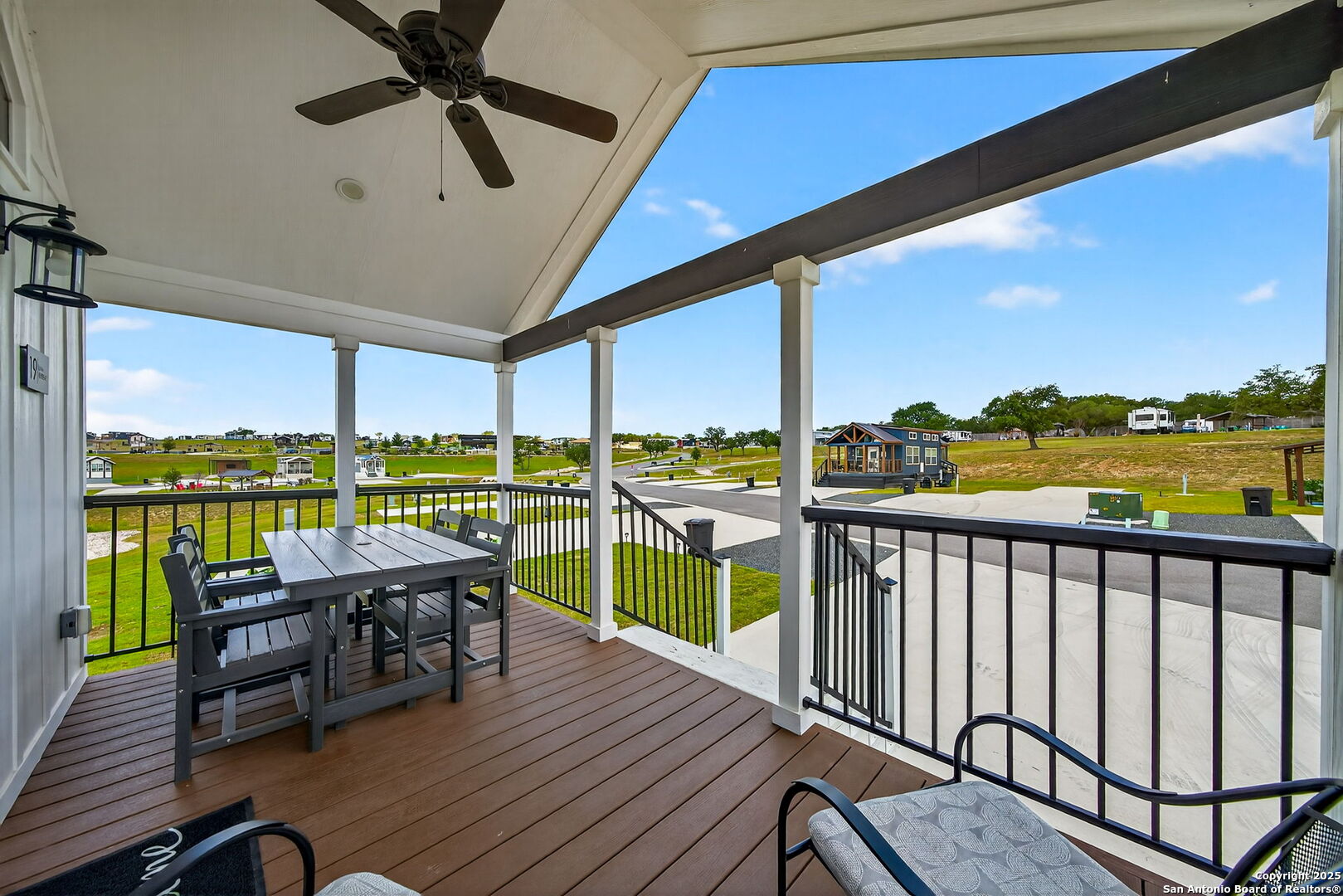 Charming light-filled tiny home featuring a welcoming covered deck with a large dining table. Inside, enjoy high ceilings, a well-appointed kitchen with rolling island, a downstairs bedroom, full bath with shower, and a loft with two full beds. Sold fully furnished. Located in this Hill Country resort with exceptional amenities, this home is a short walk to all the offereings - two-tiered infinity pool, gas grills, multiple TVs for ballgames, etc., dog park, playground, and more. View from this home include the pond, wide views of the Hill Country and, of course, the starlit night sky! Very nearby is Luckenbach, TX Wine Trail and Fredericksburg's Main Street. You need to visit Firefly to understand what a treasure this place is!