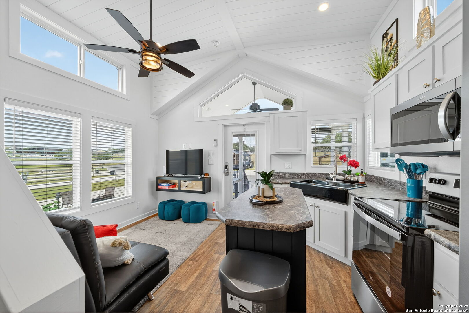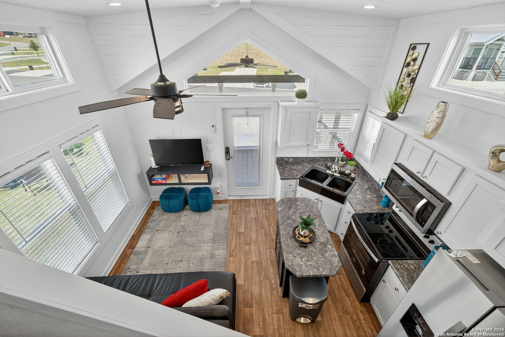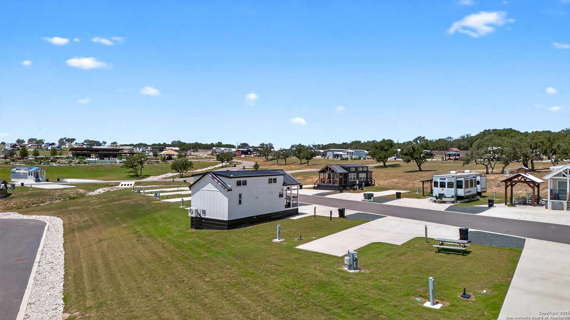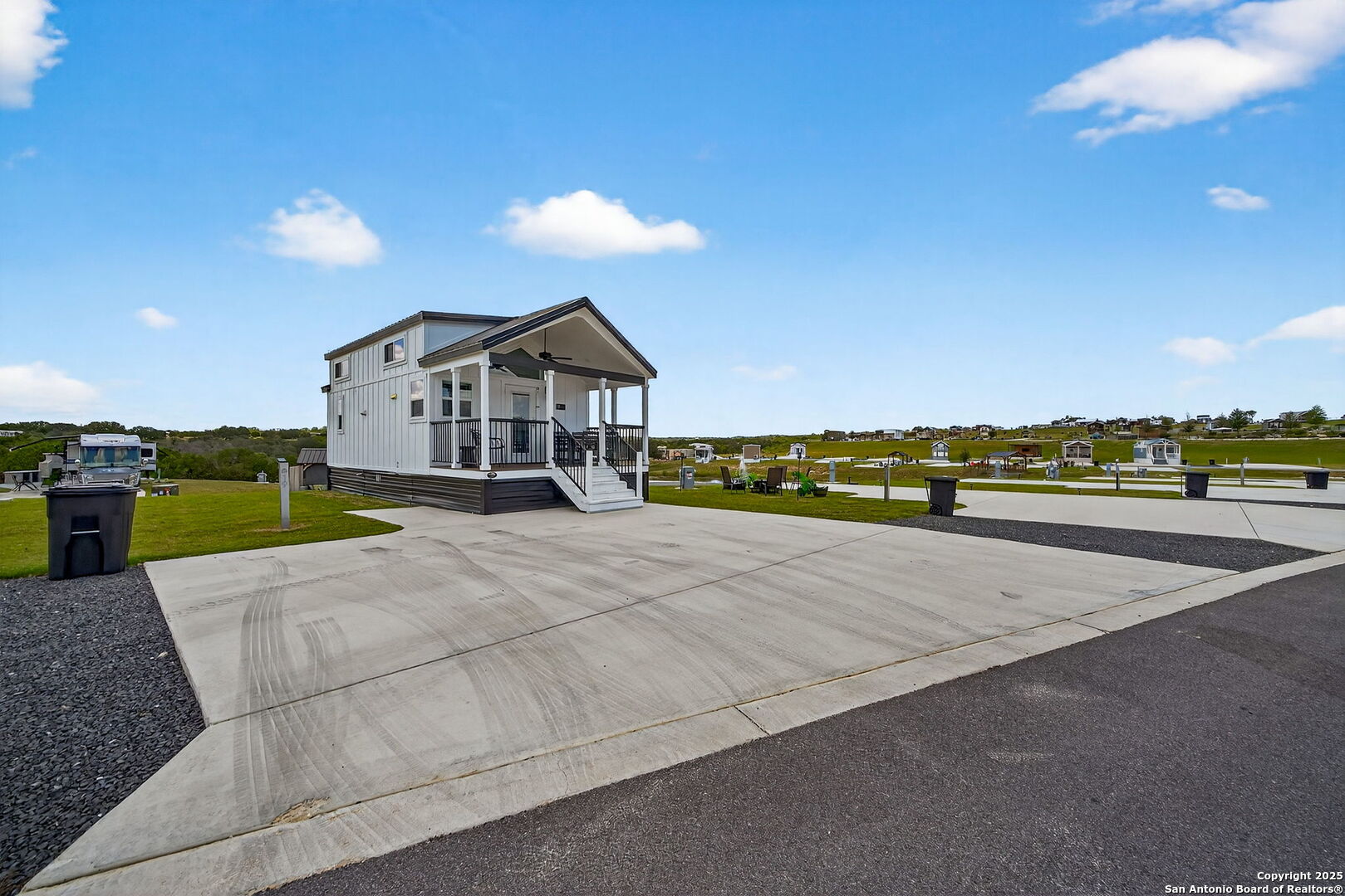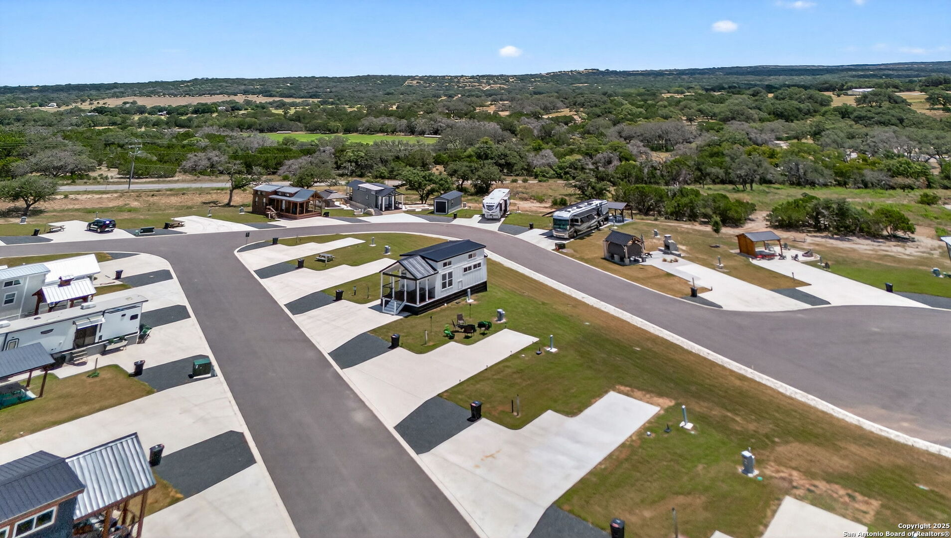 Charming light-filled tiny home featuring a welcoming covered deck with a large dining table. Inside, enjoy high ceilings, a well-appointed kitchen with rolling island, a downstairs bedroom, full bath with shower, and a loft with two full beds. Sold fully furnished. Located in this Hill Country resort with exceptional amenities, this home is a short walk to all the offereings - two-tiered infinity pool, gas grills, multiple TVs for ballgames, etc., dog park, playground, and more. View from this home include the pond, wide views of the Hill Country and, of course, the starlit night sky! Very nearby is Luckenbach, TX Wine Trail and Fredericksburg's Main Street. You need to visit Firefly to understand what a treasure this place is!