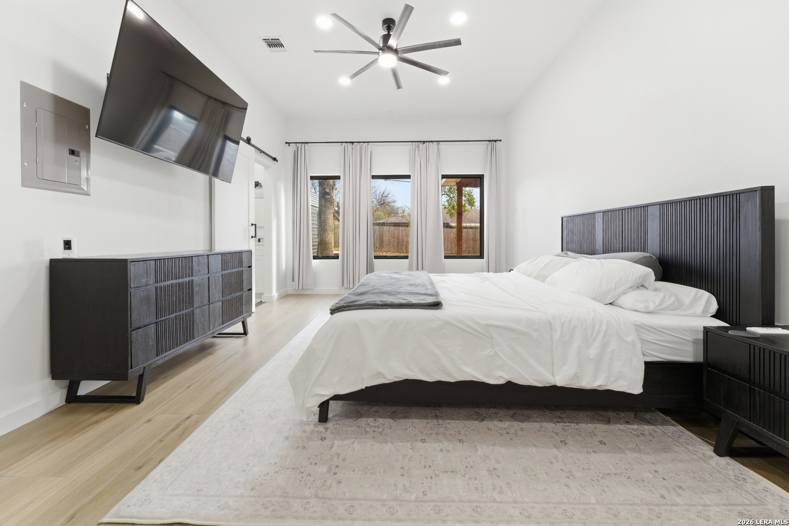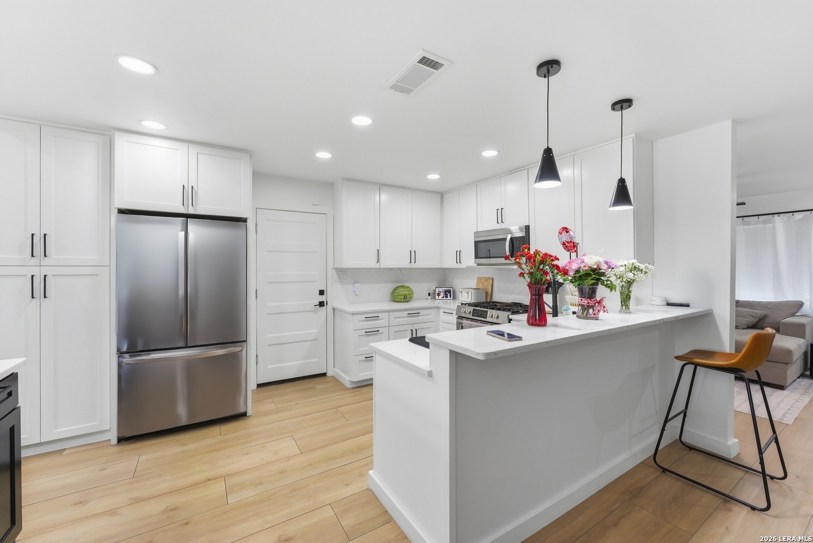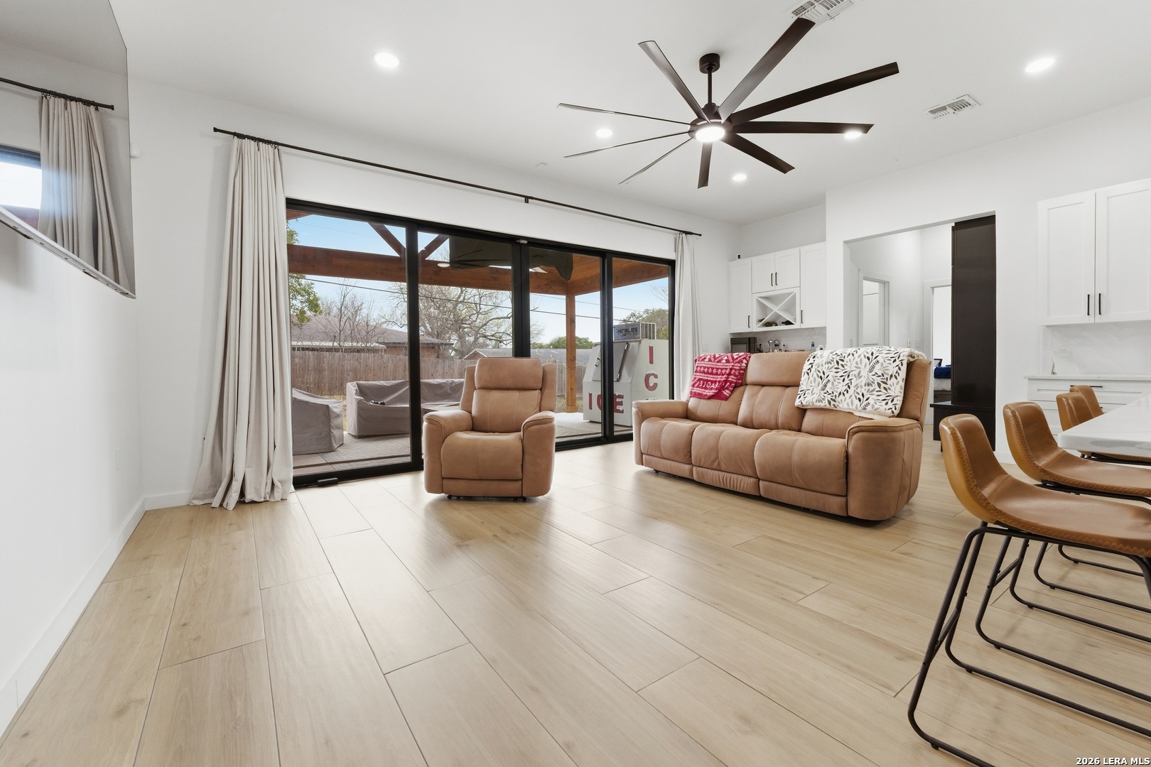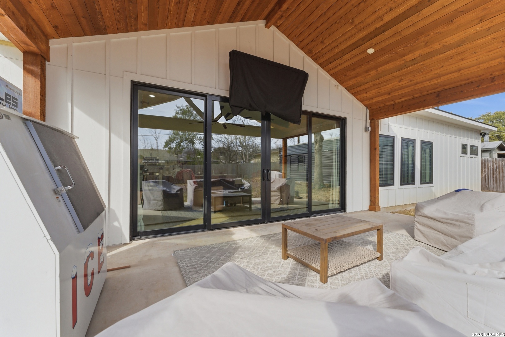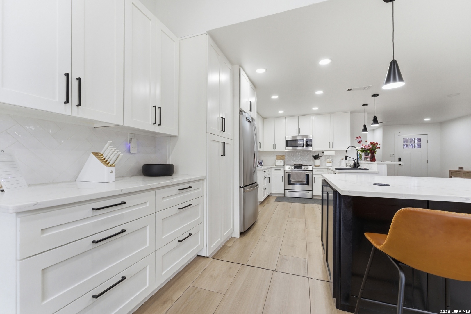 Uniquely remodeled and greatly expanded ONE STORY home right by the Medical Center and minutes from IH-10 and Loop 410. Four bedrooms, three and a half baths with NO CARPET, the home was remodeled and added on to in 2023 to include new roof, water heater, one HVAC system, and approximately 1000 square feet with designer tile, modern fans, fixtures, hardware, appliances, massive island, bar, quartz counters and paint throughout the entire home for seamless integration. Back patio addition in 2025. Extra 20 by 7 foot utility and laundry area with built in shelving to store anything you can dream up in the full size two car garage. Plus a 16 by 32 foot storage barn in the large back yard. Gas cooking and utilities. Sprinkler system. Security lighting and cameras too.