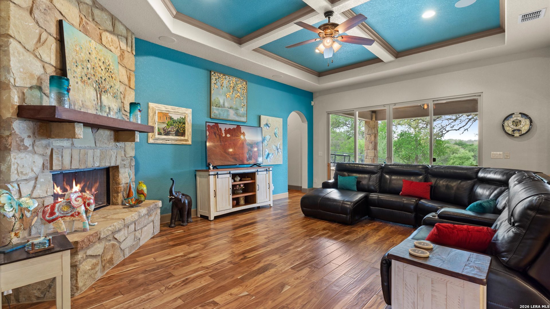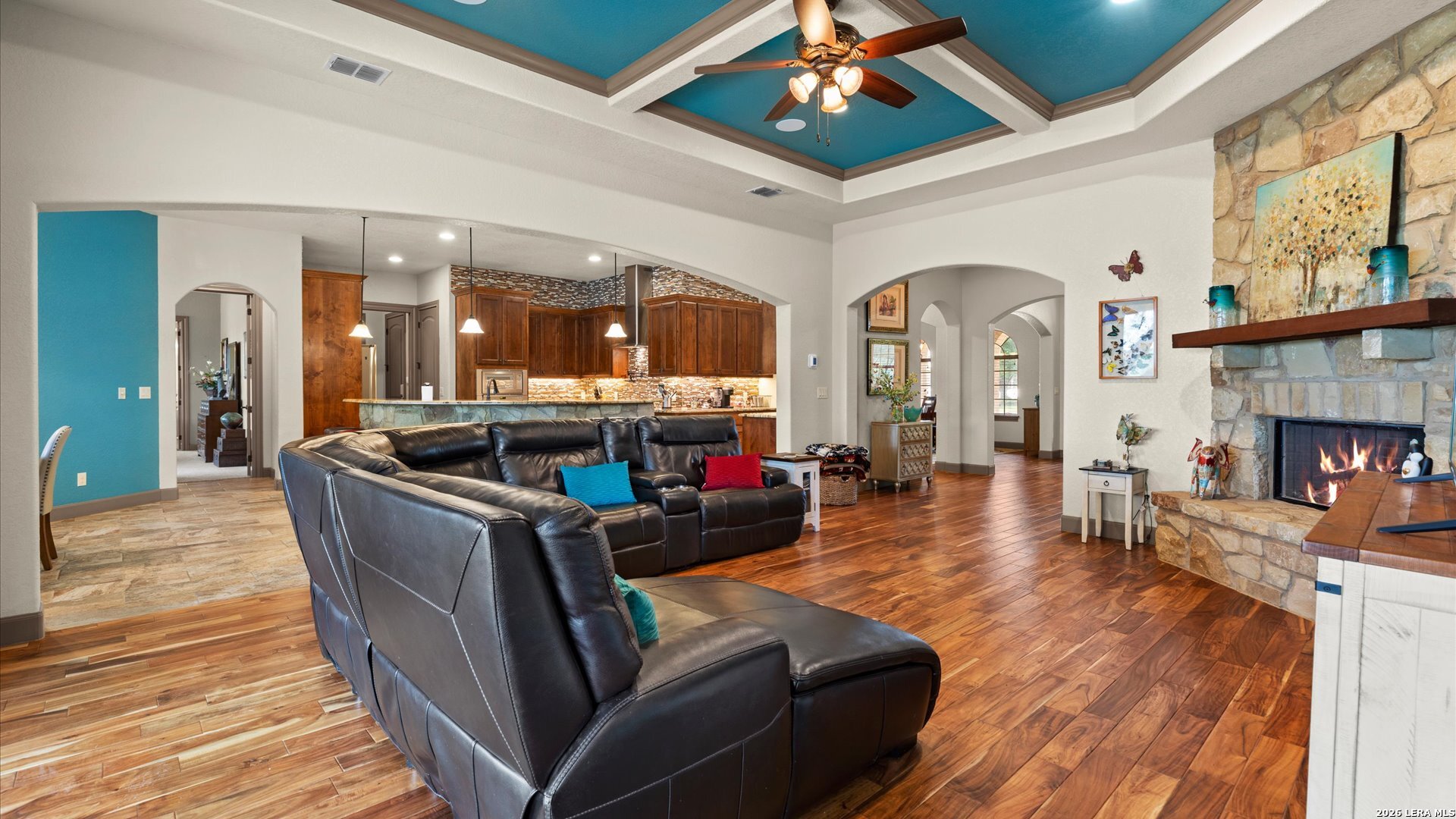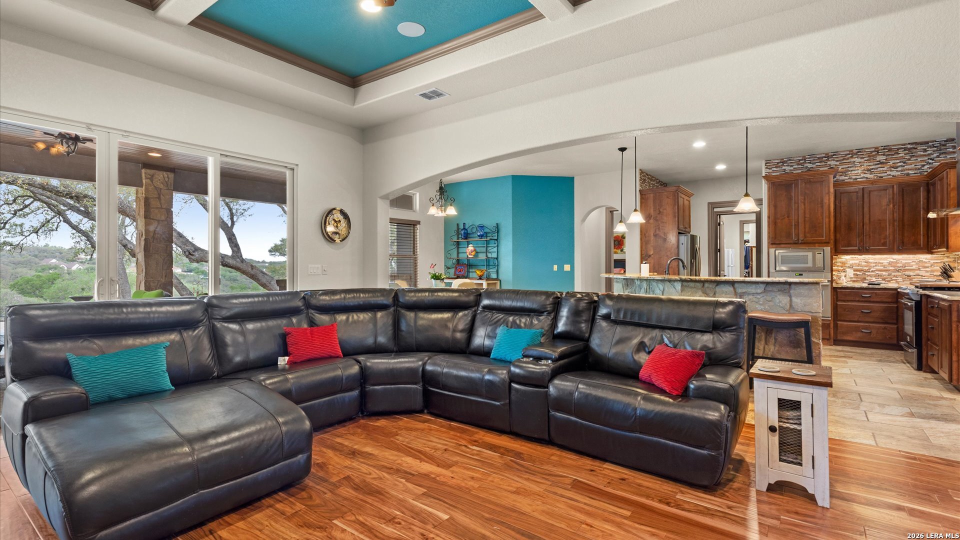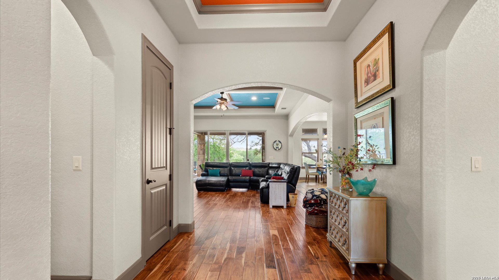 Stunning custom Hill Country estate in the highly sought-after River Chase community, perfectly situated on 2.63 private, oak-studded acres. This beautifully designed single-story home offers 3 bedrooms, 3 full baths, a half bath, and two spacious living areas, including a formal sitting area, across 3,442 square feet of thoughtfully crafted living space. From the moment you arrive, the striking stone exterior, arched entry, and metal roof set the tone for timeless quality and craftsmanship. Inside, warm wood flooring, architectural details, and an inviting stone fireplace create a welcoming yet refined atmosphere. The open-concept layout is ideal for both everyday living and entertaining, with multiple living spaces offering flexibility for gathering, relaxing, or working from home. The well-appointed kitchen features custom cabinetry, granite countertops, and designer finishes. The private primary suite is a true retreat, featuring a dedicated sitting area and a spa-like bath with soaking tub, walk-in shower, and generous closet space. Secondary bedrooms are well-sized with access to beautifully finished baths. Step outside to your own Hill Country oasis-an expansive covered patio overlooking a resort-style pool with water features, surrounded by mature trees and scenic views. Whether hosting guests or enjoying a quiet evening, this outdoor space delivers exceptional privacy and tranquility. A rare and highly desirable feature, the 18x50 detached workshop/RV garage is fully insulated and equipped with electricity and remote access-perfect for a workshop, recreational vehicles, or additional storage. The property also includes an attached garage, offering both convenience and versatility. Located in River Chase, residents enjoy exclusive access to premier amenities including a private Guadalupe River park, clubhouse, fitness center, and scenic walking trails-all just minutes from shopping, dining, and the charm of New Braunfels. A rare opportunity to own a private, amenity-rich estate that combines luxury, functionality, and the best of Hill Country living.