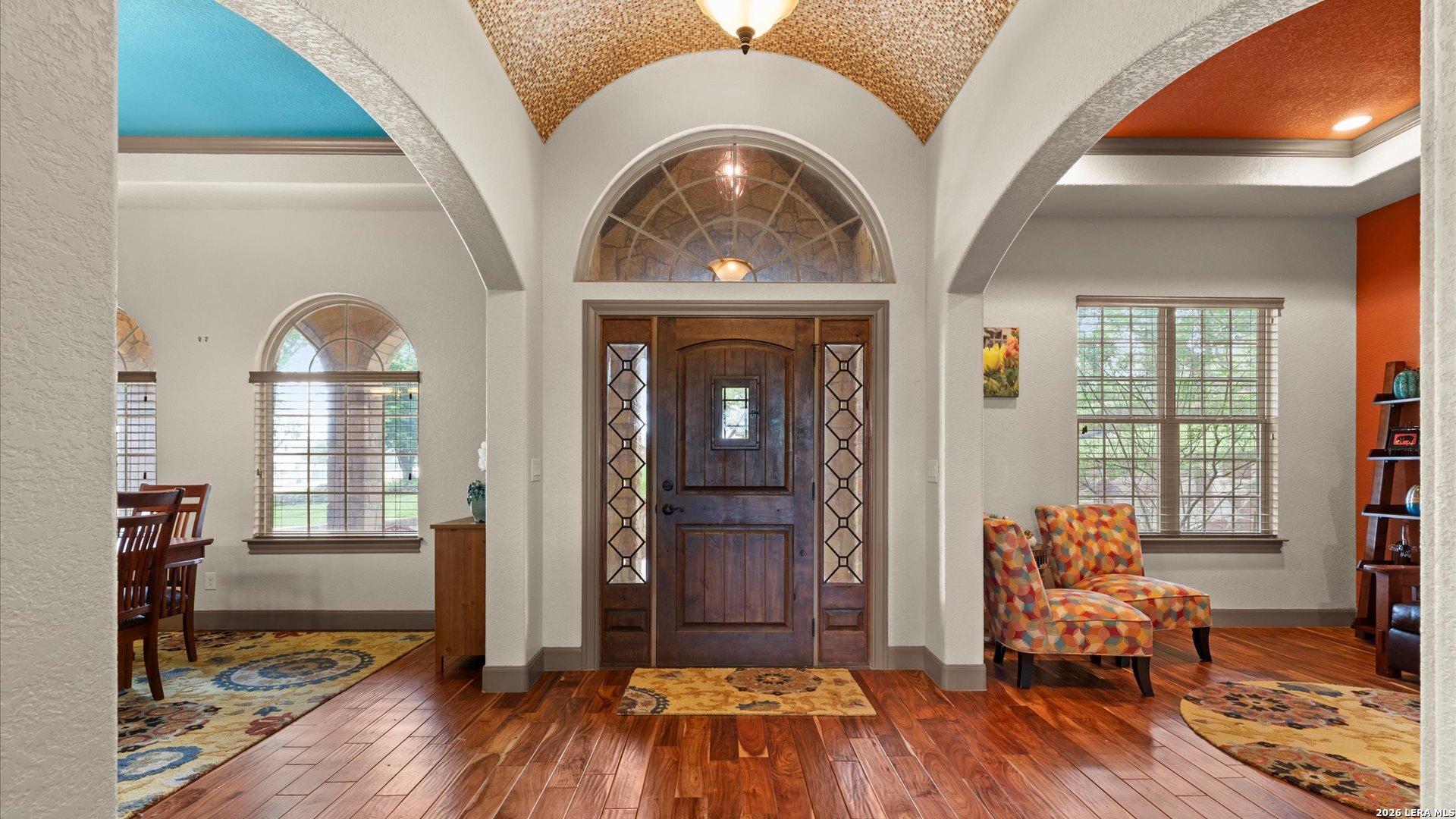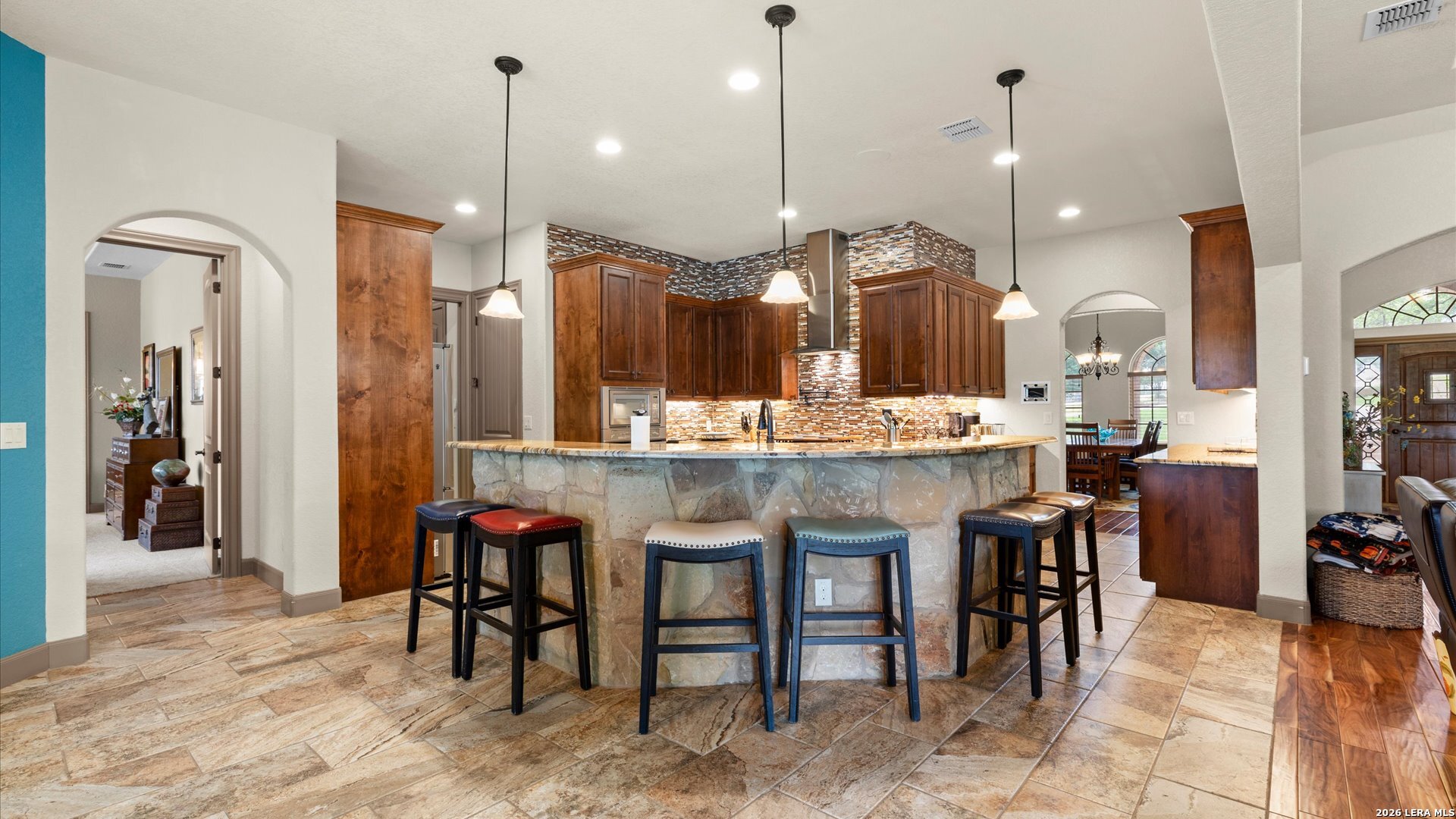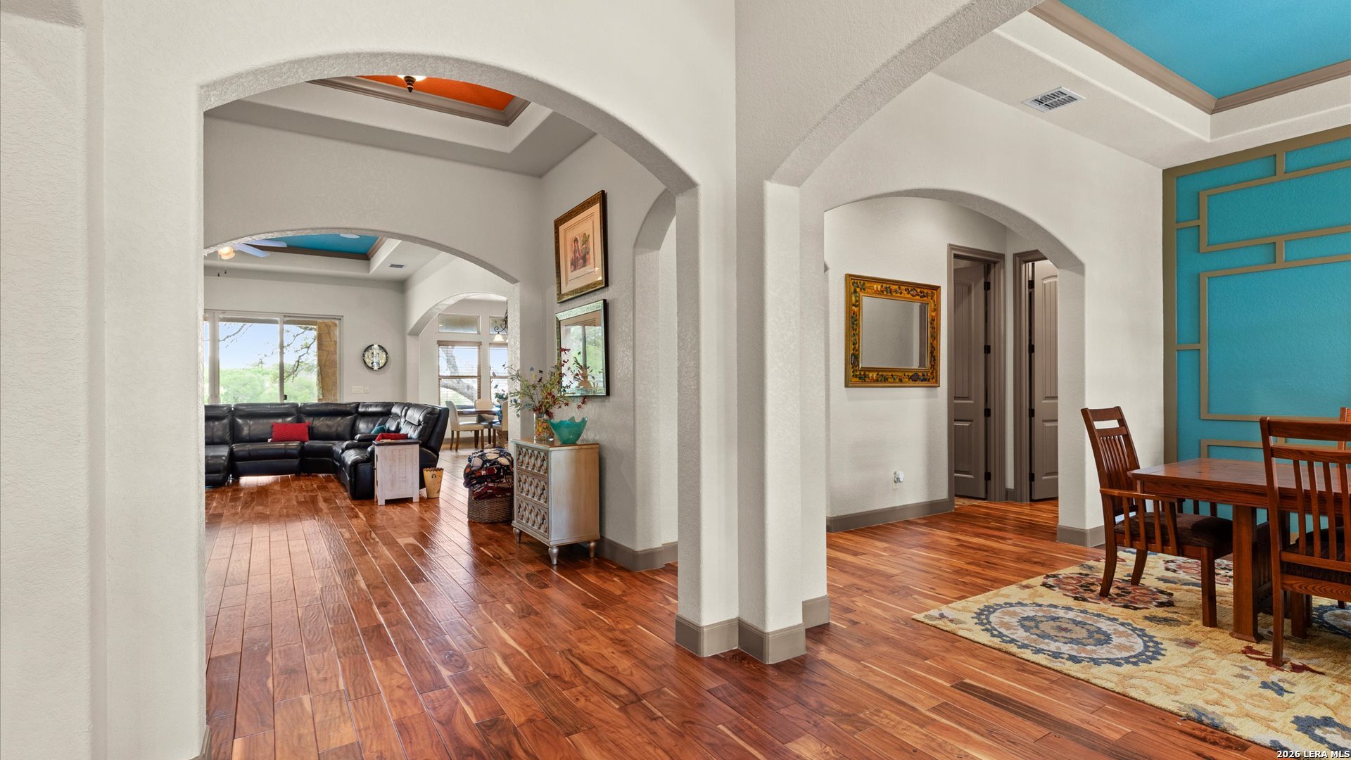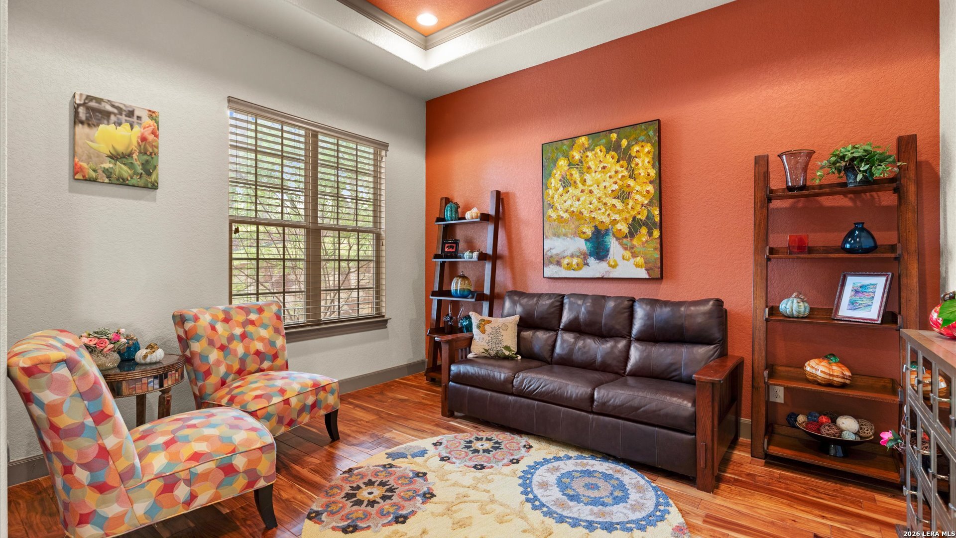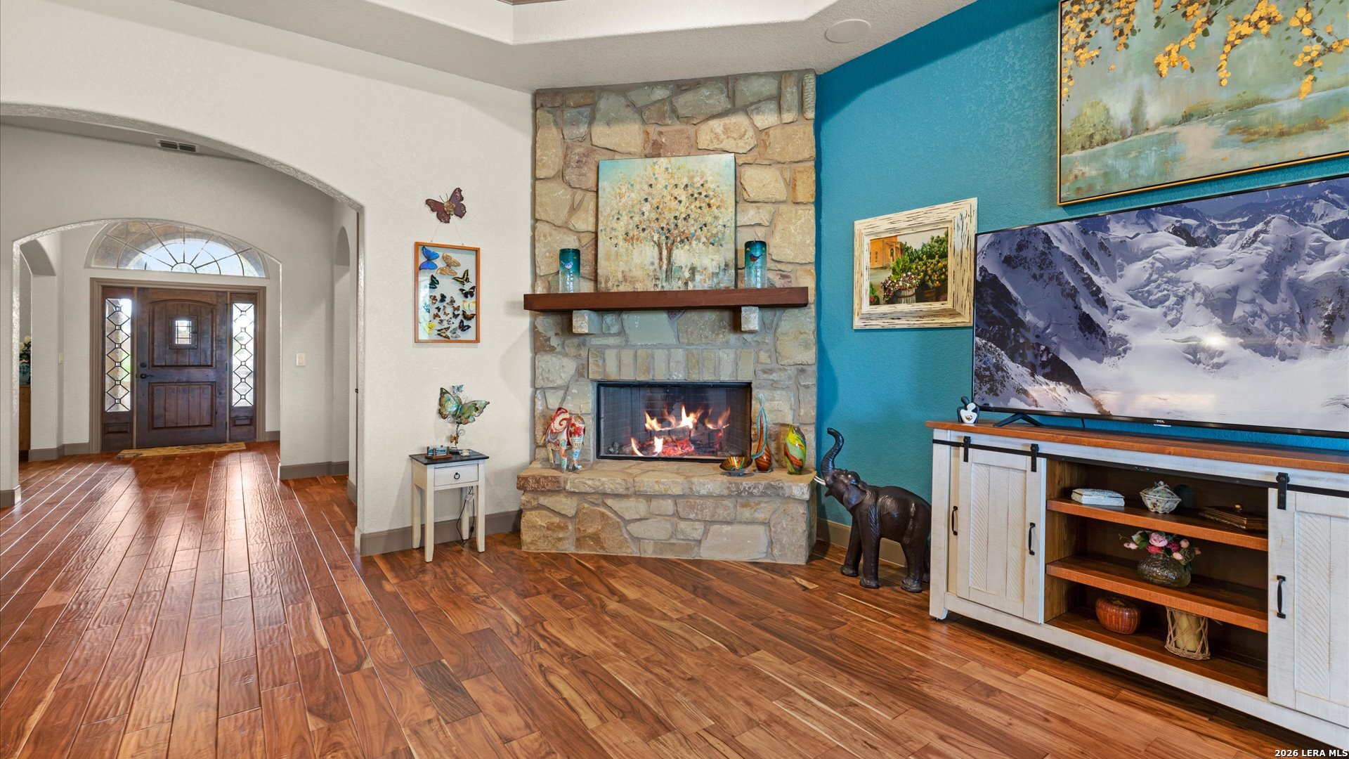 Stunning custom Hill Country estate in the highly sought-after River Chase community, perfectly situated on 2.63 private, oak-studded acres. This beautifully designed single-story home offers 3 bedrooms, 3 full baths, a half bath, and two spacious living areas, including a formal sitting area, across 3,442 square feet of thoughtfully crafted living space. From the moment you arrive, the striking stone exterior, arched entry, and metal roof set the tone for timeless quality and craftsmanship. Inside, warm wood flooring, architectural details, and an inviting stone fireplace create a welcoming yet refined atmosphere. The open-concept layout is ideal for both everyday living and entertaining, with multiple living spaces offering flexibility for gathering, relaxing, or working from home. The well-appointed kitchen features custom cabinetry, granite countertops, and designer finishes. The private primary suite is a true retreat, featuring a dedicated sitting area and a spa-like bath with soaking tub, walk-in shower, and generous closet space. Secondary bedrooms are well-sized with access to beautifully finished baths. Step outside to your own Hill Country oasis-an expansive covered patio overlooking a resort-style pool with water features, surrounded by mature trees and scenic views. Whether hosting guests or enjoying a quiet evening, this outdoor space delivers exceptional privacy and tranquility. A rare and highly desirable feature, the 18x50 detached workshop/RV garage is fully insulated and equipped with electricity and remote access-perfect for a workshop, recreational vehicles, or additional storage. The property also includes an attached garage, offering both convenience and versatility. Located in River Chase, residents enjoy exclusive access to premier amenities including a private Guadalupe River park, clubhouse, fitness center, and scenic walking trails-all just minutes from shopping, dining, and the charm of New Braunfels. A rare opportunity to own a private, amenity-rich estate that combines luxury, functionality, and the best of Hill Country living.