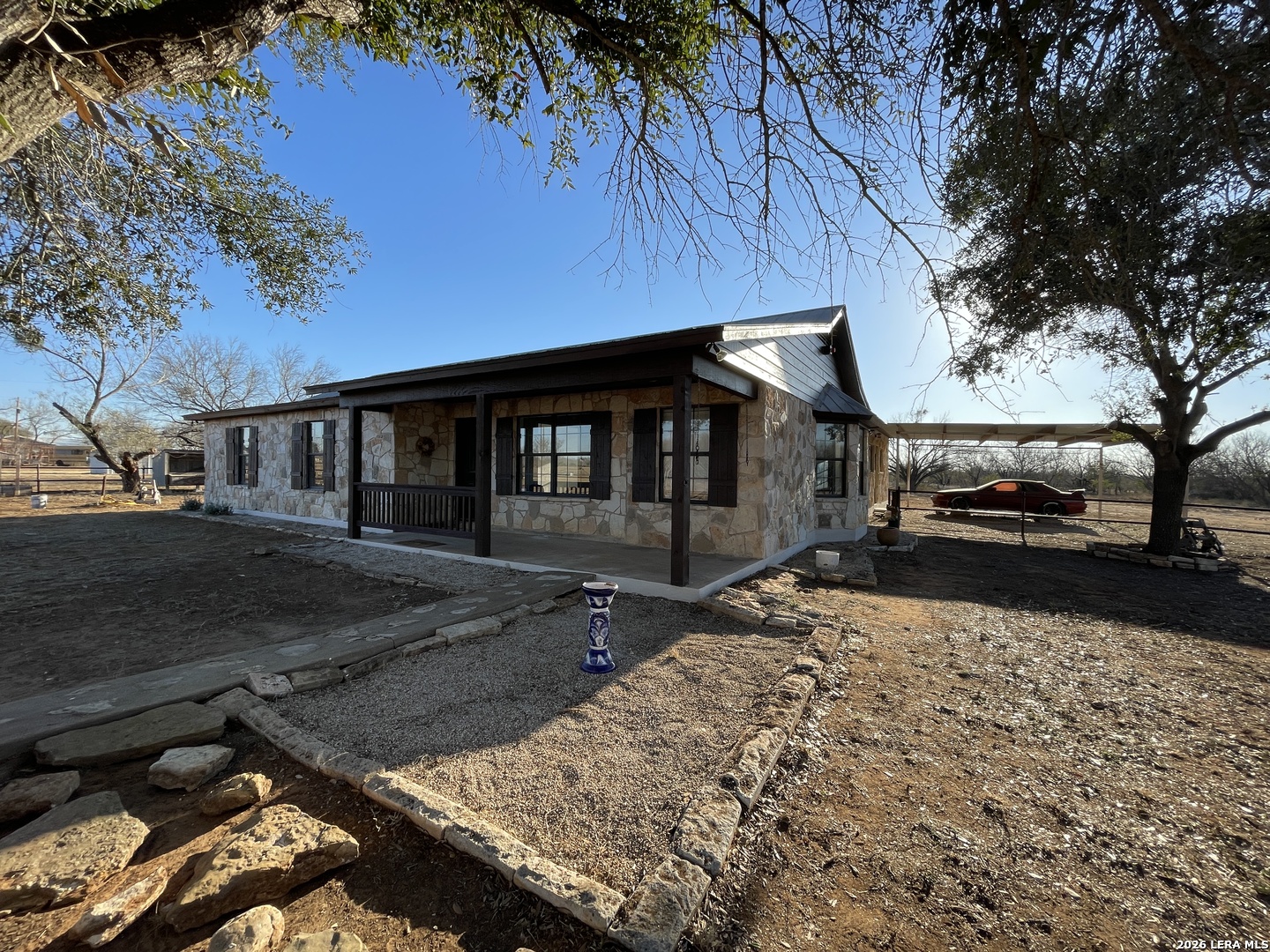 Fabulous 9 acres cross fenced, Pipe fencing around house. Enter property through gate and a circle drive around a mature tree. This versatile 4BR/2.5 BTH OR 3/2.5 Second family rm. or Game Rm with walk in closet and 2 exit doors, vaulted ceiling. Inviting Country Porch, fresh paint inside and out, Home with big family room, formal dining room, spacious kitchen with custom cabinets w/under mount lighting, granite counters, Tile backsplash. Breakfast bay windows, a walk in pantry/office. Home has tiel and wood floors throughout. Nice laundry room and separate mud room with built in shelving. Bathrooms oversized vanities with granite counters several drawers, tile backsplash. Unique game or 2nd master suite (you chose) versatile floor plan. Animals are welcome! kennels and cattle pens and 20X20 slab for future barn or building. Property conveys mineral rights which are currently leased.
