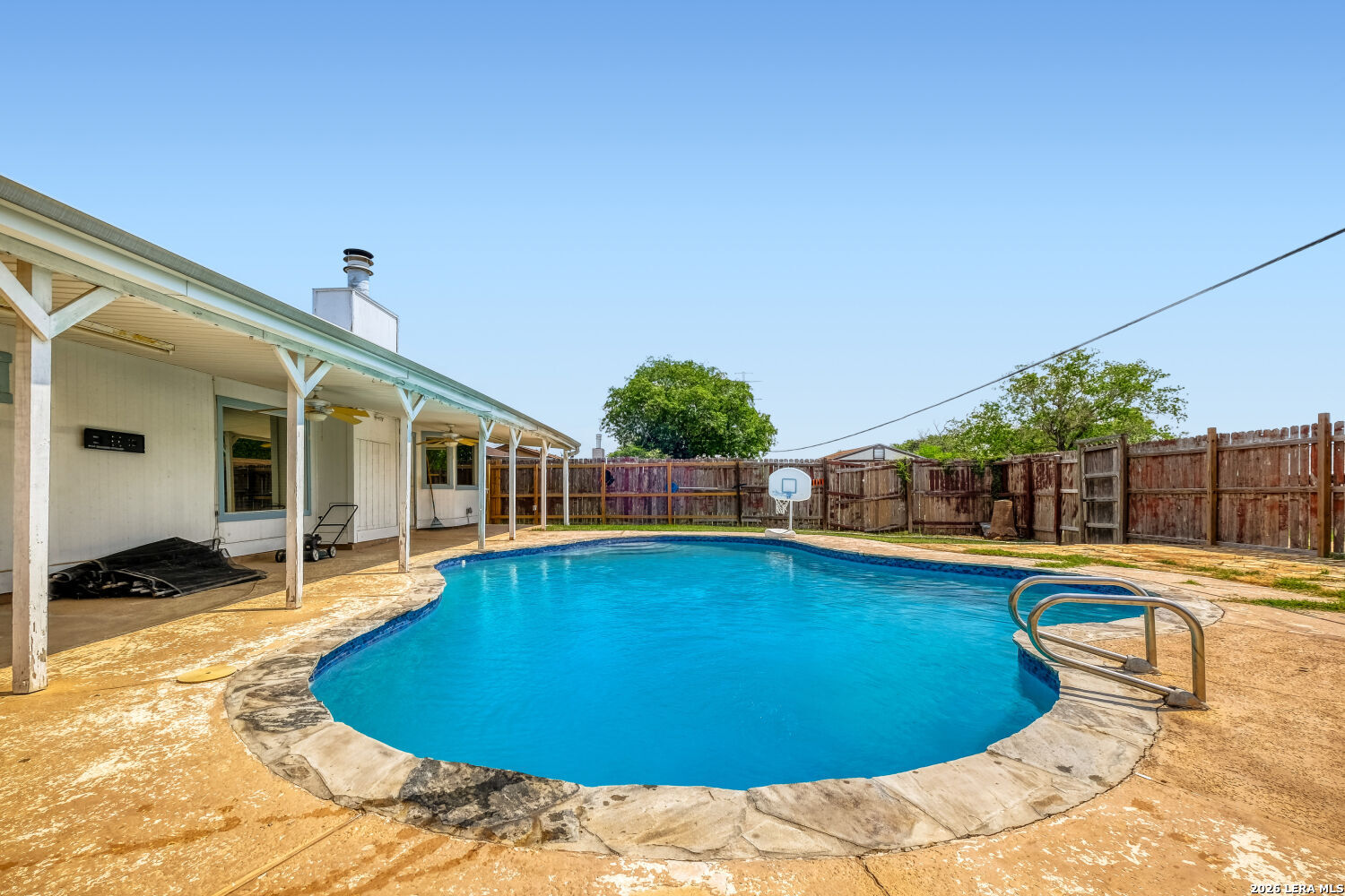 Welcome to this charming single-story home that truly stands out! Featuring 3 spacious bedrooms and 2 full bathrooms, this inviting property offers both comfort and style. Enjoy your morning coffee at the cozy breakfast bar, perfectly positioned to overlook the beautifully landscaped backyard and sparkling pool. Inside, you'll find tasteful finishes throughout and a stunning fireplace that creates the perfect gathering space for family and friends. Step outside to your own private oasis, where tropical-inspired landscaping surrounds a refreshing pool-ideal for relaxing or entertaining all summer long. Conveniently located just minutes from Brooks City Base, you'll have easy access to some of the area's best dining, shopping, and entertainment options. Don't miss your chance to make this exceptional home yours-schedule your showing today!