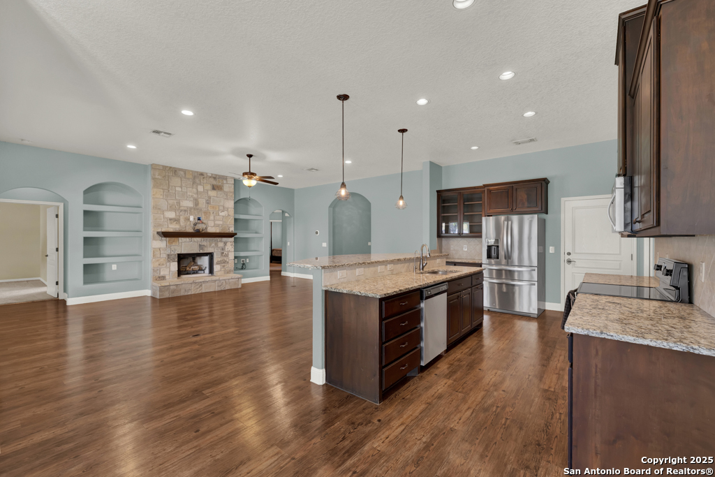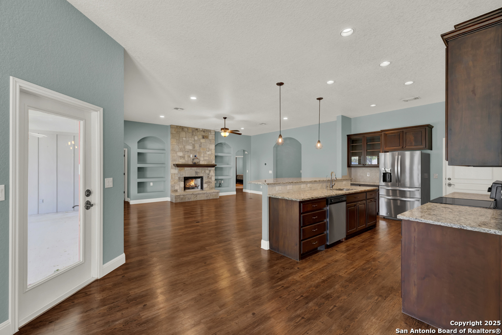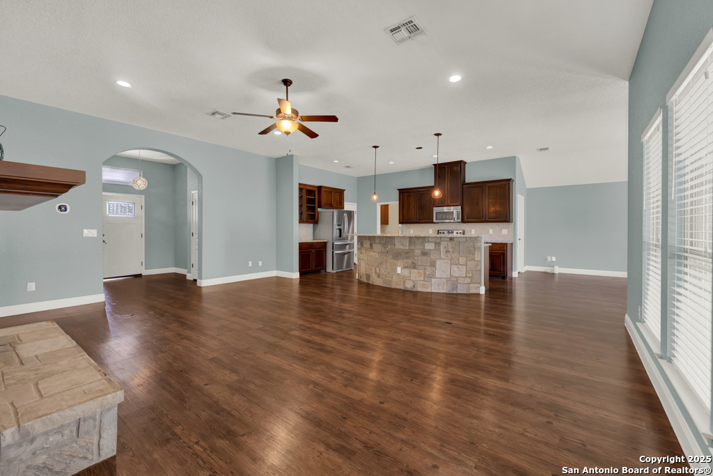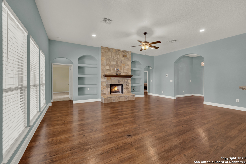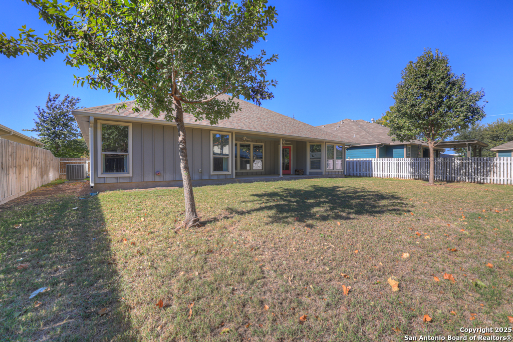 Don't miss this charming 3-bedroom, 2-bath home in Gruene Courtyard-just steps from Gruene's shops, restaurants, and vibrant local attractions! With no HOA and easy access by golf cart, car, or a short walk, convenience is built right in. You're also just minutes from downtown New Braunfels, I-35, and Highways 46/337. This inviting home offers a two-car garage, a welcoming front yard, and a fenced backyard-perfect for pets, morning coffee, or gatherings with family and friends. Inside, you'll find engineered hardwood floors, upgraded lighting, elegant trim molding, and 6-foot windows that bathe the home in natural light. Washer, dryer, and refrigerator are included! The kitchen features custom-stained cabinetry (some with glass fronts), granite countertops, and stainless steel appliances including a microwave, oven, refrigerator, and dishwasher. Additional highlights include a walk-in closet, an upgraded bath with abundant storage, front 2-inch blinds, a tiled walk-in shower with multiple shower heads, upper cabinets in the spacious laundry room, and plenty of kitchen drawers for easy organization. Enjoy cozy evenings by the rock den fireplace with a wood mantel and rock-accented countertop sitting area. Step outside to a covered backyard patio-the perfect space to relax, unwind, and enjoy quiet mornings or evening get-togethers. Come take a look-you're sure to fall in love!