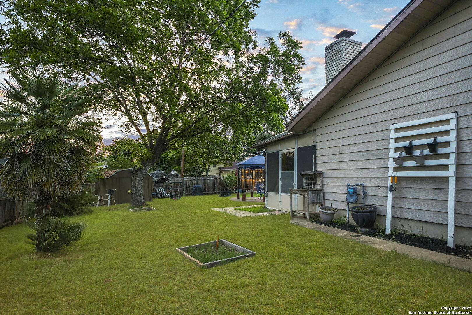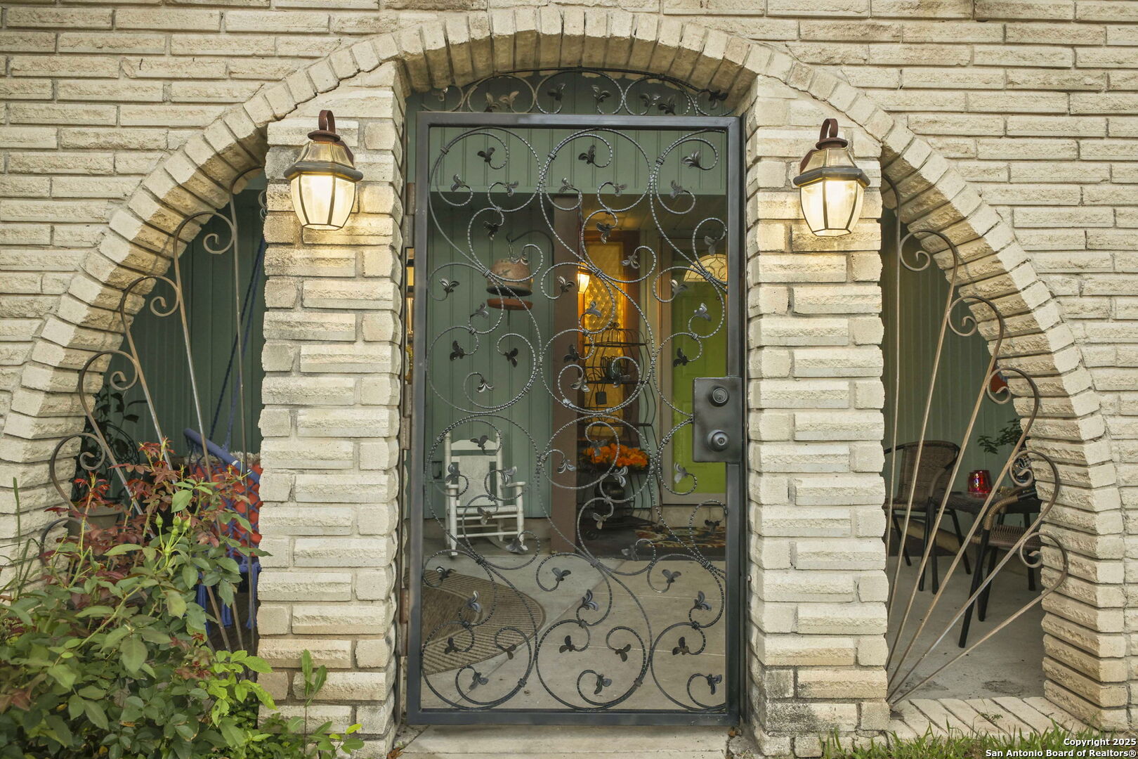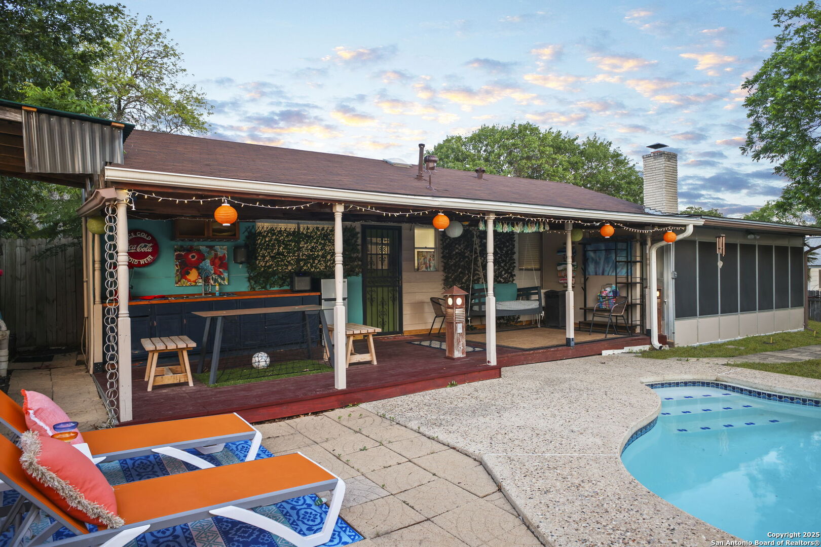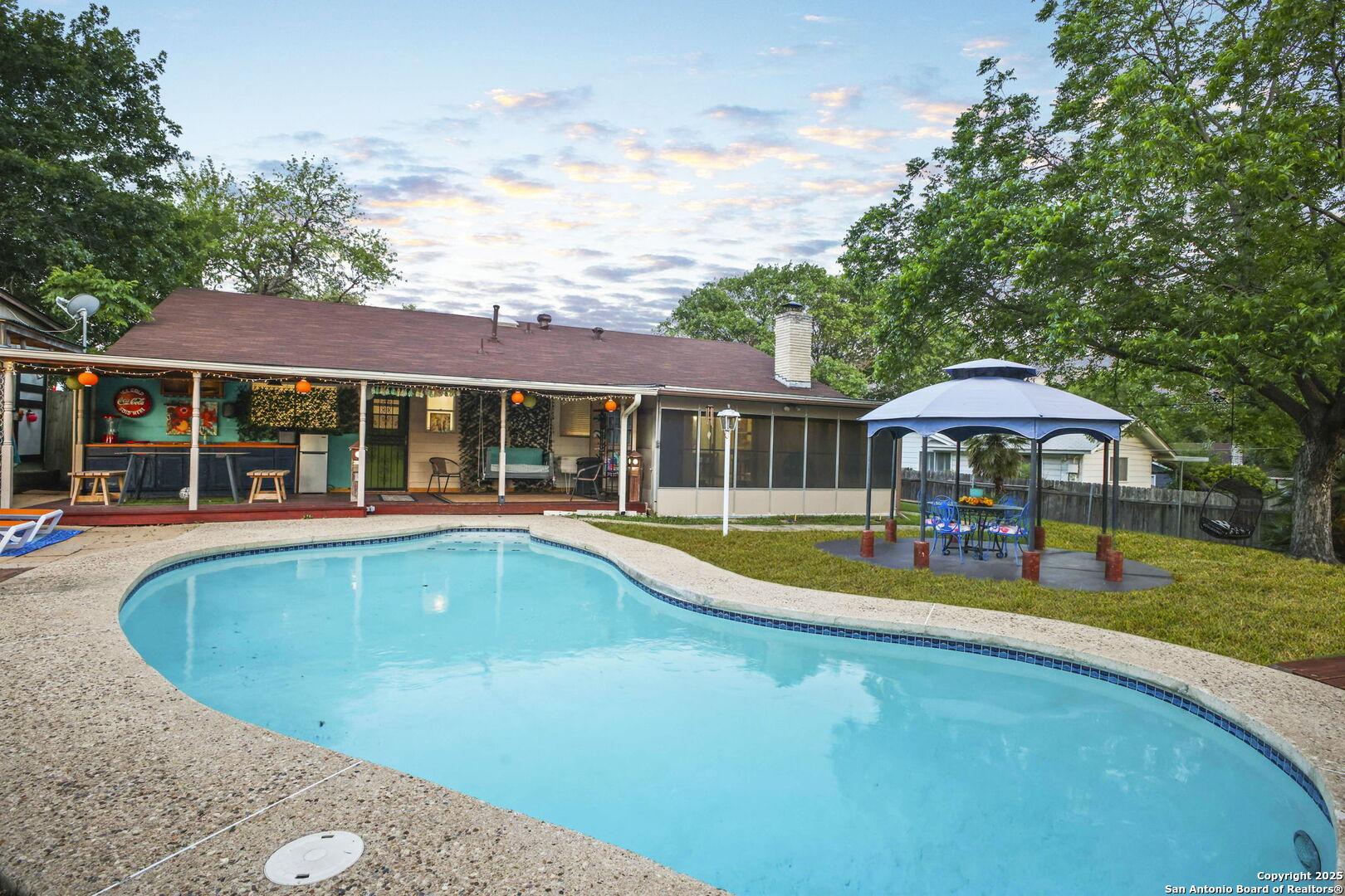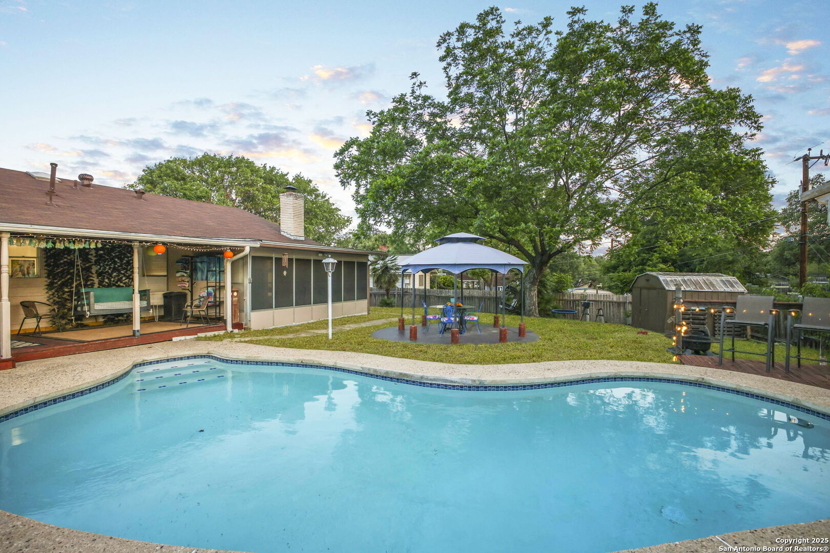 Nestled on a corner lot studded with a mix of young and mature trees, this one-of-a-kind home delivers the ideal blend of lifestyle, comfort, and outdoor living. Whether you're hosting guests or enjoying some "me" time, the thoughtfully designed layout offers a multitude of spaces for gathering or unwinding. Step through the private gated front patio-perfect for morning coffee and a breath of fresh air. Inside, you're welcomed by a bright and open floor plan featuring a dining space by the kitchen, multiple living areas; featuring a cozy fireplace in the living room and a sunroom ideal for family gatherings or quiet moments. At the heart of the home lies a delightful kitchen, featuring granite countertops, breakfast bar, stainless steel appliances including gas cooking, and plenty of space to entertain or cook with ease. A versatile bonus room offers endless possibilities as a game room, media room, or flex space tailored to your lifestyle. Conveniently, the laundry/utility room is located indoors, complete with additional storage room. The primary suite features two walk-in closets, sitting space, and en-suite bath featuring a walk-in shower and quartz vanity. Step outside into your own privately fenced oasis, with a sparkling pool, covered patio deck, gazebo, outdoor prep station with sink, and a cabana with outdoor shower, restroom, and storage. RV parking adds even more convenience to this incredible setup. Located just minutes from the Medical Center, shopping, restaurants, movie theater, and easy access to 410, IH-10, and Wurzbach Parkway.