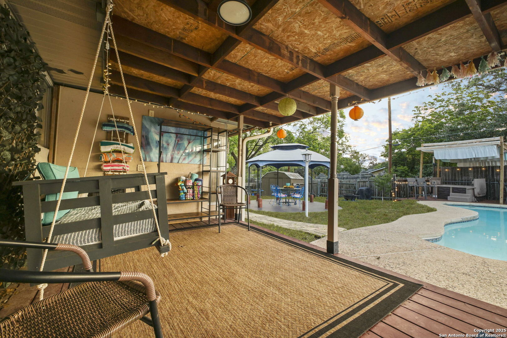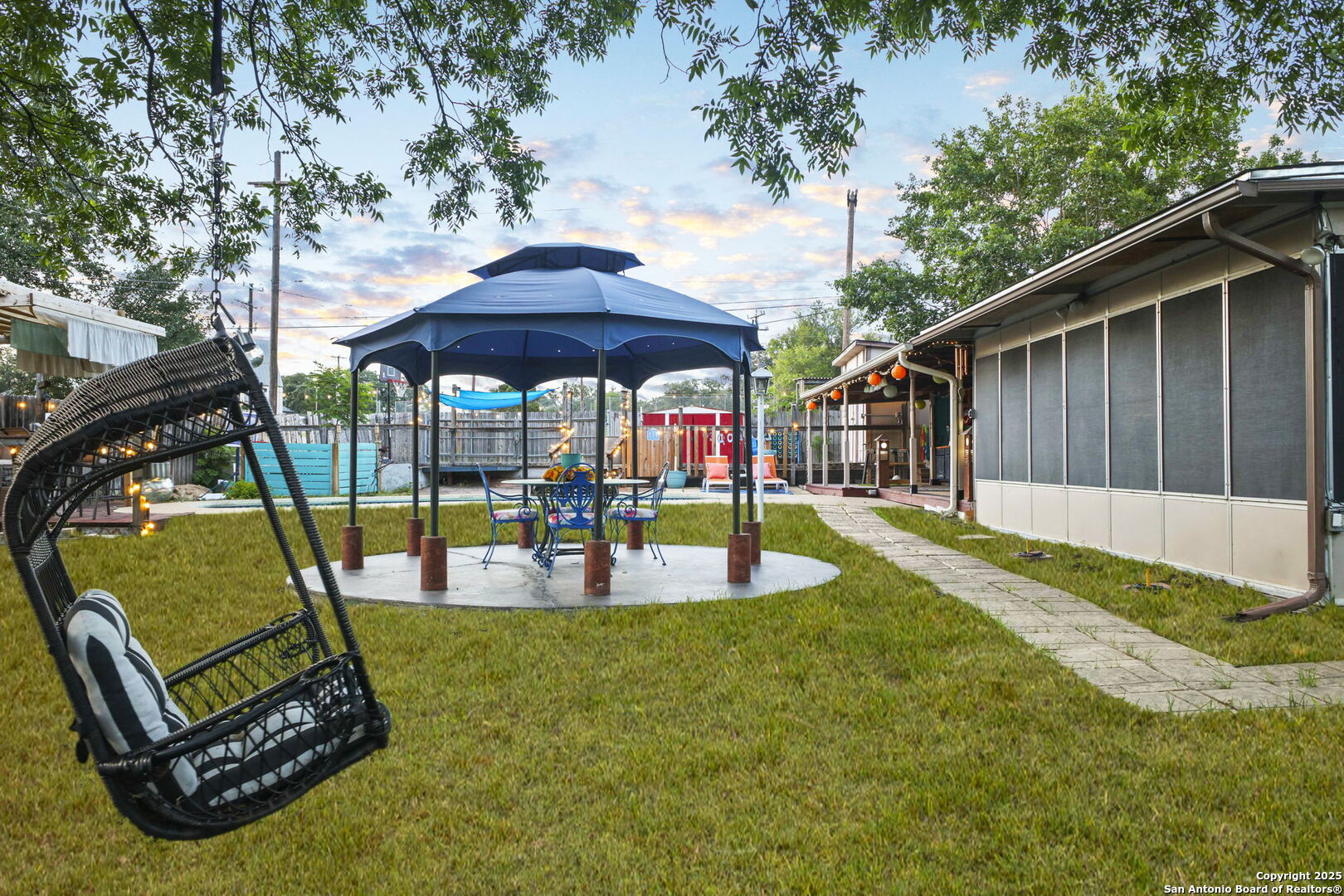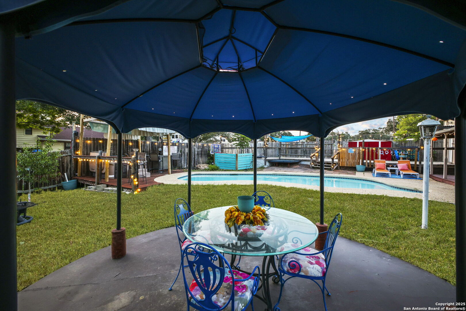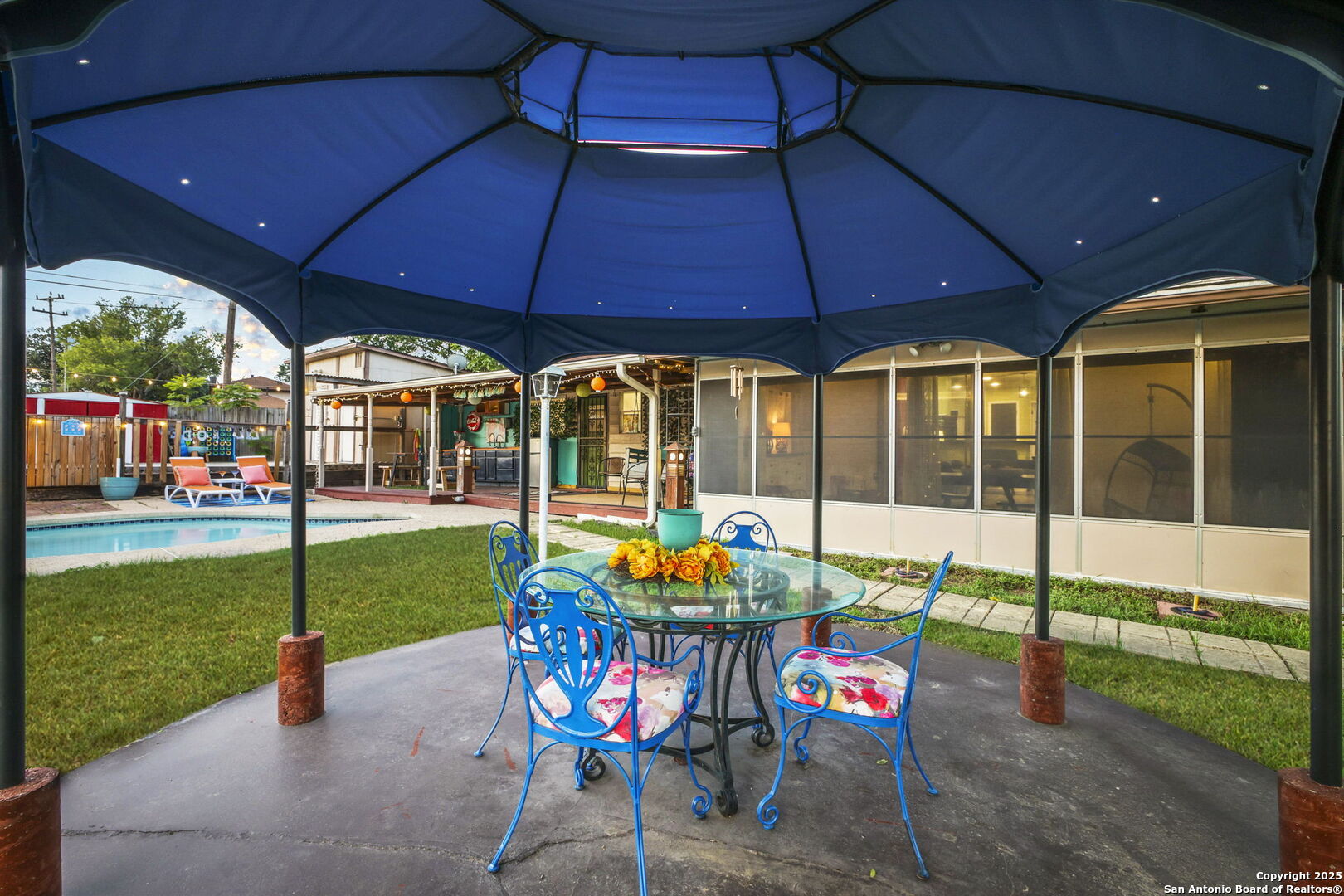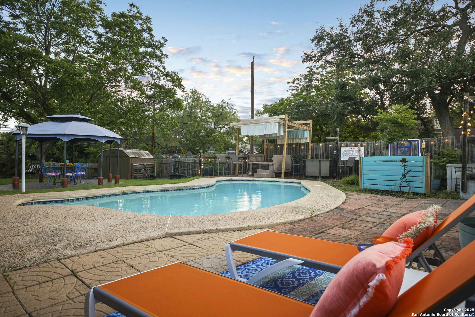 Nestled on a corner lot studded with a mix of young and mature trees, this one-of-a-kind home delivers the ideal blend of lifestyle, comfort, and outdoor living. Whether you're hosting guests or enjoying some "me" time, the thoughtfully designed layout offers a multitude of spaces for gathering or unwinding. Step through the private gated front patio-perfect for morning coffee and a breath of fresh air. Inside, you're welcomed by a bright and open floor plan featuring a dining space by the kitchen, multiple living areas; featuring a cozy fireplace in the living room and a sunroom ideal for family gatherings or quiet moments. At the heart of the home lies a delightful kitchen, featuring granite countertops, breakfast bar, stainless steel appliances including gas cooking, and plenty of space to entertain or cook with ease. A versatile bonus room offers endless possibilities as a game room, media room, or flex space tailored to your lifestyle. Conveniently, the laundry/utility room is located indoors, complete with additional storage room. The primary suite features two walk-in closets, sitting space, and en-suite bath featuring a walk-in shower and quartz vanity. Step outside into your own privately fenced oasis, with a sparkling pool, covered patio deck, gazebo, outdoor prep station with sink, and a cabana with outdoor shower, restroom, and storage. RV parking adds even more convenience to this incredible setup. Located just minutes from the Medical Center, shopping, restaurants, movie theater, and easy access to 410, IH-10, and Wurzbach Parkway.