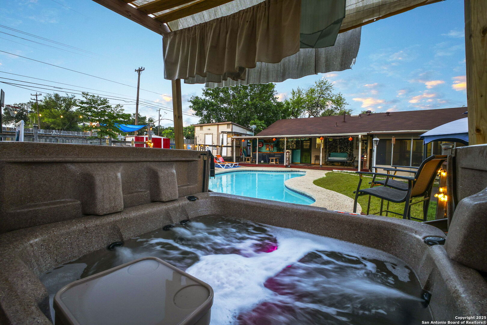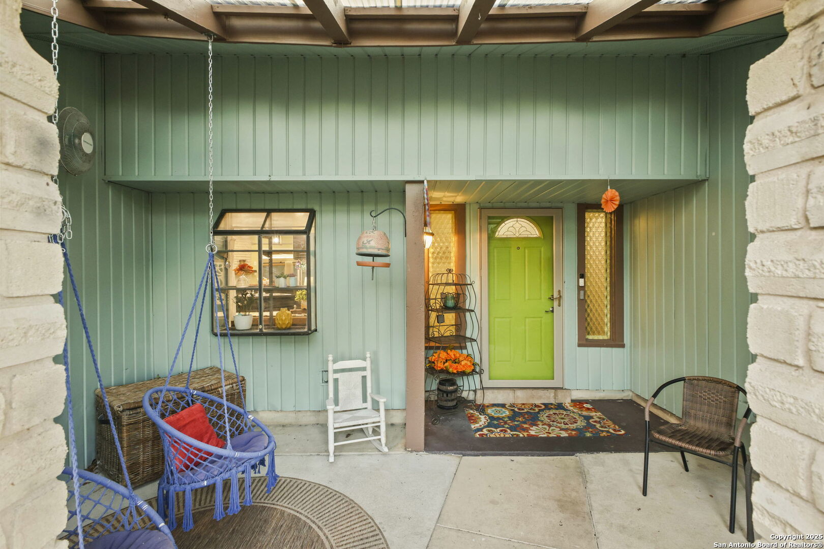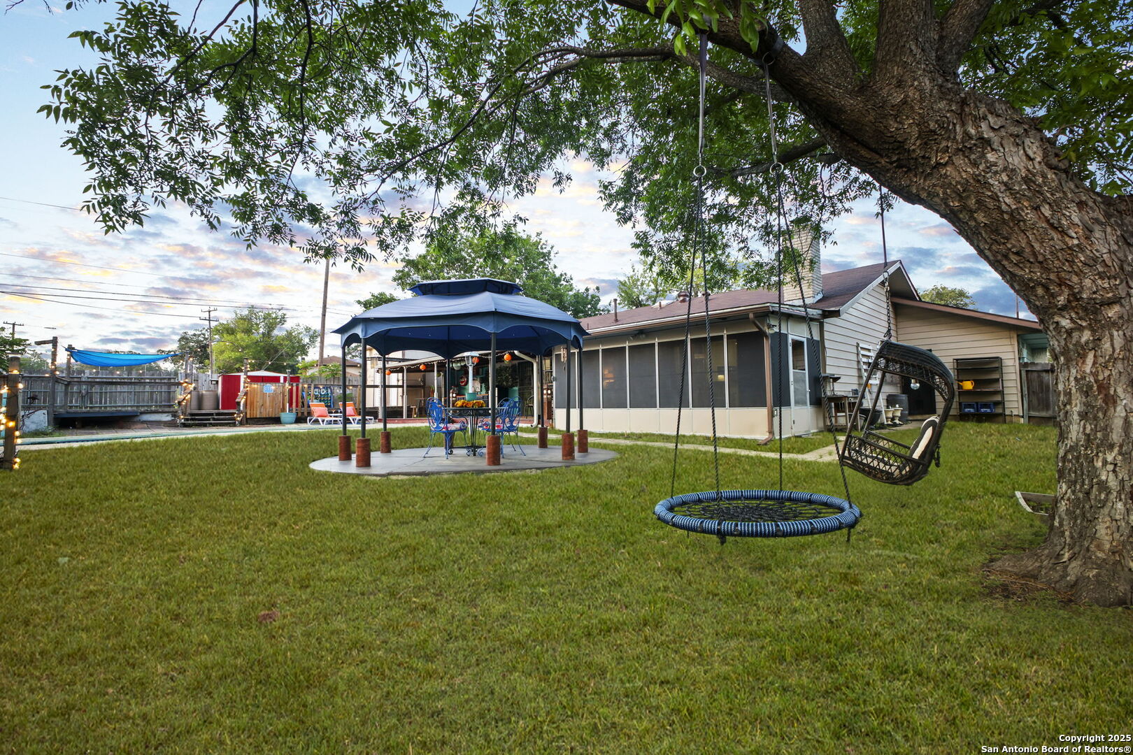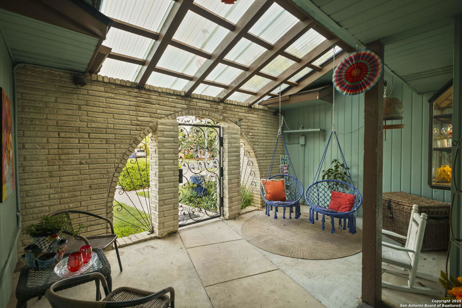 Nestled on a corner lot studded with a mix of young and mature trees, this one-of-a-kind home delivers the ideal blend of lifestyle, comfort, and outdoor living. Whether you're hosting guests or enjoying some "me" time, the thoughtfully designed layout offers a multitude of spaces for gathering or unwinding. Step through the private gated front patio-perfect for morning coffee and a breath of fresh air. Inside, you're welcomed by a bright and open floor plan featuring a dining space by the kitchen, multiple living areas; featuring a cozy fireplace in the living room and a sunroom ideal for family gatherings or quiet moments. At the heart of the home lies a delightful kitchen, featuring granite countertops, breakfast bar, stainless steel appliances including gas cooking, and plenty of space to entertain or cook with ease. A versatile bonus room offers endless possibilities as a game room, media room, or flex space tailored to your lifestyle. Conveniently, the laundry/utility room is located indoors, complete with additional storage room. The primary suite features two walk-in closets, sitting space, and en-suite bath featuring a walk-in shower and quartz vanity. Step outside into your own privately fenced oasis, with a sparkling pool, covered patio deck, gazebo, outdoor prep station with sink, and a cabana with outdoor shower, restroom, and storage. RV parking adds even more convenience to this incredible setup. Located just minutes from the Medical Center, shopping, restaurants, movie theater, and easy access to 410, IH-10, and Wurzbach Parkway.
