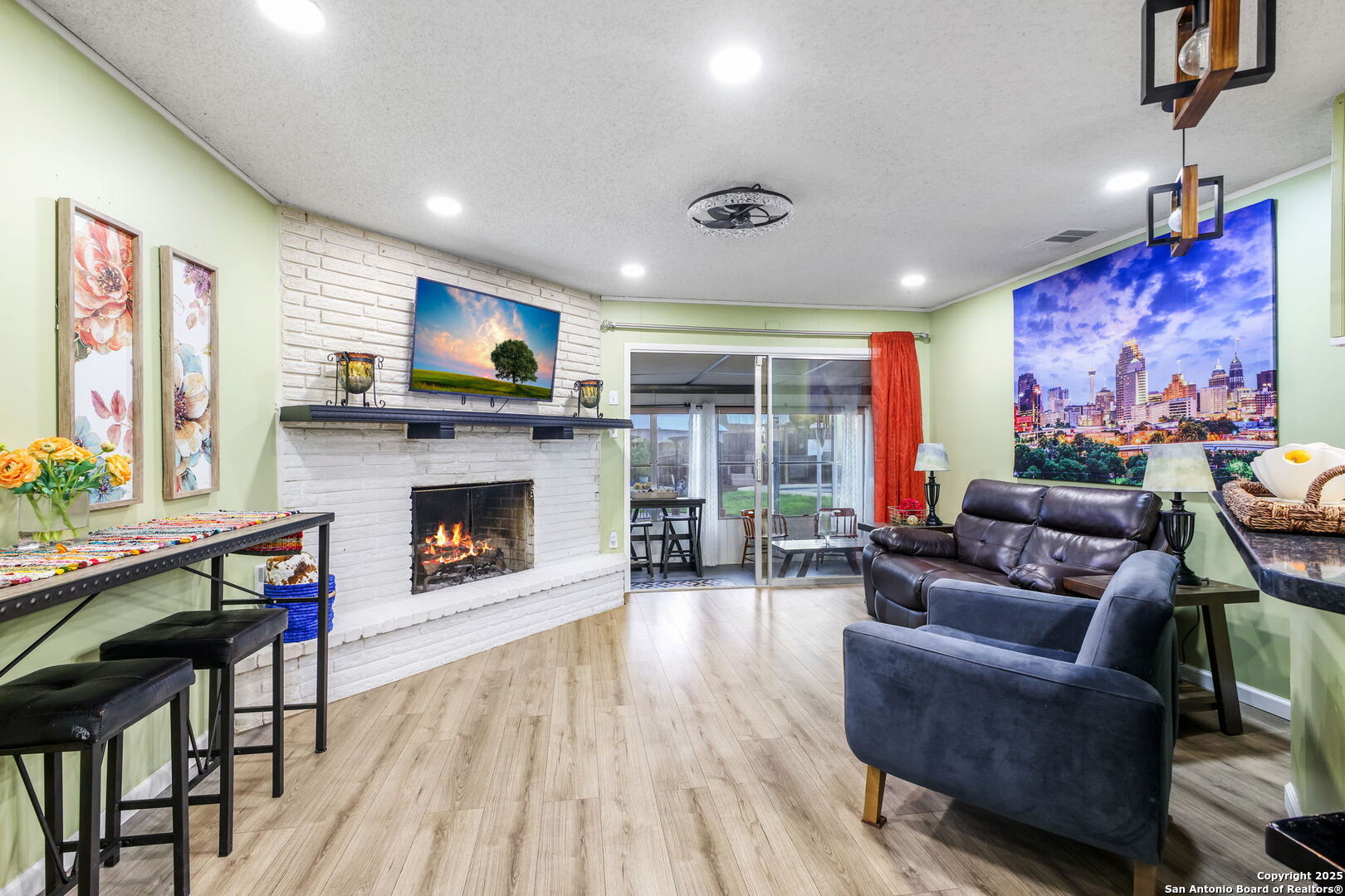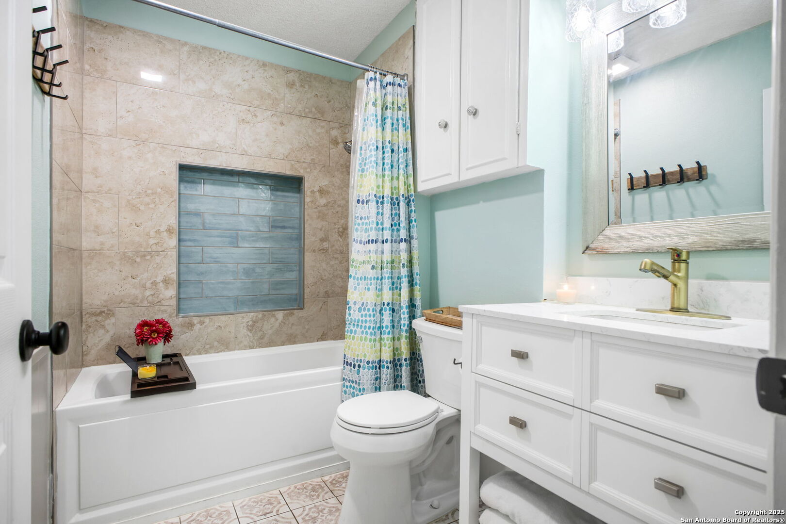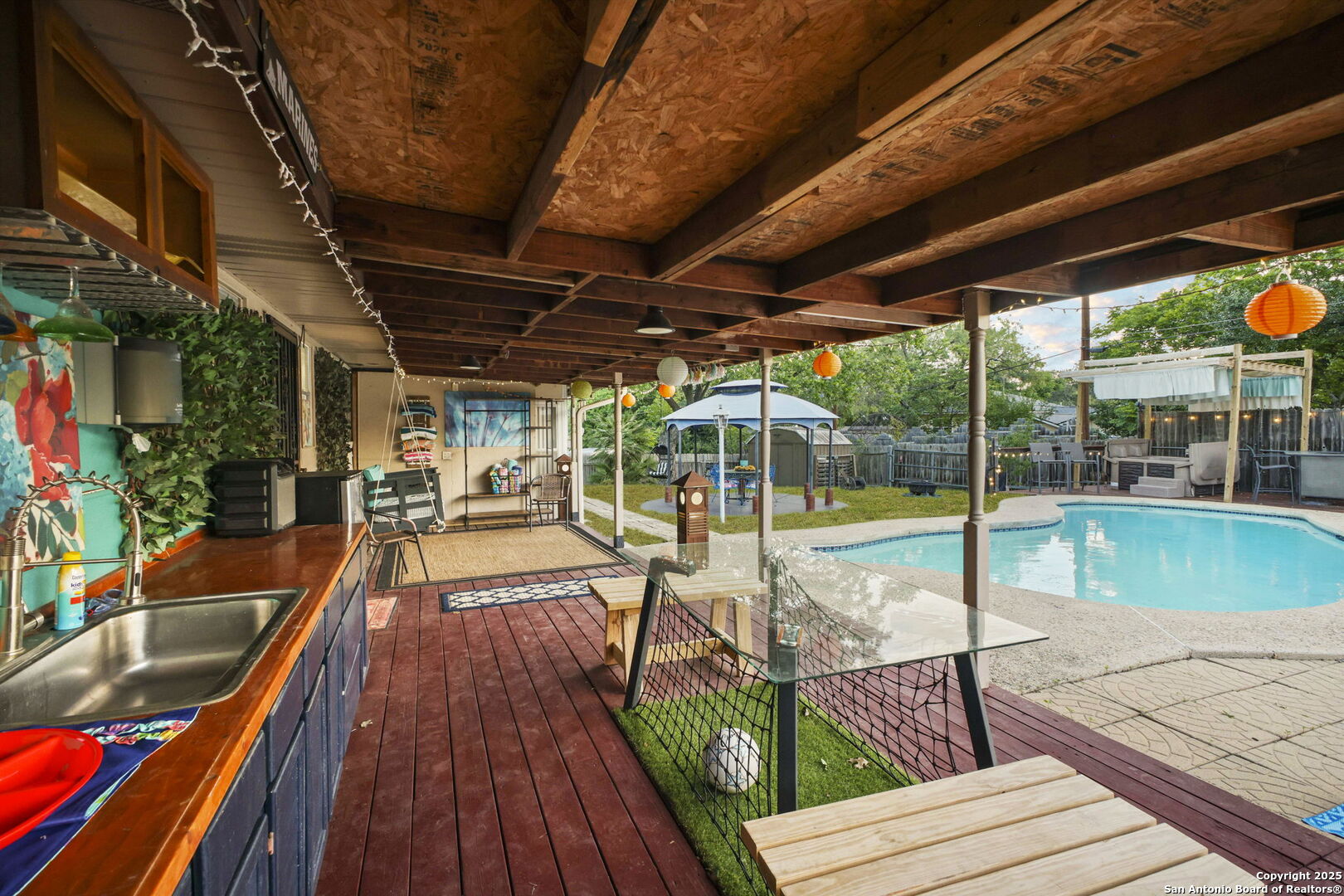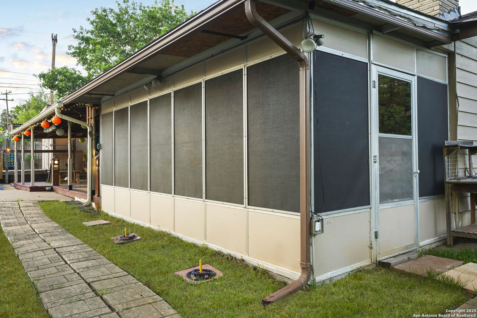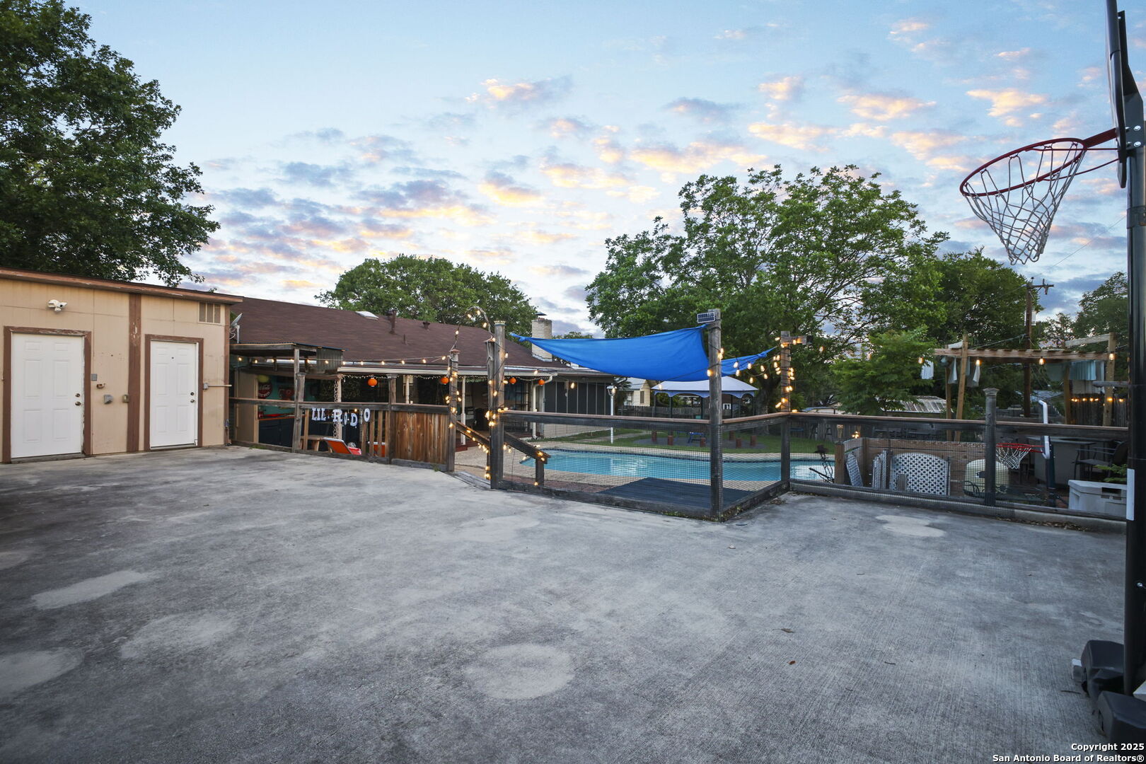 Nestled on a corner lot studded with a mix of young and mature trees, this one-of-a-kind home delivers the ideal blend of lifestyle, comfort, and outdoor living. Whether you're hosting guests or enjoying some "me" time, the thoughtfully designed layout offers a multitude of spaces for gathering or unwinding. Step through the private gated front patio-perfect for morning coffee and a breath of fresh air. Inside, you're welcomed by a bright and open floor plan featuring a dining space by the kitchen, multiple living areas; featuring a cozy fireplace in the living room and a sunroom ideal for family gatherings or quiet moments. At the heart of the home lies a delightful kitchen, featuring granite countertops, breakfast bar, stainless steel appliances including gas cooking, and plenty of space to entertain or cook with ease. A versatile bonus room offers endless possibilities as a game room, media room, or flex space tailored to your lifestyle. Conveniently, the laundry/utility room is located indoors, complete with additional storage room. The primary suite features two walk-in closets, sitting space, and en-suite bath featuring a walk-in shower and quartz vanity. Step outside into your own privately fenced oasis, with a sparkling pool, covered patio deck, gazebo, outdoor prep station with sink, and a cabana with outdoor shower, restroom, and storage. RV parking adds even more convenience to this incredible setup. Located just minutes from the Medical Center, shopping, restaurants, movie theater, and easy access to 410, IH-10, and Wurzbach Parkway.