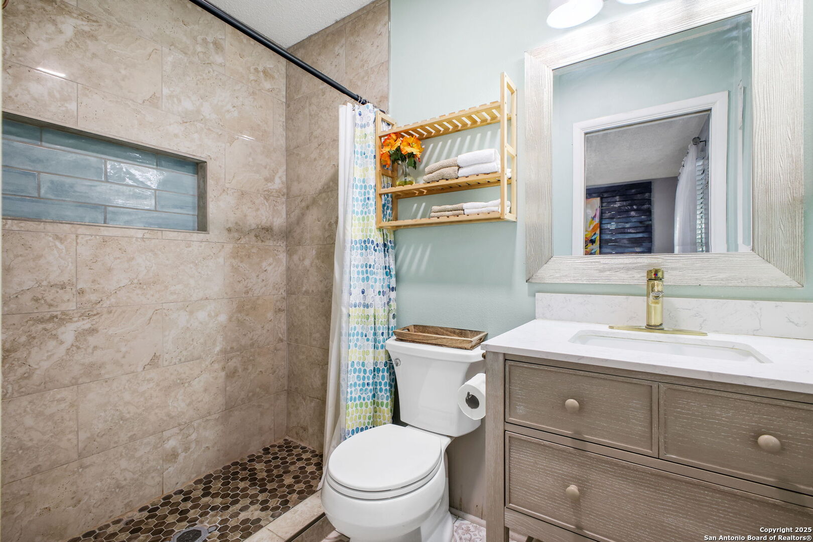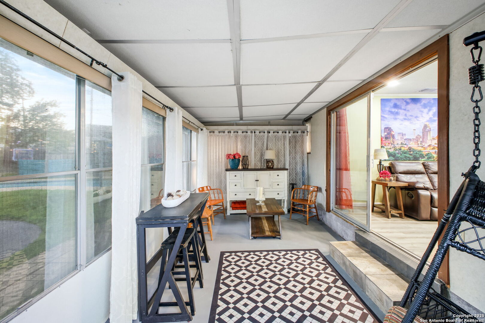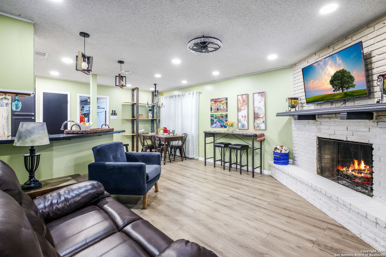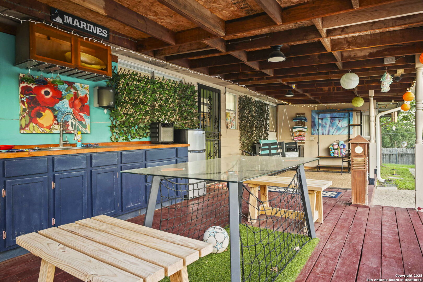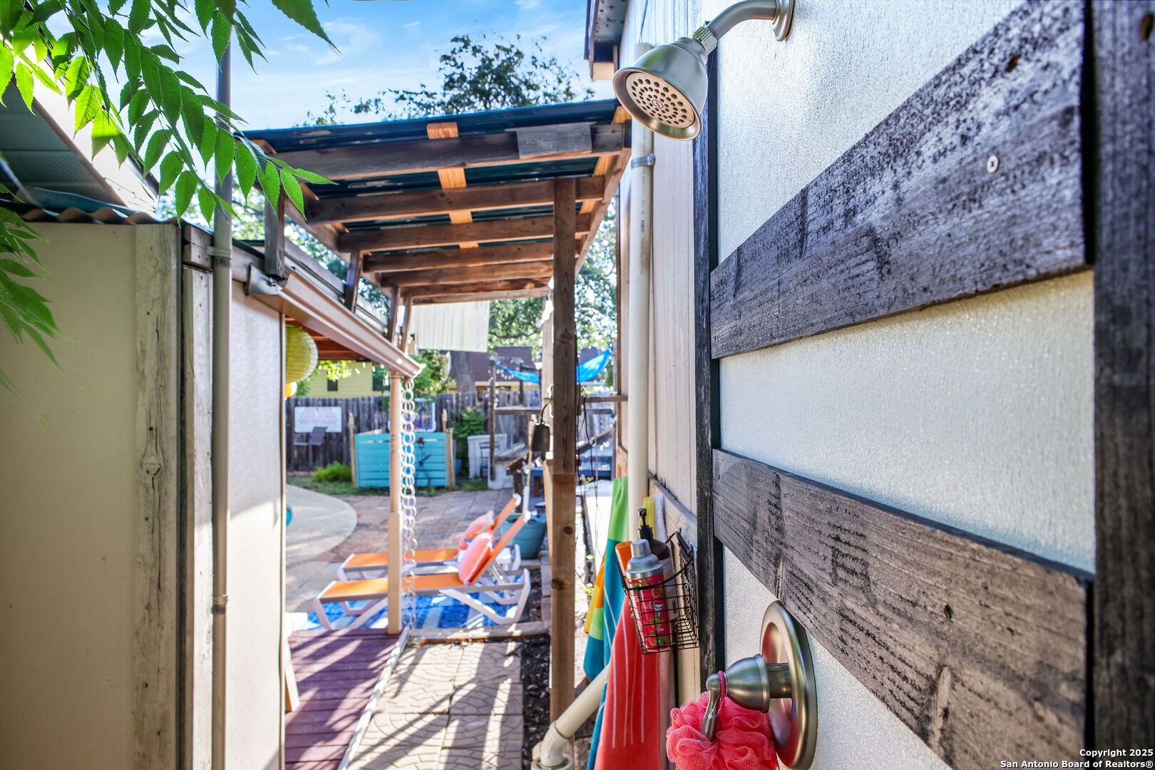 Nestled on a corner lot studded with a mix of young and mature trees, this one-of-a-kind home delivers the ideal blend of lifestyle, comfort, and outdoor living. Whether you're hosting guests or enjoying some "me" time, the thoughtfully designed layout offers a multitude of spaces for gathering or unwinding. Step through the private gated front patio-perfect for morning coffee and a breath of fresh air. Inside, you're welcomed by a bright and open floor plan featuring a dining space by the kitchen, multiple living areas; featuring a cozy fireplace in the living room and a sunroom ideal for family gatherings or quiet moments. At the heart of the home lies a delightful kitchen, featuring granite countertops, breakfast bar, stainless steel appliances including gas cooking, and plenty of space to entertain or cook with ease. A versatile bonus room offers endless possibilities as a game room, media room, or flex space tailored to your lifestyle. Conveniently, the laundry/utility room is located indoors, complete with additional storage room. The primary suite features two walk-in closets, sitting space, and en-suite bath featuring a walk-in shower and quartz vanity. Step outside into your own privately fenced oasis, with a sparkling pool, covered patio deck, gazebo, outdoor prep station with sink, and a cabana with outdoor shower, restroom, and storage. RV parking adds even more convenience to this incredible setup. Located just minutes from the Medical Center, shopping, restaurants, movie theater, and easy access to 410, IH-10, and Wurzbach Parkway.