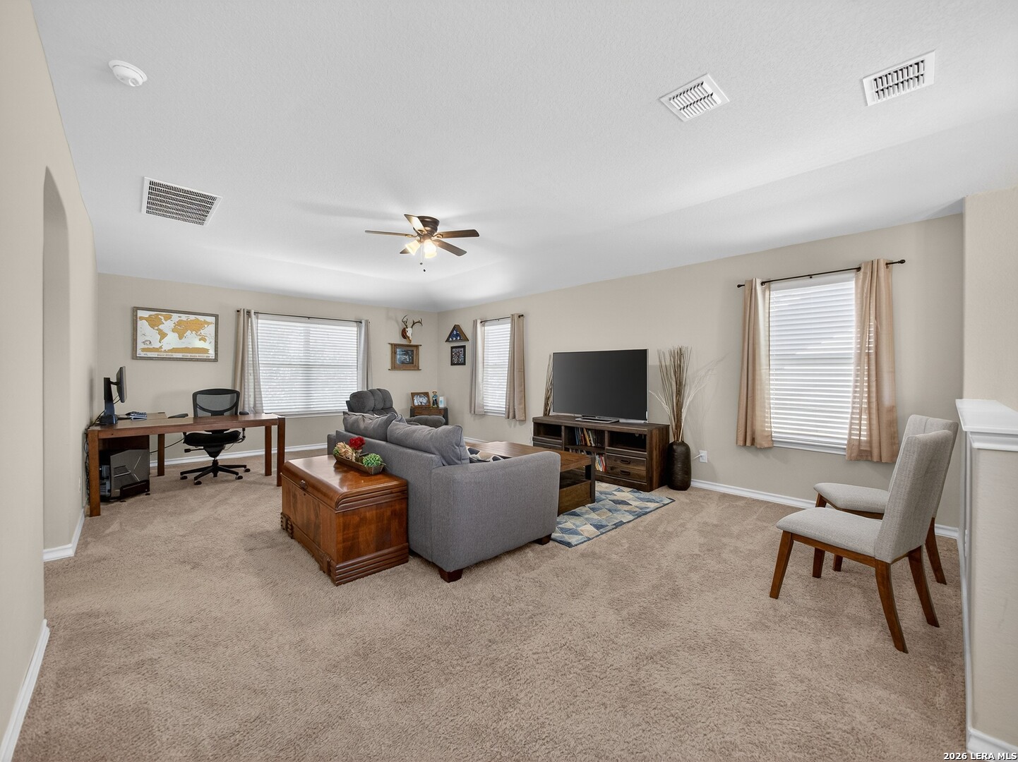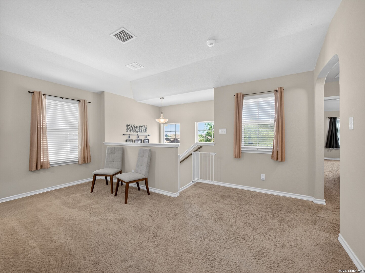 Come and see this beautiful 2-story home featuring 3 bedrooms and 2.5 bathrooms, thoughtfully designed with an open-concept floor plan that allows seamless flow from the living room and dining area into the kitchen, perfect for everyday living and entertaining. The kitchen boasts granite countertops, gas cooking, and plenty of cabinet space for storage and functionality. Upstairs, you will find all bedrooms along with a large loft area that serves as a second living space or game room. All bedrooms and the loft are carpeted for added comfort. The spacious primary suite offers a private retreat with an ensuite bath featuring a garden tub, walk-in shower, dual vanity, and a walk-in closet. Additional highlights include an attached 2-car garage with a 240-volt hookup, ideal for tools or charging. Step outside to a spacious backyard with a wooden fence, mature trees providing shade, and a storage shed. Conveniently located just minutes from I-410 and within a community that features a neighborhood park, this home combines comfort, space, and accessibility.