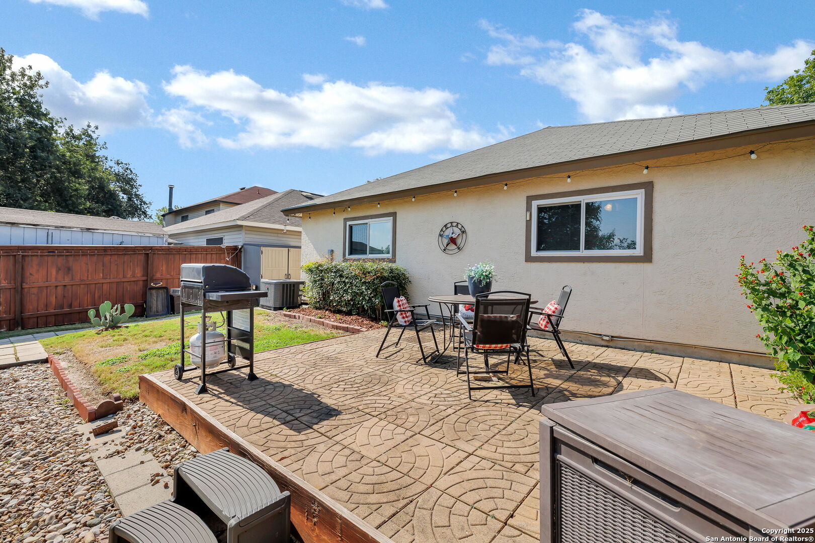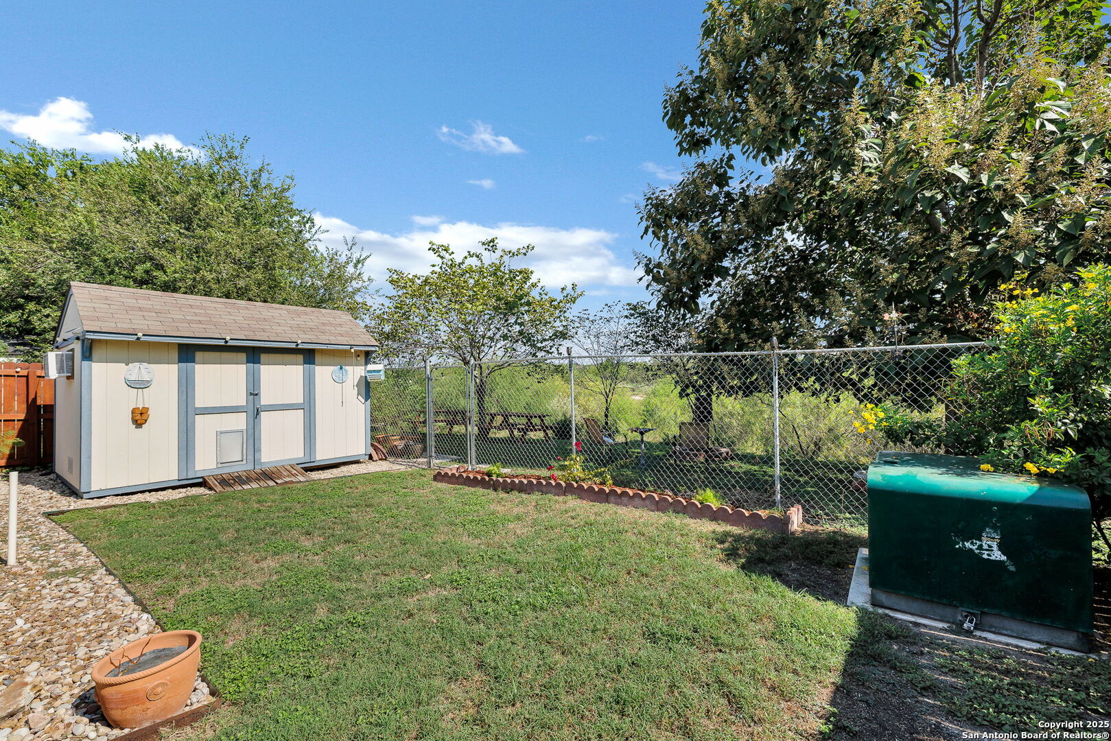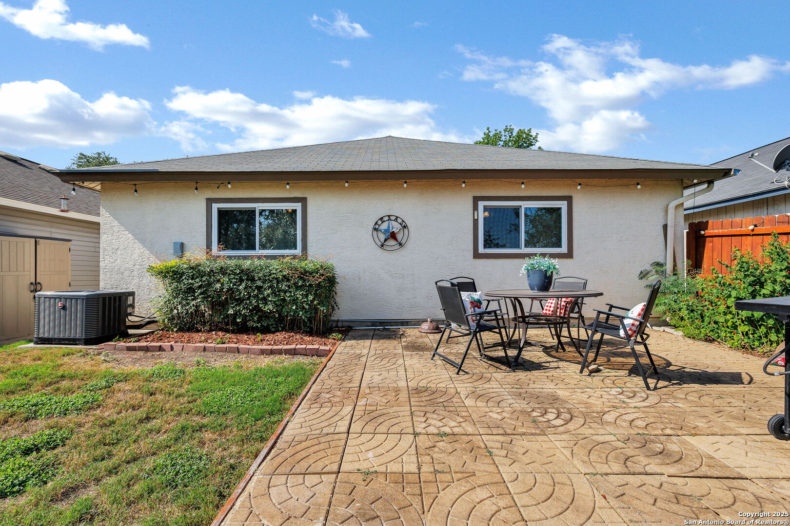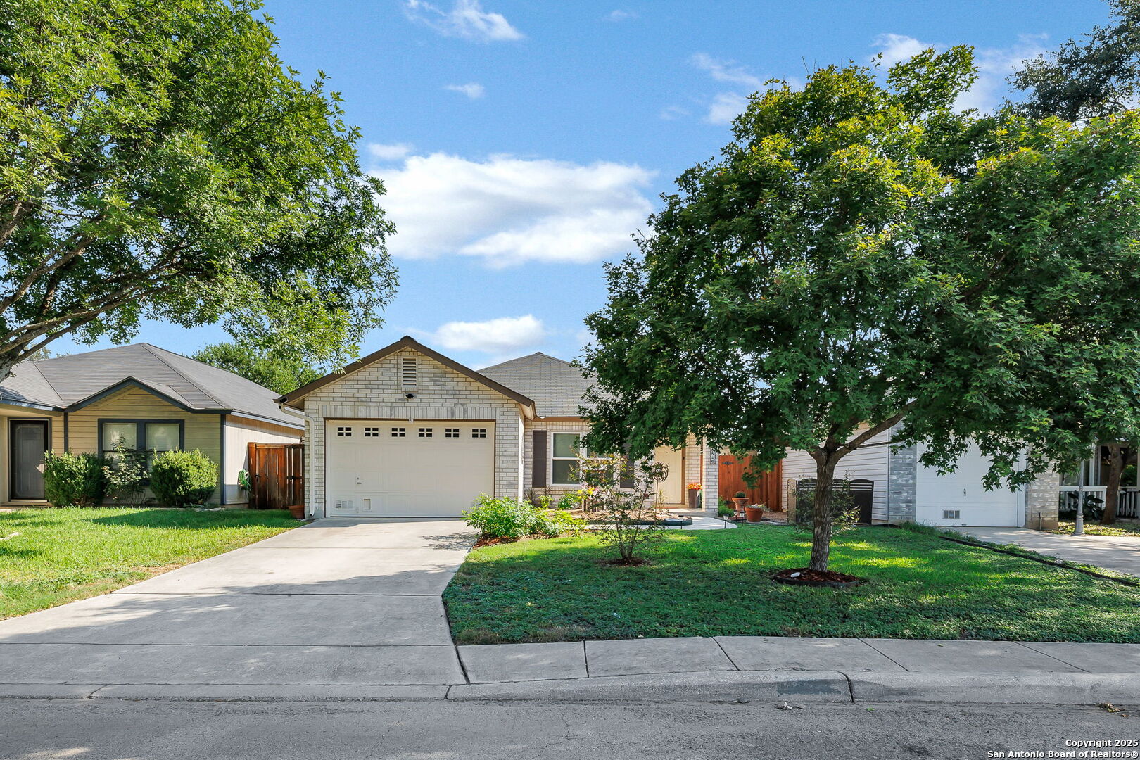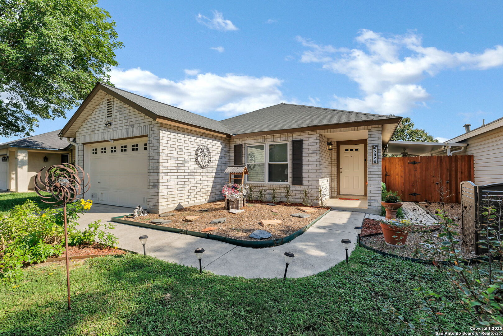 Like-new, immaculate, and move-in ready! This charming 3 BR/2 BA, 1,389 sq ft home has been meticulously cared for. Surrounded by lush landscaping and large shade trees, it offers an open, flowing floor plan with a spacious living area, hardwood floors throughout, ceiling fans, and a separate dining space. The sleek kitchen features tile flooring, stainless steel appliances, and an adjacent laundry area. The living room includes French doors with custom blinds and windows. The primary bedroom is large and boasts a custom, updated bathroom. Recent upgrades include new custom windows (2018), a new roof (2016), and a HVAC (2024). The living area opens to a private, covered side patio with a ceiling fan, leading to a spacious backyard. The property includes an oversized storage shed with electricity, all situated on a greenbelt. An outdoor seating area with a brick fire pit offers stunning views of wildlife and sunsets beyond the fence line. The insulated and organized garage is as pristine as the home, featuring added attic flooring for extra storage. If you're looking for a perfect home in an ideal location at a great price, this is it!