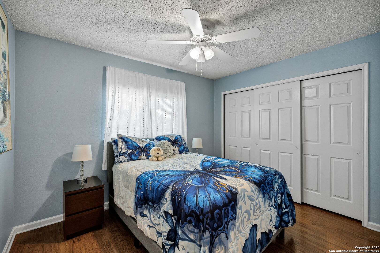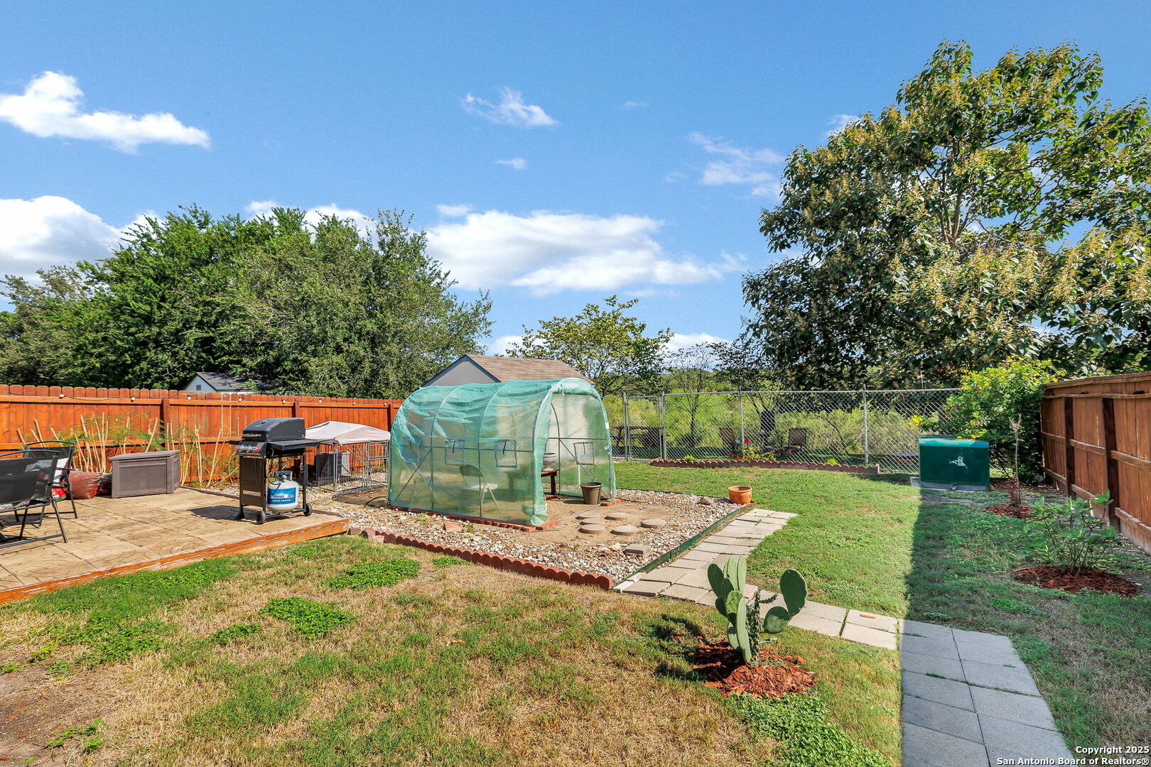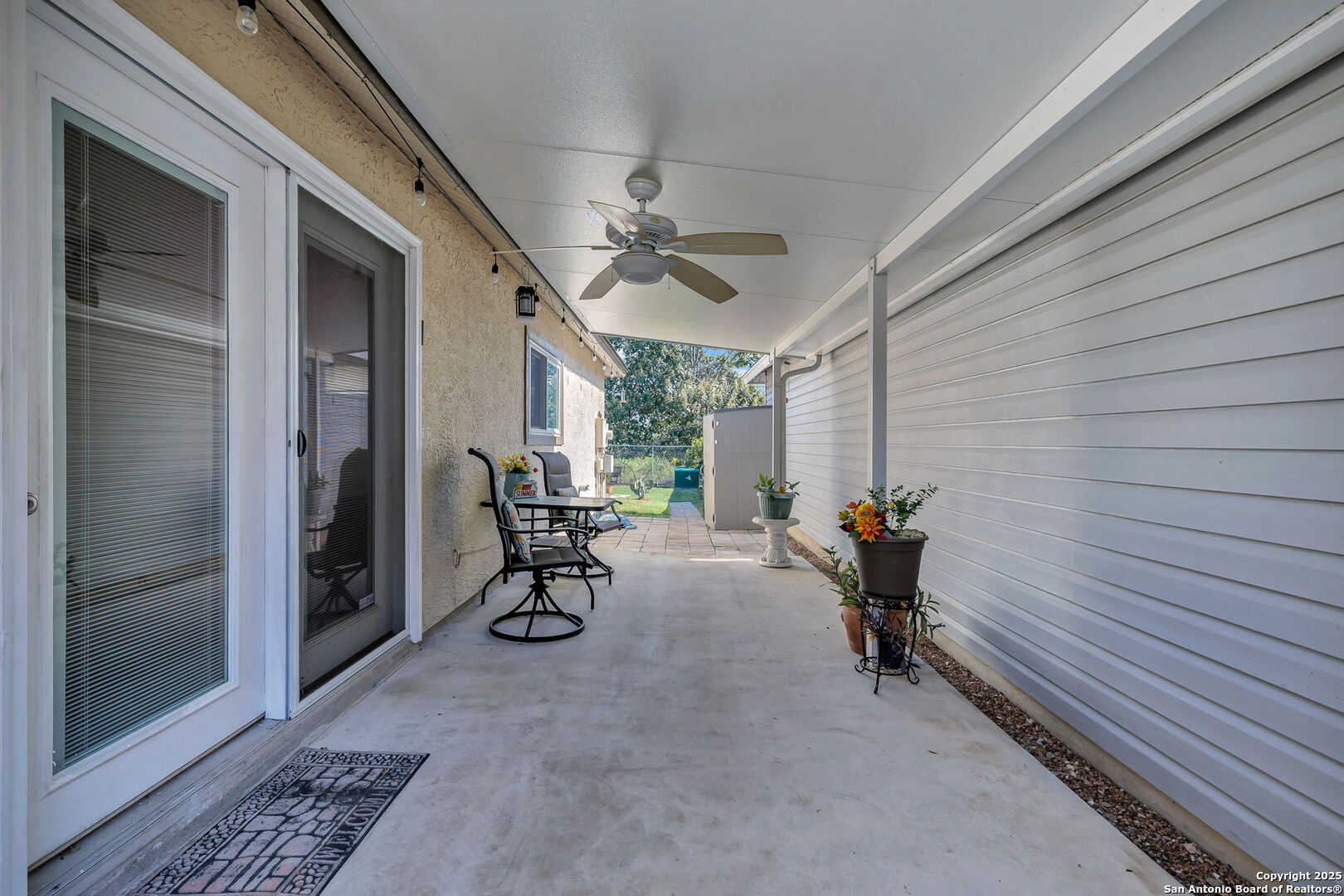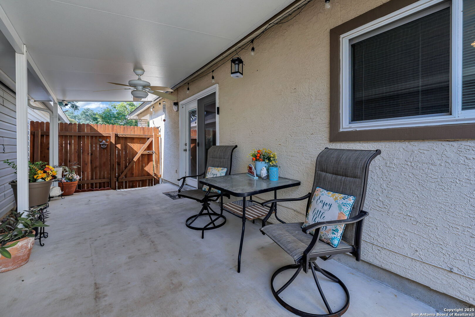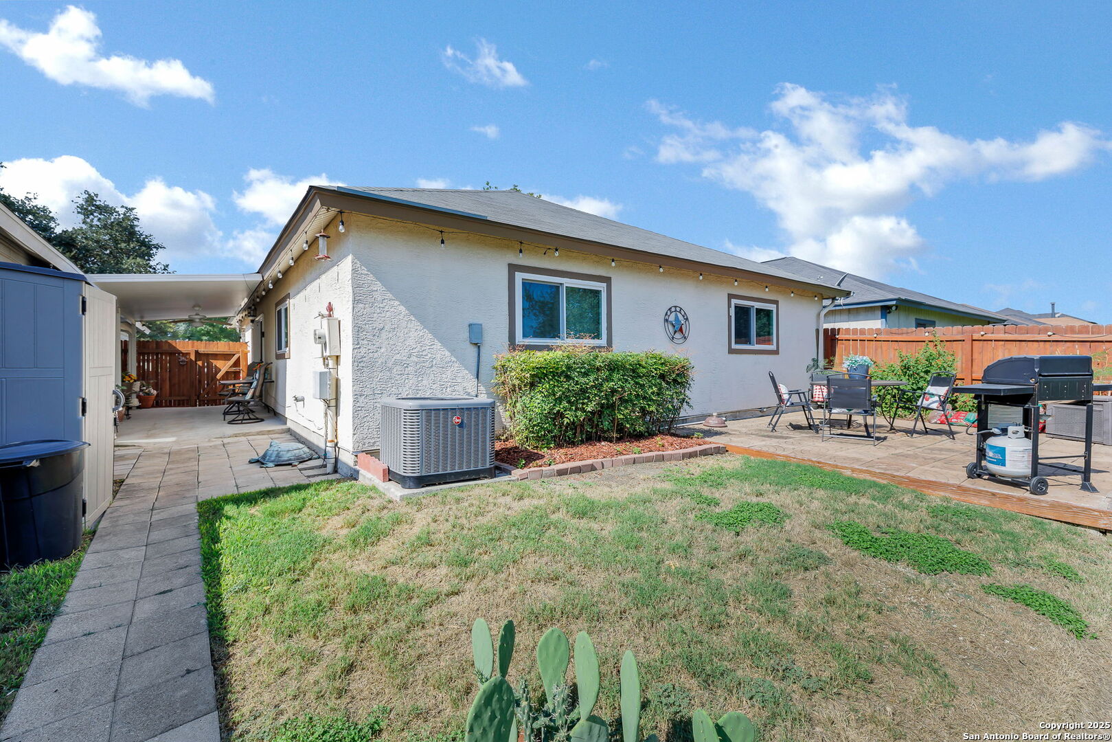 Like-new, immaculate, and move-in ready! This charming 3 BR/2 BA, 1,389 sq ft home has been meticulously cared for. Surrounded by lush landscaping and large shade trees, it offers an open, flowing floor plan with a spacious living area, hardwood floors throughout, ceiling fans, and a separate dining space. The sleek kitchen features tile flooring, stainless steel appliances, and an adjacent laundry area. The living room includes French doors with custom blinds and windows. The primary bedroom is large and boasts a custom, updated bathroom. Recent upgrades include new custom windows (2018), a new roof (2016), and a HVAC (2024). The living area opens to a private, covered side patio with a ceiling fan, leading to a spacious backyard. The property includes an oversized storage shed with electricity, all situated on a greenbelt. An outdoor seating area with a brick fire pit offers stunning views of wildlife and sunsets beyond the fence line. The insulated and organized garage is as pristine as the home, featuring added attic flooring for extra storage. If you're looking for a perfect home in an ideal location at a great price, this is it!
