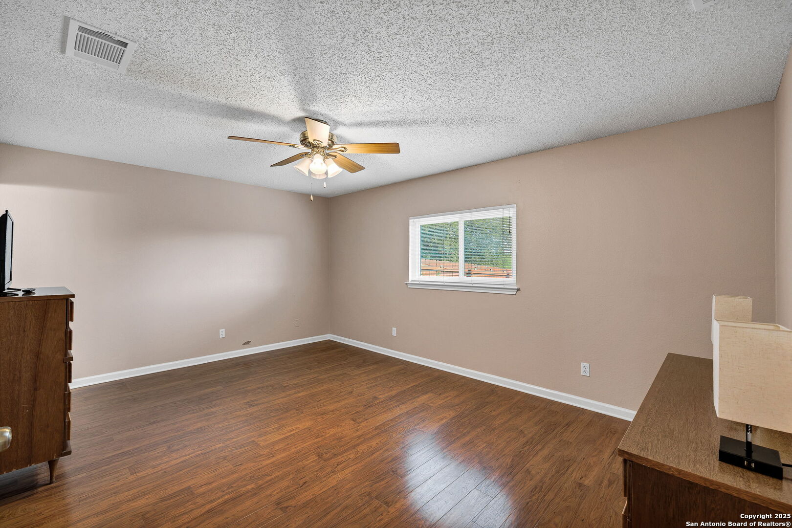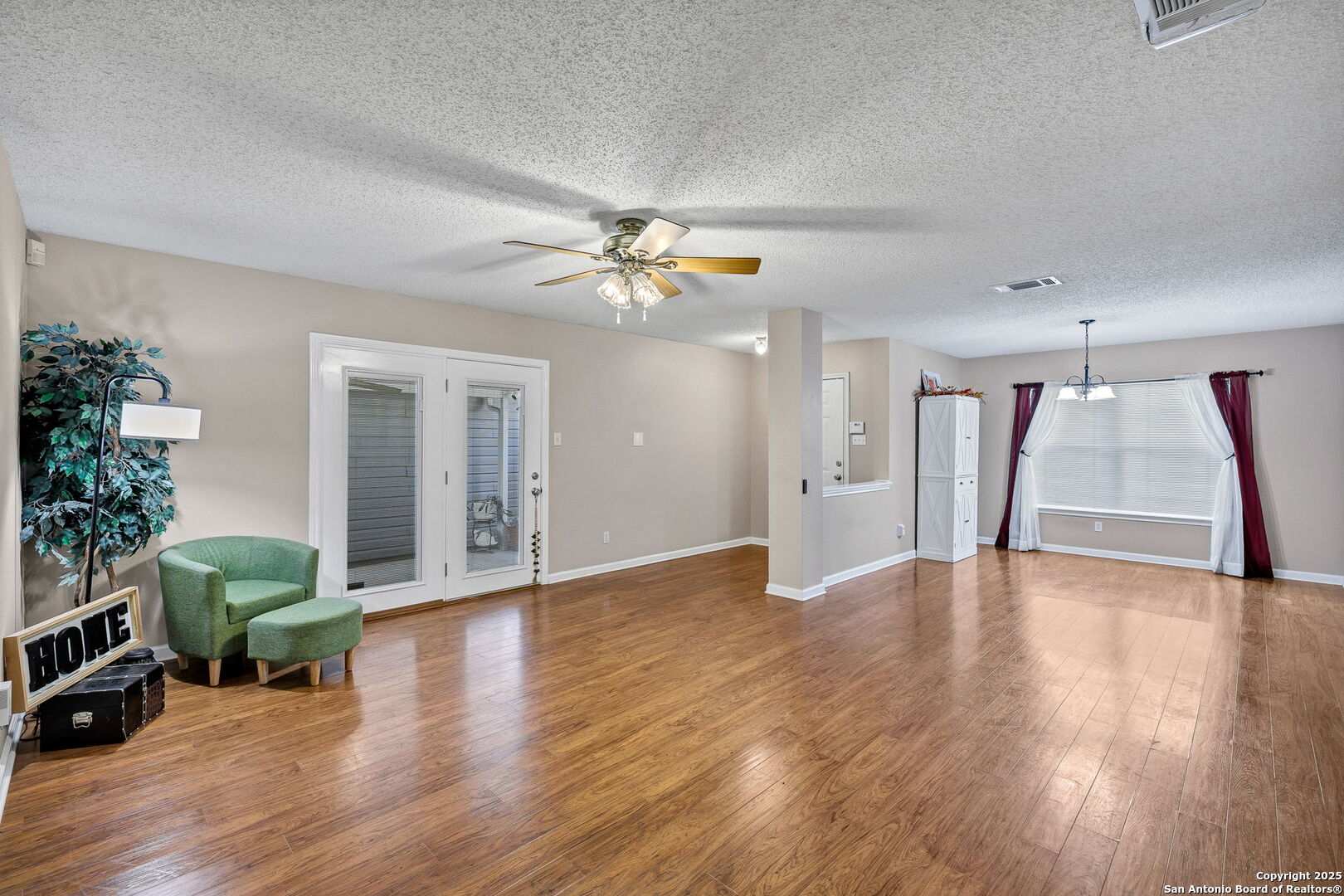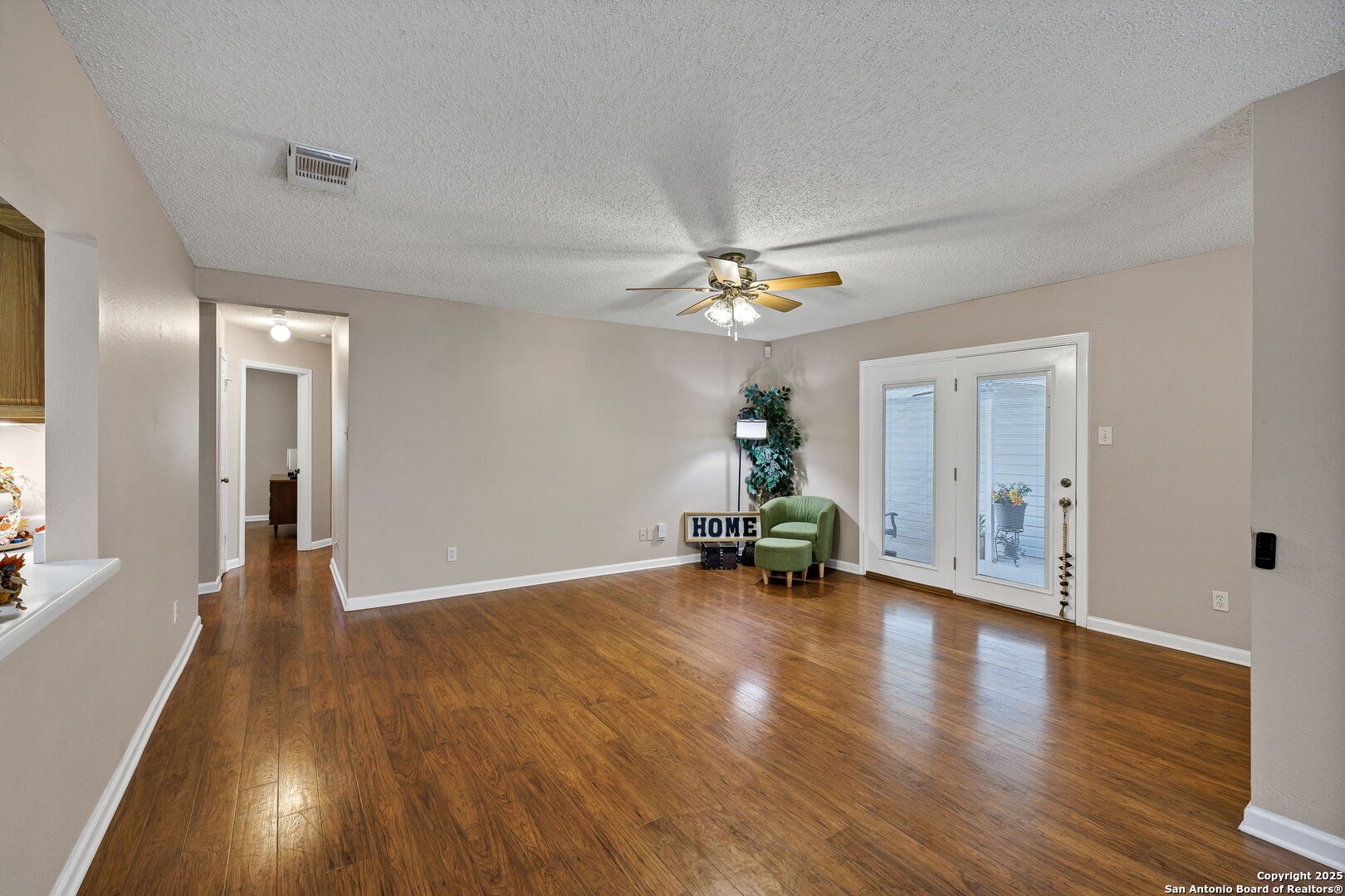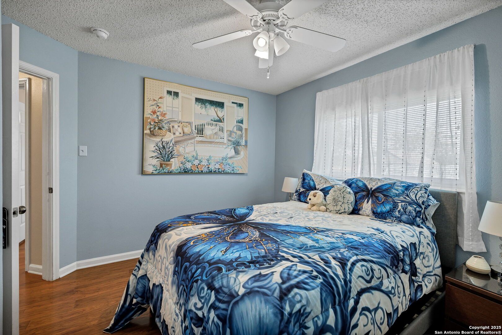 Like-new, immaculate, and move-in ready! This charming 3 BR/2 BA, 1,389 sq ft home has been meticulously cared for. Surrounded by lush landscaping and large shade trees, it offers an open, flowing floor plan with a spacious living area, hardwood floors throughout, ceiling fans, and a separate dining space. The sleek kitchen features tile flooring, stainless steel appliances, and an adjacent laundry area. The living room includes French doors with custom blinds and windows. The primary bedroom is large and boasts a custom, updated bathroom. Recent upgrades include new custom windows (2018), a new roof (2016), and a HVAC (2024). The living area opens to a private, covered side patio with a ceiling fan, leading to a spacious backyard. The property includes an oversized storage shed with electricity, all situated on a greenbelt. An outdoor seating area with a brick fire pit offers stunning views of wildlife and sunsets beyond the fence line. The insulated and organized garage is as pristine as the home, featuring added attic flooring for extra storage. If you're looking for a perfect home in an ideal location at a great price, this is it!
