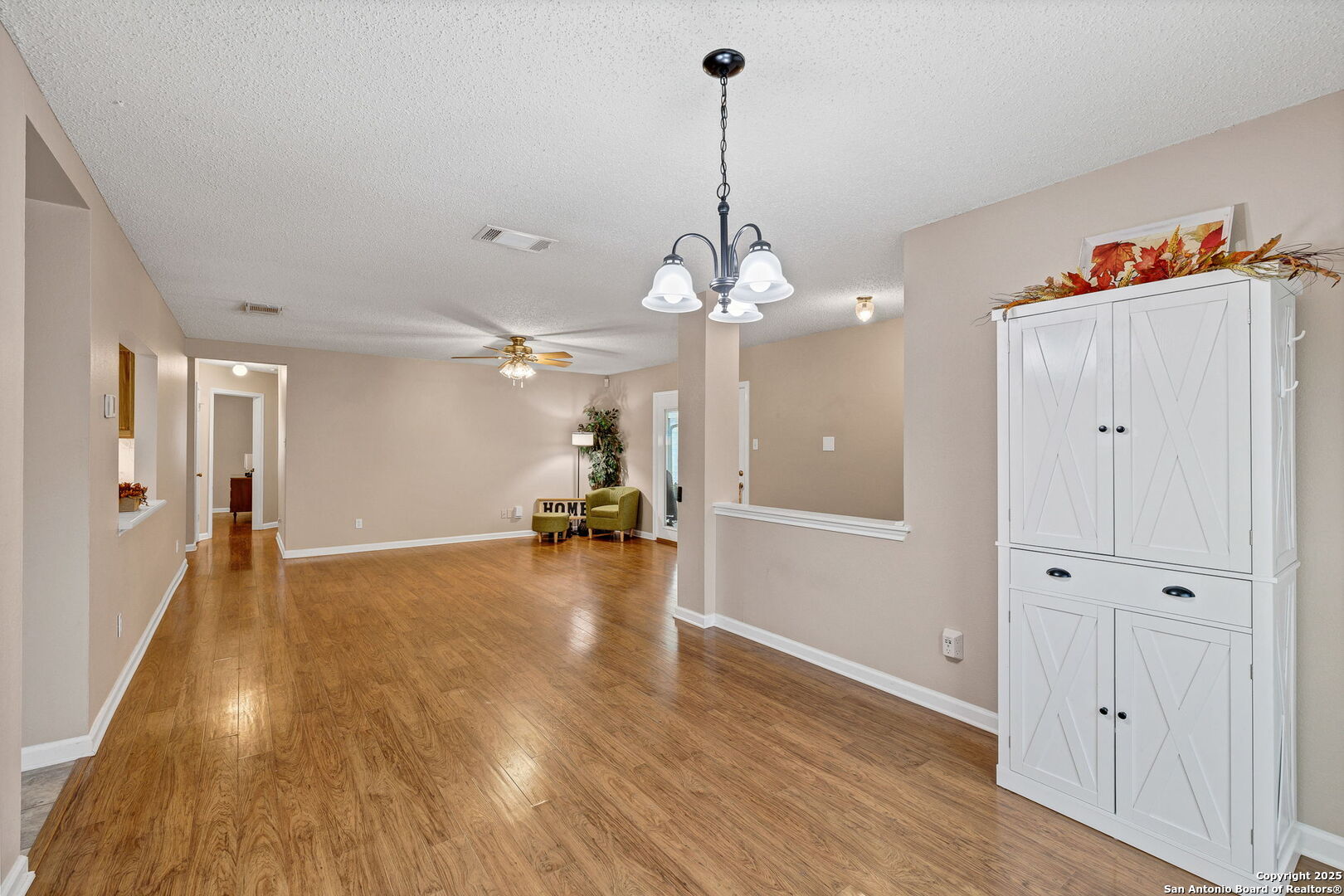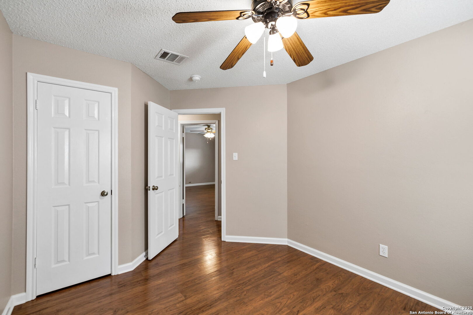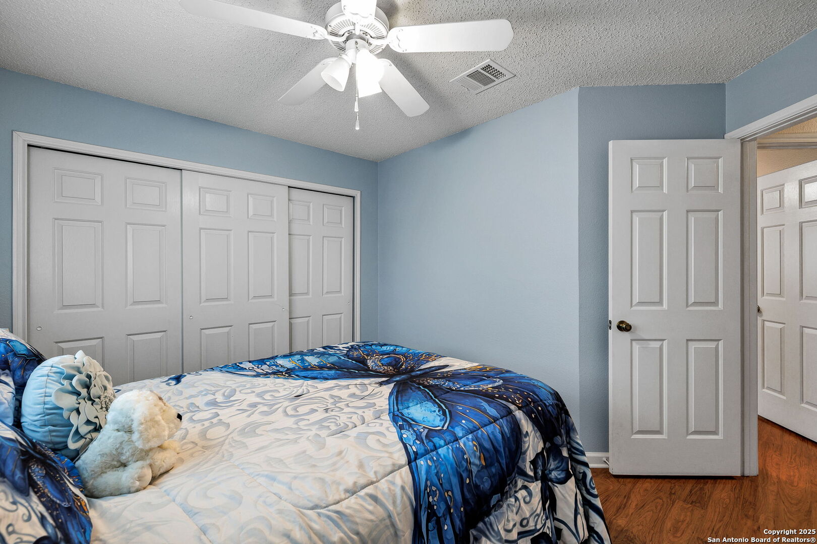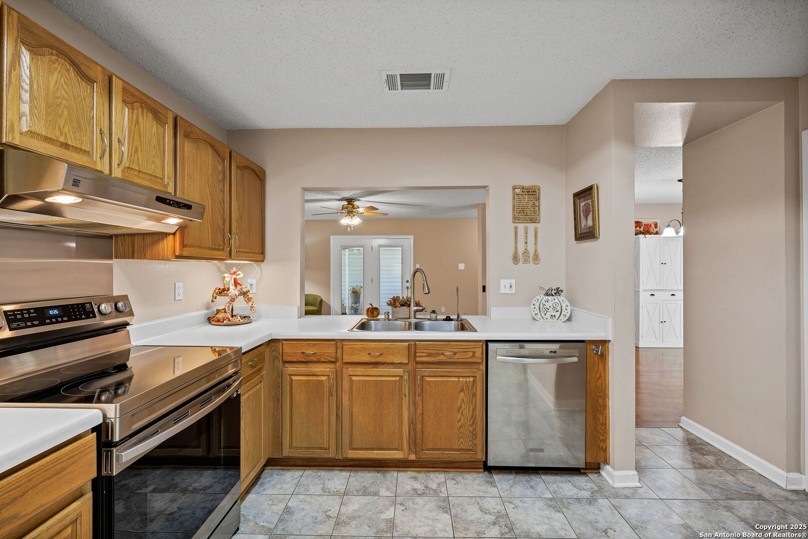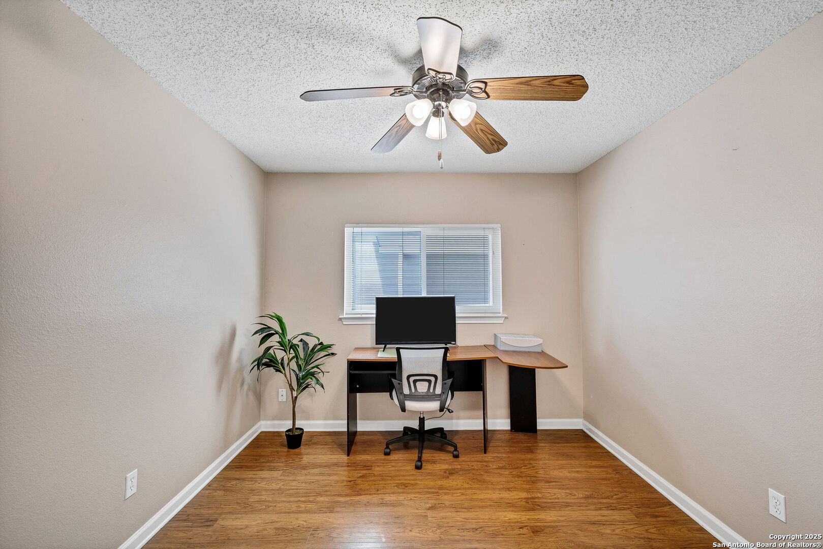 Like-new, immaculate, and move-in ready! This charming 3 BR/2 BA, 1,389 sq ft home has been meticulously cared for. Surrounded by lush landscaping and large shade trees, it offers an open, flowing floor plan with a spacious living area, hardwood floors throughout, ceiling fans, and a separate dining space. The sleek kitchen features tile flooring, stainless steel appliances, and an adjacent laundry area. The living room includes French doors with custom blinds and windows. The primary bedroom is large and boasts a custom, updated bathroom. Recent upgrades include new custom windows (2018), a new roof (2016), and a HVAC (2024). The living area opens to a private, covered side patio with a ceiling fan, leading to a spacious backyard. The property includes an oversized storage shed with electricity, all situated on a greenbelt. An outdoor seating area with a brick fire pit offers stunning views of wildlife and sunsets beyond the fence line. The insulated and organized garage is as pristine as the home, featuring added attic flooring for extra storage. If you're looking for a perfect home in an ideal location at a great price, this is it!
